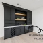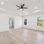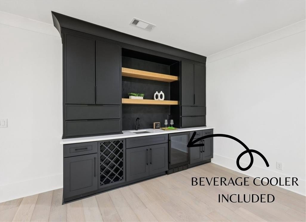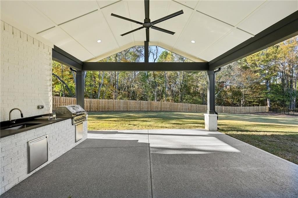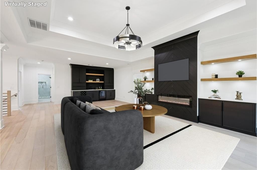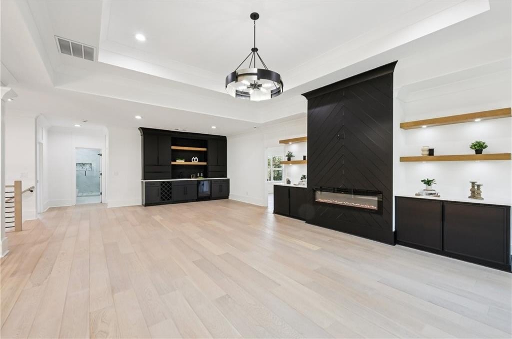 At the heart of the home, the great room features a designer fireplace framed by floating white oak shelves and custom built-ins. Expansive sliding glass doors fill the space with natural light and open to the covered patio, where an outdoor kitchen with built-in grill, sink, and space for a beverage fridge creates the perfect setting for year-round entertaining. A formal dining room nearby offers an elegant space for gatherings and special occasions.