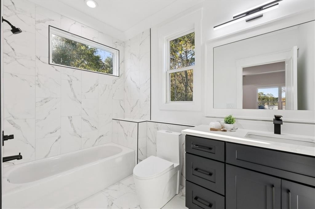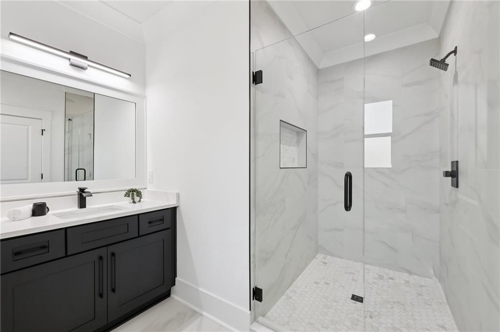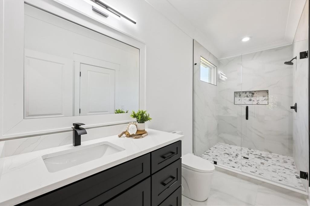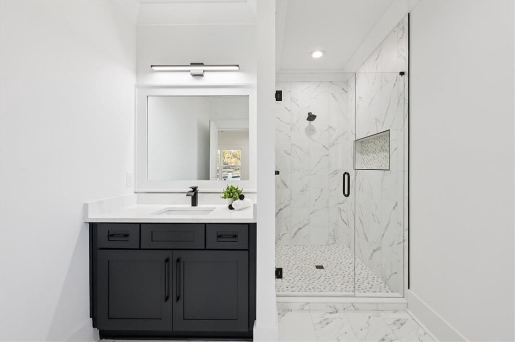 Outside, upgraded rock landscaping and a fully fenced yard framed by an upgraded metal fence complete the home’s exceptional exterior design. A beautifully tiled front porch enhances the property’s elegant curb appeal—where every detail reflects intentional design and timeless luxury.