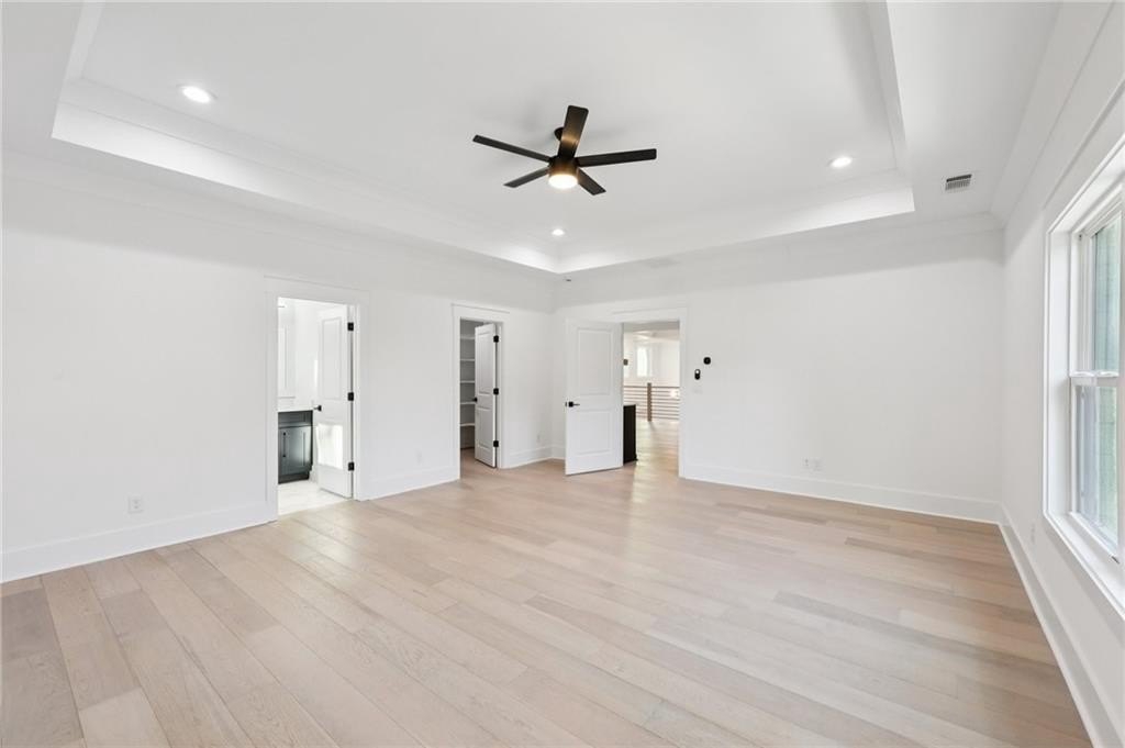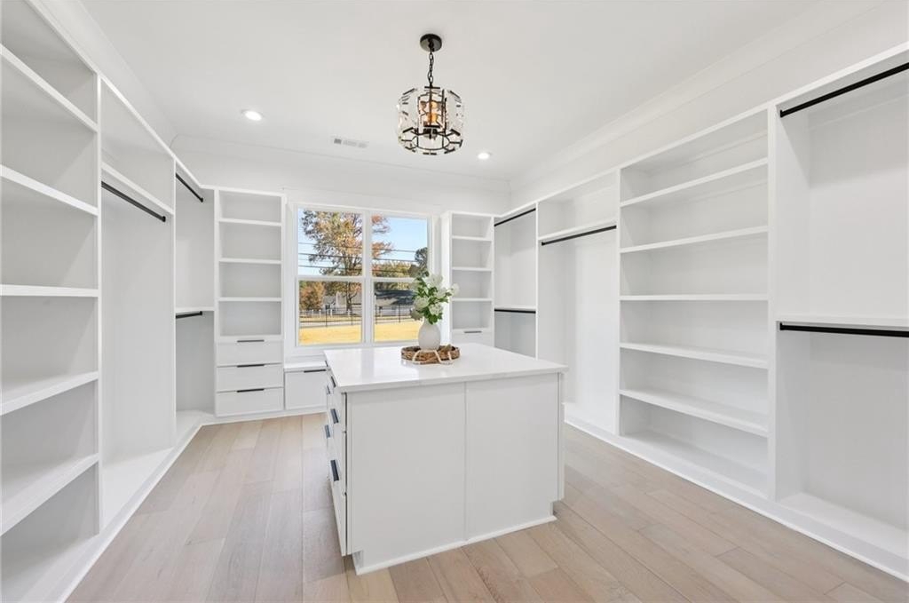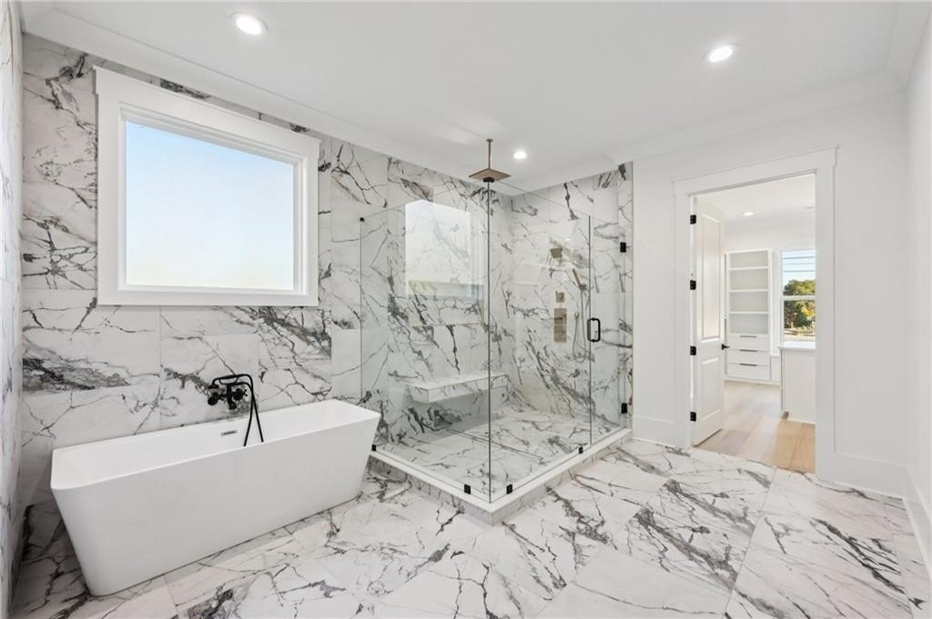 The main-level primary suite is a tranquil retreat with tray ceiling, accent wall, and a spa-inspired bath showcasing floor-to-ceiling tile, soaking tub, and an oversized shower with rain head and built-in bench. The expansive walk-in closet includes a center dresser island with quartz countertop, chandelier, and bench seating.