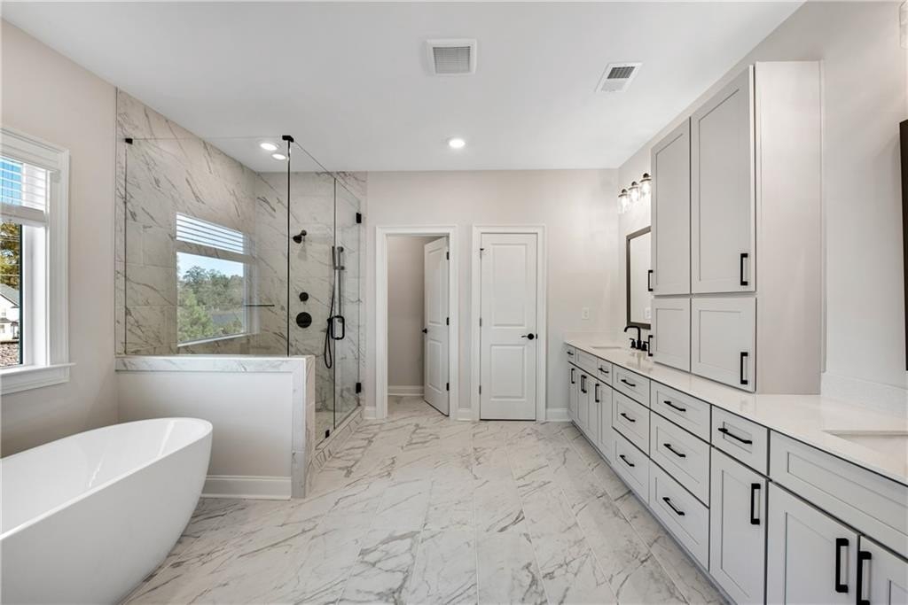 Welcome to your brand new dream home with the unique Alpharetta address, the Milton live style and low Forsyth County taxes! This curated designer home perfectly blends modern luxury and timeless elegance. With a light-filled modern farmhouse design, it showcases warm natural wood tones contrasted by sleek, sophisticated stone accents—creating a harmonious balance of comfort and style. Enjoy 10-foot ceilings on the main level, private bathrooms for every bedroom, and a convenient in-law suite on the main floor. The home features premium LVP plank flooring throughout main level and 2nd floor landing, offering both beauty and durability. Thoughtfully curated interior upgrades further elevate this residence, including a gourmet kitchen with floor to ceiling cabinetry and all the bells and whistles. The back yard features a Curated fence to maximize privacy with the addition of a landscaped view maintained by the HOA