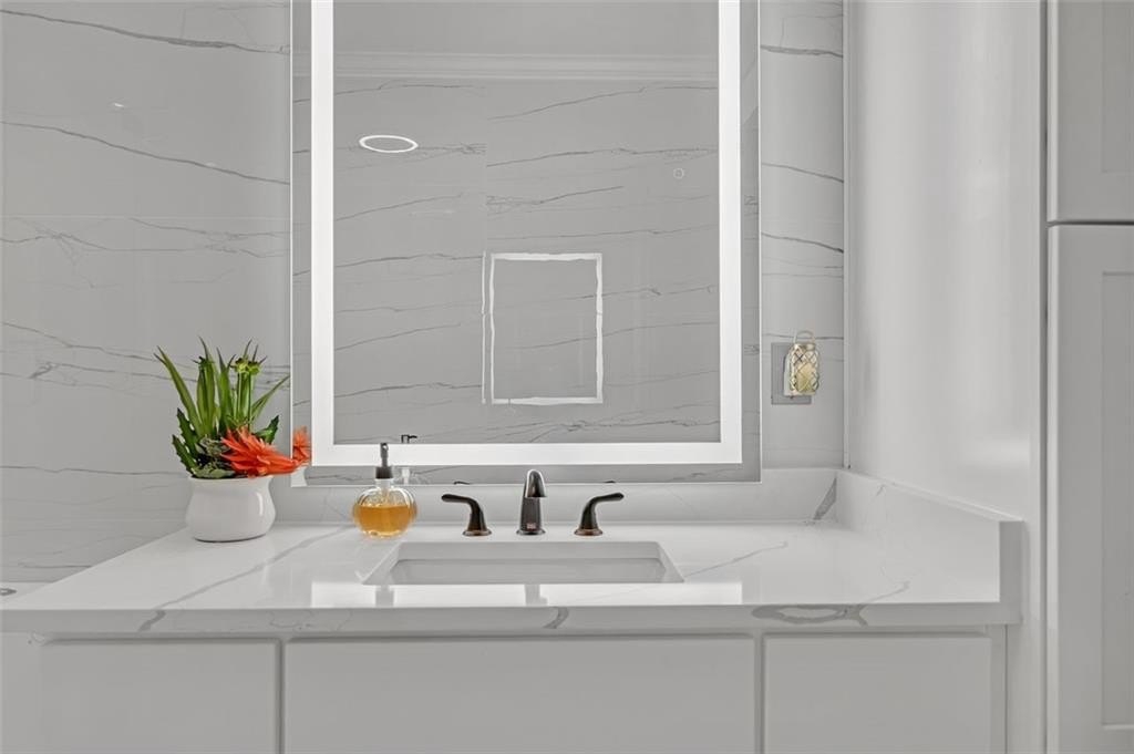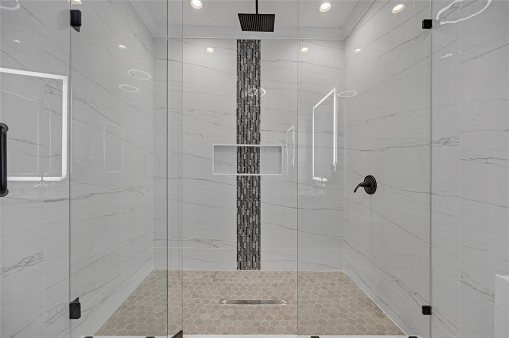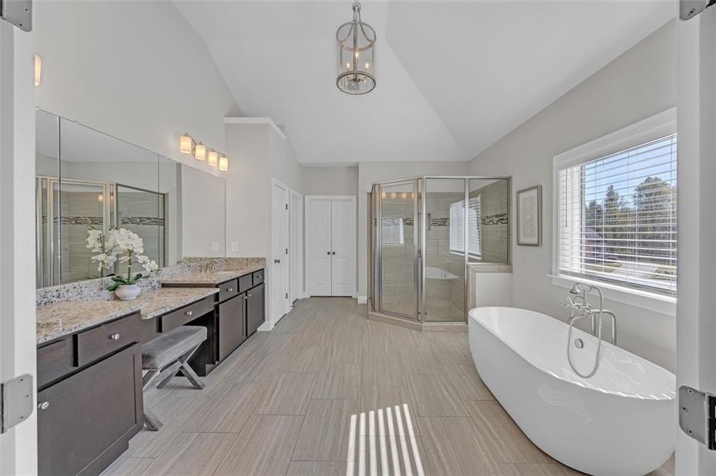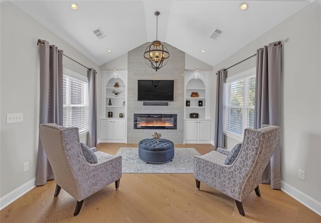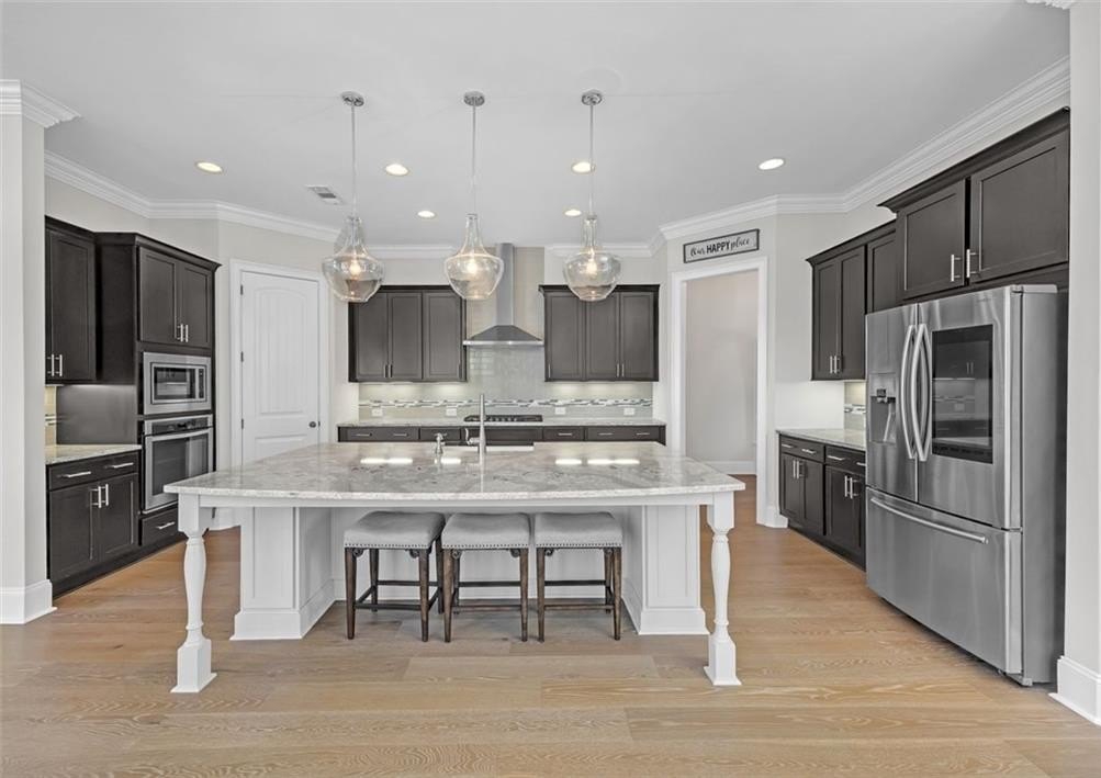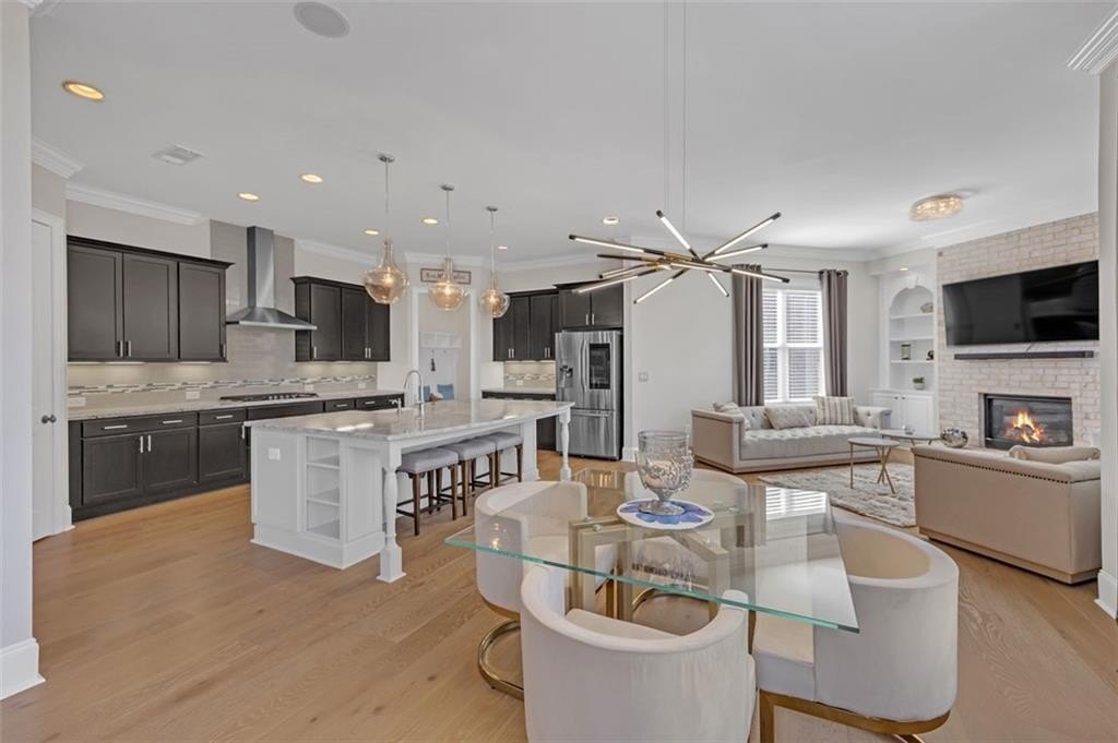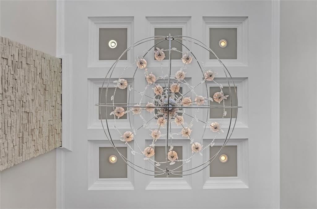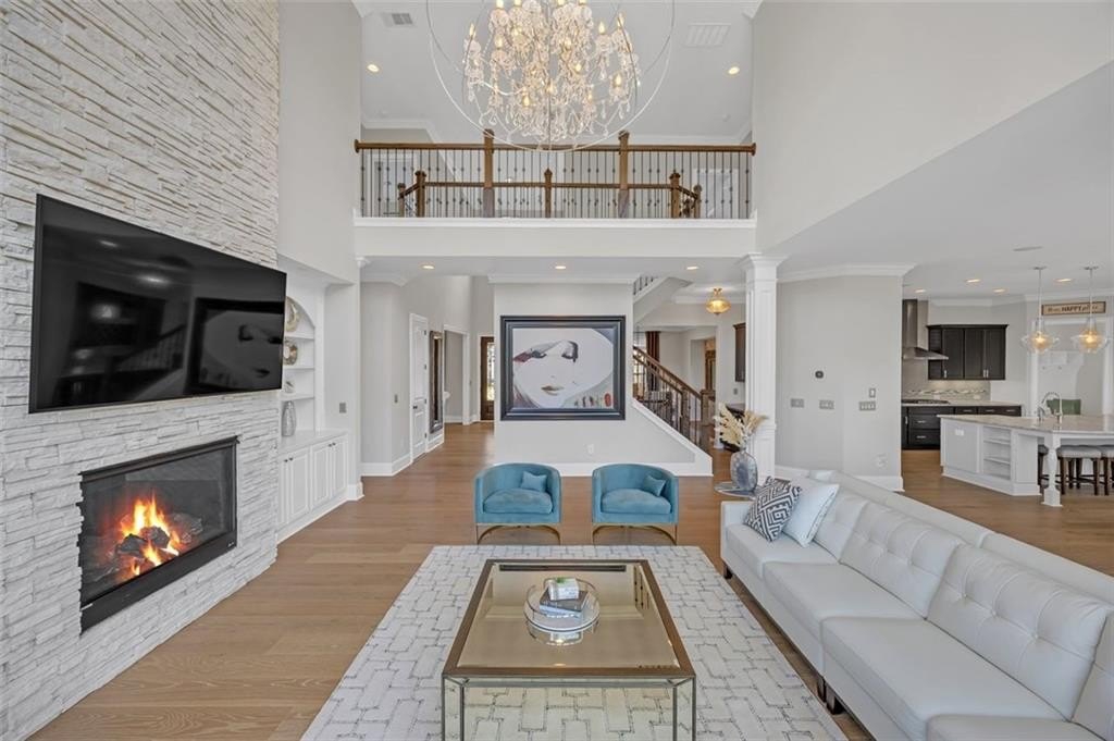 A masterpiece of custom design and grand scale, this home defines elevated luxury living. Beyond the stately double front doors, a dramatic two-story foyer unfolds, crowned by a stunning crystal chandelier that swirls gracefully from the ceiling in a cascading design. From there, you’re drawn into a breathtaking 24-foot coffered ceiling living room, where sunlight pours through a curved panorama of floor to ceiling windows, illuminating the brand new hardwood floors and a floor to ceiling stone fireplace that anchors the space in style and warmth. The open layout flows seamlessly into the gourmet chef’s kitchen, featuring sleek granite countertops, designer cabinetry, and top-of-the-line stainless steel appliances, with access to a spacious deck ideal for entertaining. Elegant crown molding and refined architectural detailing enhance the home’s sense of scale and craftsmanship. With five fireplaces, two impressive kitchens, and a main level guest suite with private ensuite, this home blends style and functionality effortlessly. The owner’s retreat is a private sanctuary with a cozy fireplace sitting area, spa inspired bathroom, and an expansive walk-in closet. The fully finished basement feels like a second home, complete with a 2nd gourmet kitchen, huge open living area, private suite, and a modern full bathroom; perfect for guests, in-laws, or entertaining in style. Meticulously maintained, energy efficient, and featuring a surround sound system and three car garage, this exceptional residence is ideally located near Halcyon, Vickery Village, top schools, and premier shopping. This one checks every box! Fall in love. Move right in!