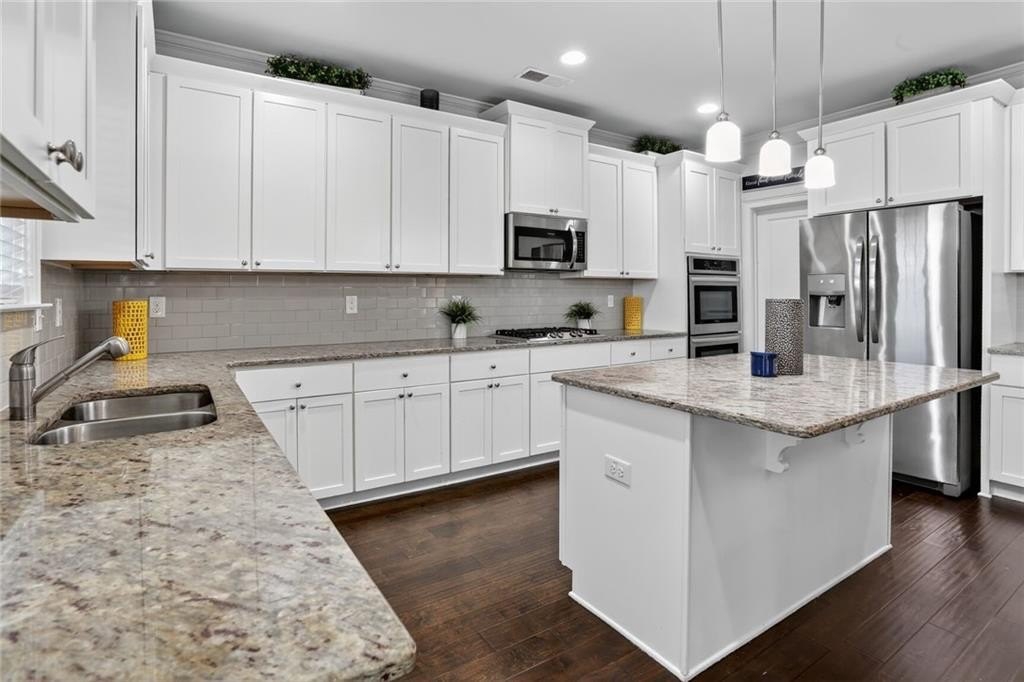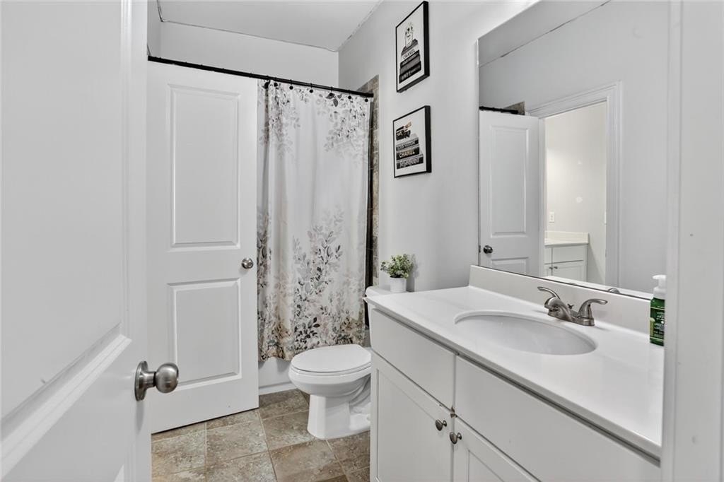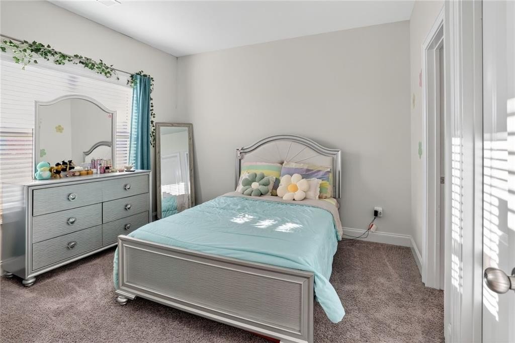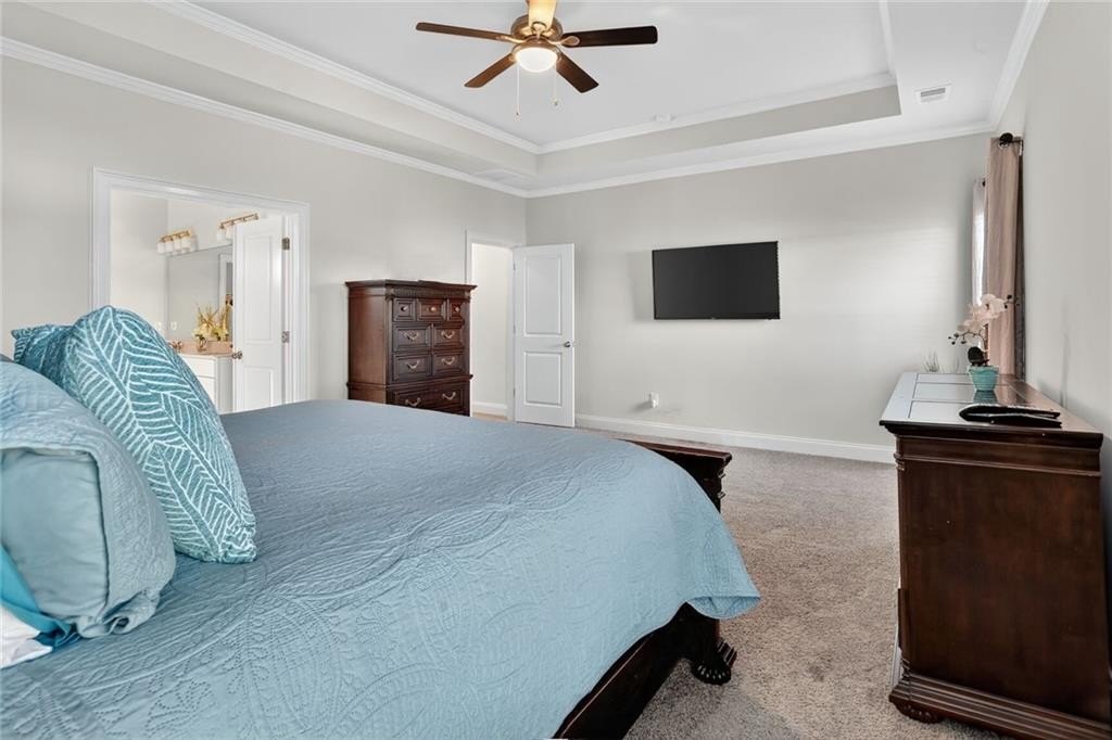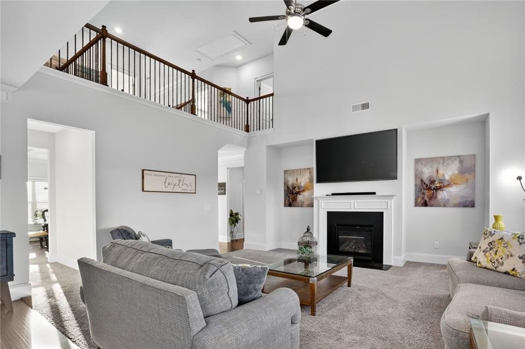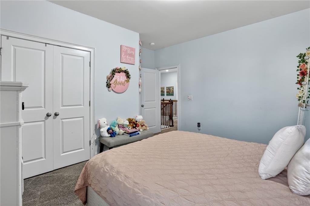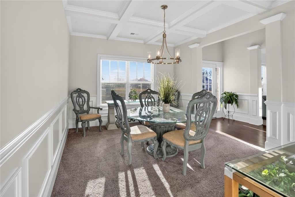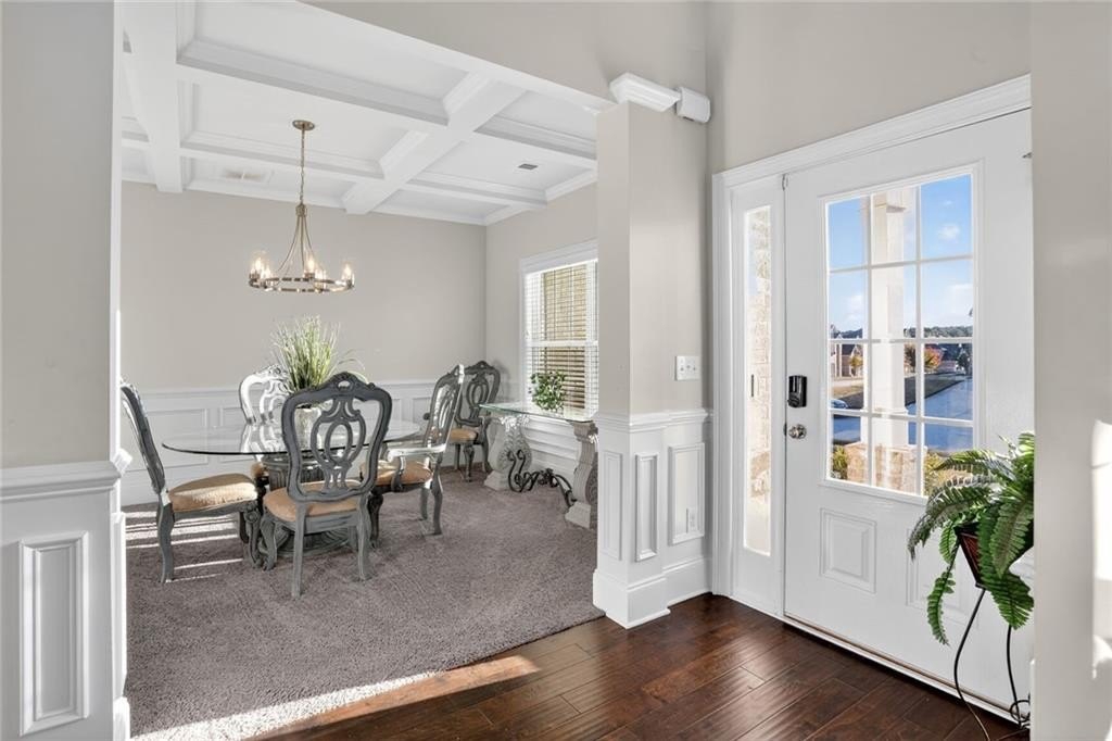 Stunning 5-Bedroom, 3-Bathroom home on a spacious Corner Lot. This beautifully maintained 4-sided brick home is located in a highly sought-after and well-kept neighborhood. Two-story foyer with hardwood floors leading to a formal dining room with coffered ceilings and a flex living room that can serve as an office. Open-concept design with gourmet kitchen featuring granite countertops, white cabinetry, stainless steel appliances, double ovens, a gas cooktop, island, and a walk-in pantry with views to a spacious two-story family room with large windows with abundant natural light and fire fireplace. Guest suite with a full bath on the main level, perfect for visitors or multi-generational living. Upstairs, the oversized primary suite. Primary bath includes a huge tiled shower, double vanities, and a huge walk-in closet. Three additional bedrooms share a Jack-and-Jill bath, plus an upstairs laundry room. Enjoy outdoor living on the covered back patio with a mounted TV, or unwind on the welcoming front porch. The side-entry two-car garage includes an electric car charger plug and plenty of storage space. Conveniently located near Cherokee Run Golf Club, I-20, shopping, dining, schools, and more.