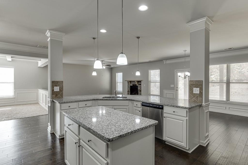 Enjoy a grand 2-story foyer, formal living and dining rooms with coffered ceilings, and a large open kitchen with white cabinetry, granite countertops, and a walk-in pantry. The kitchen flows seamlessly into the family room with a cozy fireplace, perfect for entertaining or everyday living.