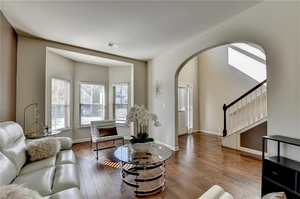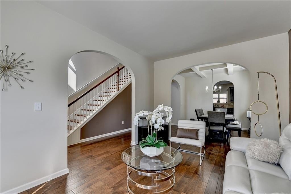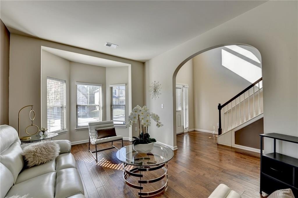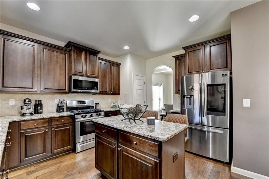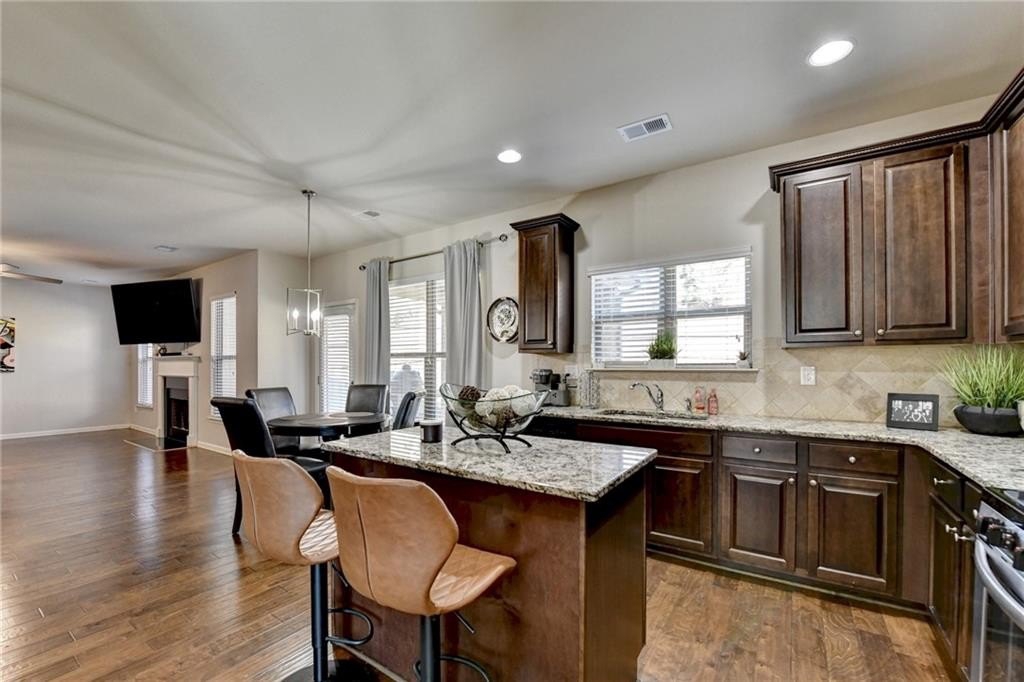 This home features a spacious, open-concept design with coffered ceilings, arched passageways, wood spindle stair railings, and hand-scraped hardwood floors. The expansive kitchen offers granite countertops, a large island, and generous counter space — all open to the family room with fireplace. The owner’s suite is oversized, providing plenty of room to relax and unwind.