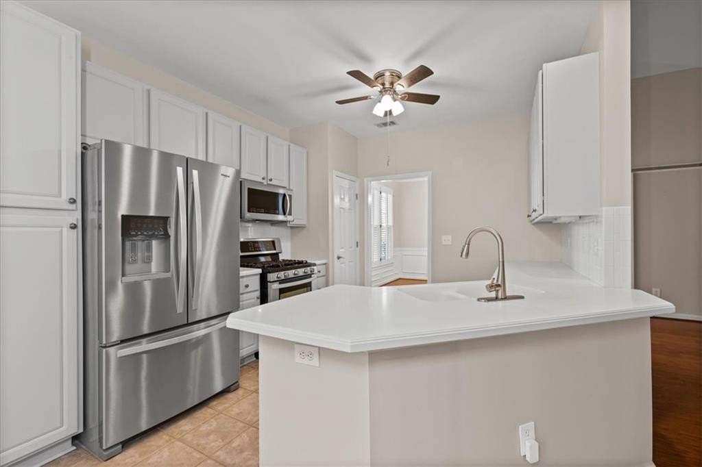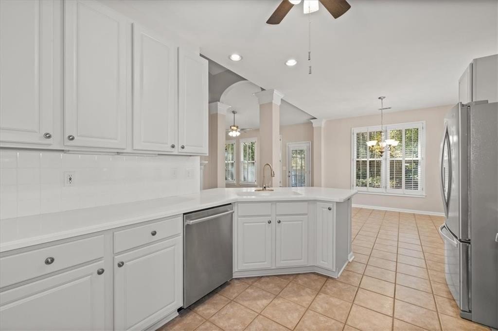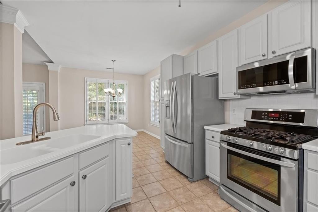 The kitchen offers stainless-steel appliances, abundant counter space, solid-surface countertops, and a sunlit breakfast area.