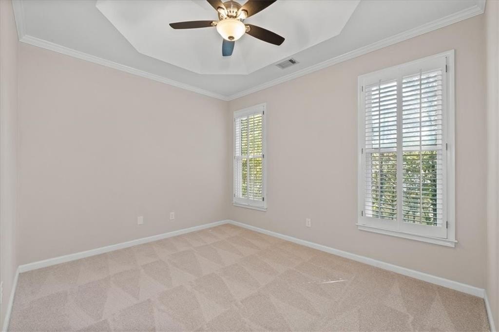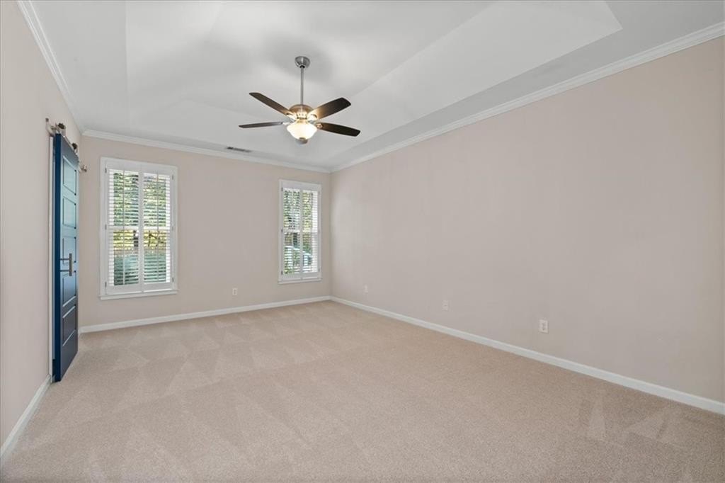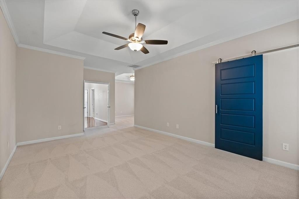 Retreat to the oversized primary suite, an oasis complete with a sitting room and elevated tray ceilings. The spa-like primary bath features a double vanity, a separate shower, a relaxing soaking tub, and a spacious walk-in closet. Two additional bedrooms, featuring brand-new carpet, and a full secondary bath offer comfortable accommodations for family and guests.
