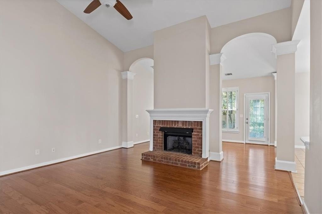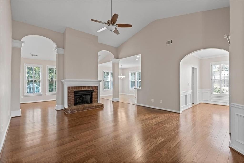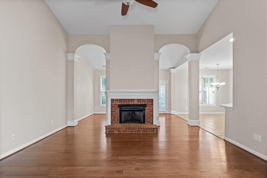 Step inside to an inviting, open-concept floor plan where gleaming hardwood floors guide you through the main living and dining areas. The space is both warm and expansive, featuring high ceilings and a classic brick fireplace as its focal point. Plantation shutters adorn the windows throughout, lending an air of timeless elegance.