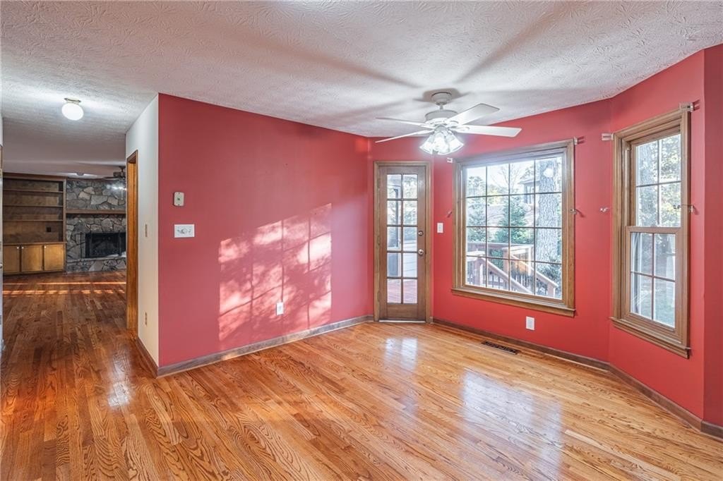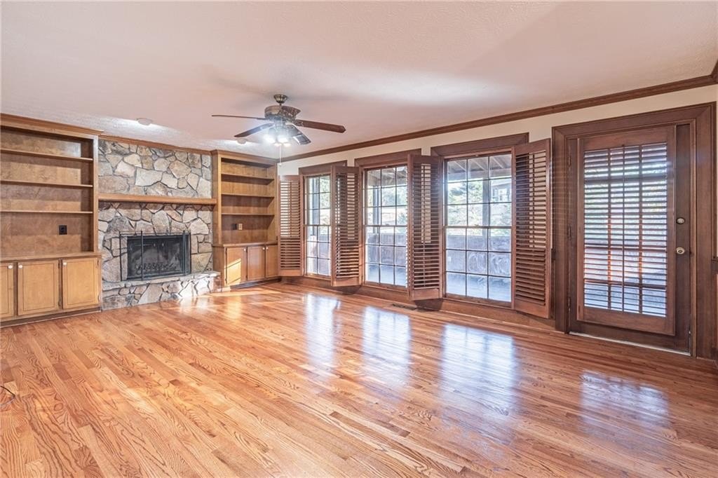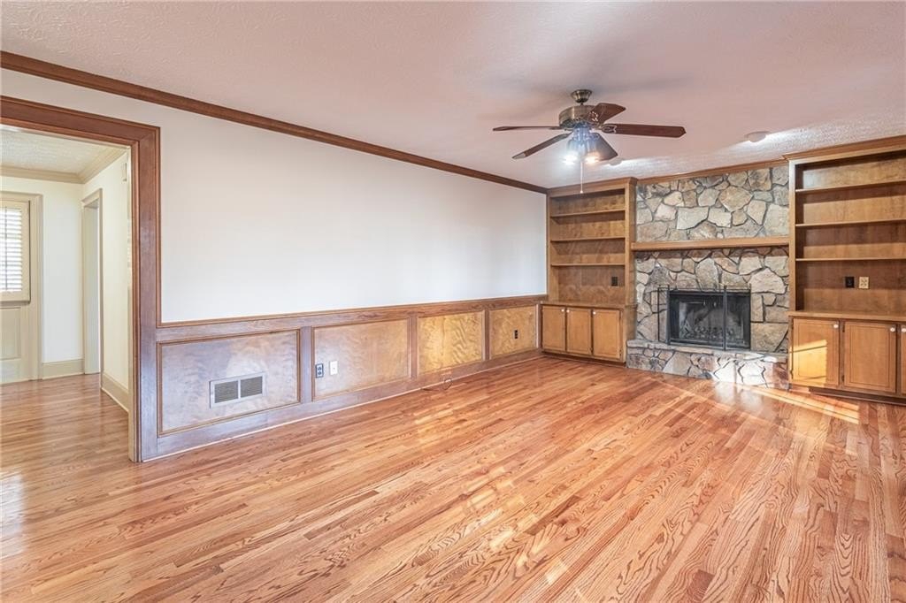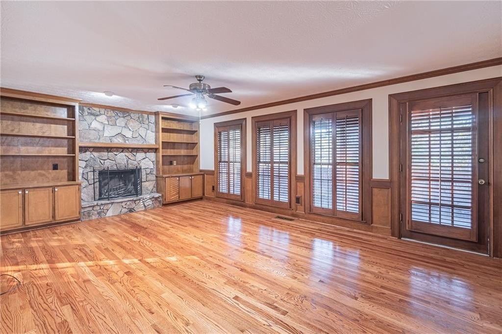 This home exudes warmth and timeless charm, featuring newer hardwood floors throughout the main level and a spacious great room highlighted by a stone fireplace, built-in bookshelves, and plantation shutters. The inviting floor plan includes a secondary living space perfect for a formal living room or home office, a large separate dining room with seating for 12, and a bright kitchen with granite countertops and backsplash, stained cabinetry, updated stainless steel appliances, and a charming bay window breakfast area.