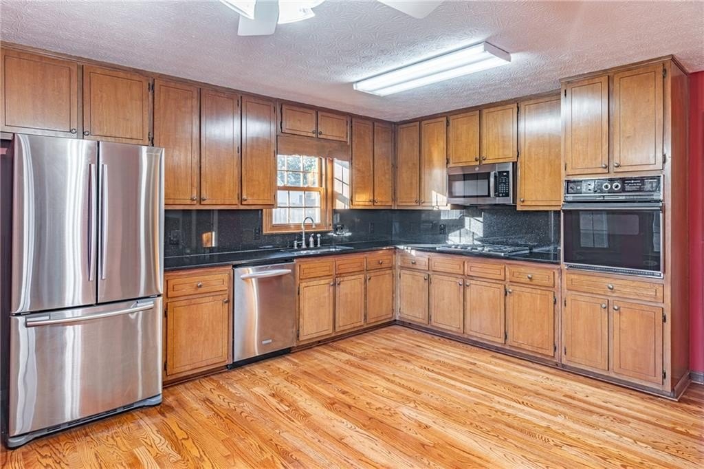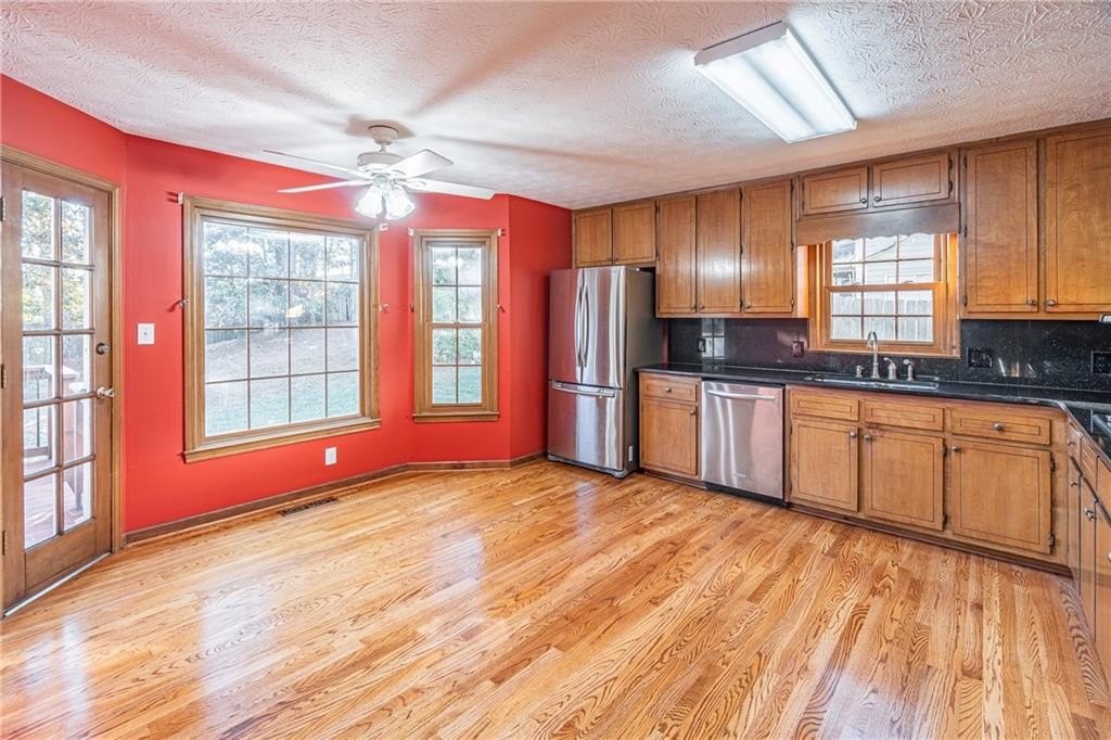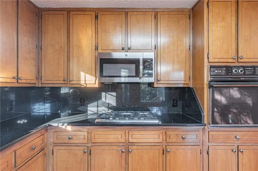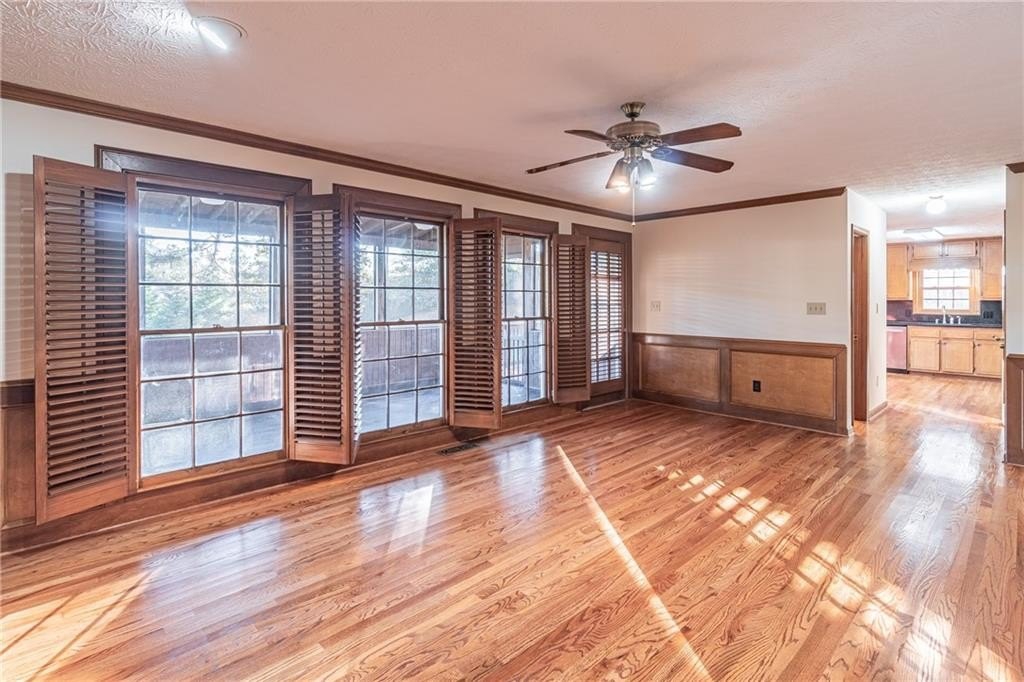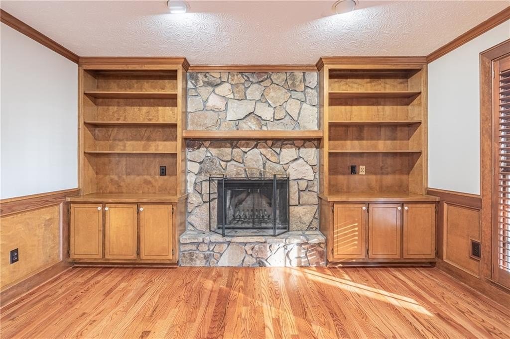 This home exudes warmth and timeless charm, featuring newer hardwood floors throughout the main level and a spacious great room highlighted by a stone fireplace, built-in bookshelves, and plantation shutters. The inviting floor plan includes a secondary living space perfect for a formal living room or home office, a large separate dining room with seating for 12, and a bright kitchen with granite countertops and backsplash, stained cabinetry, updated stainless steel appliances, and a charming bay window breakfast area.