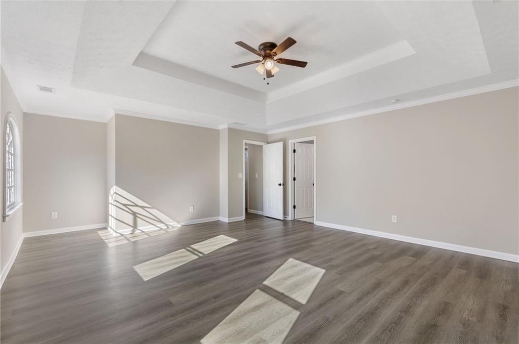 THE UPPER LEVEL OFFERS A LUXURIOUS MASTER SUITE WITH TREY CEILING, WALK-IN CLOSETS, A SOAKING TUB, AND SEPARATE SHOWER, PLUS 3 ADDITIONAL BEDROOMS AND A FULL BATH.