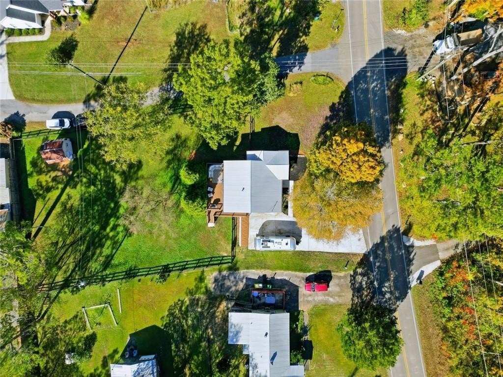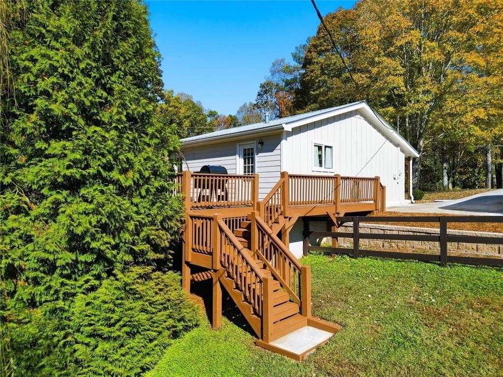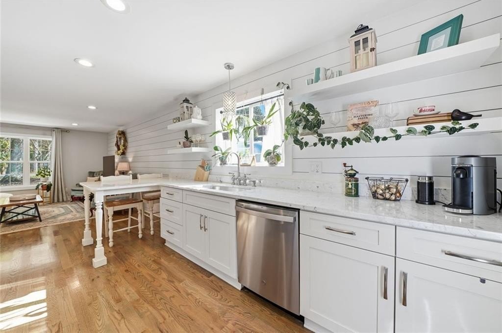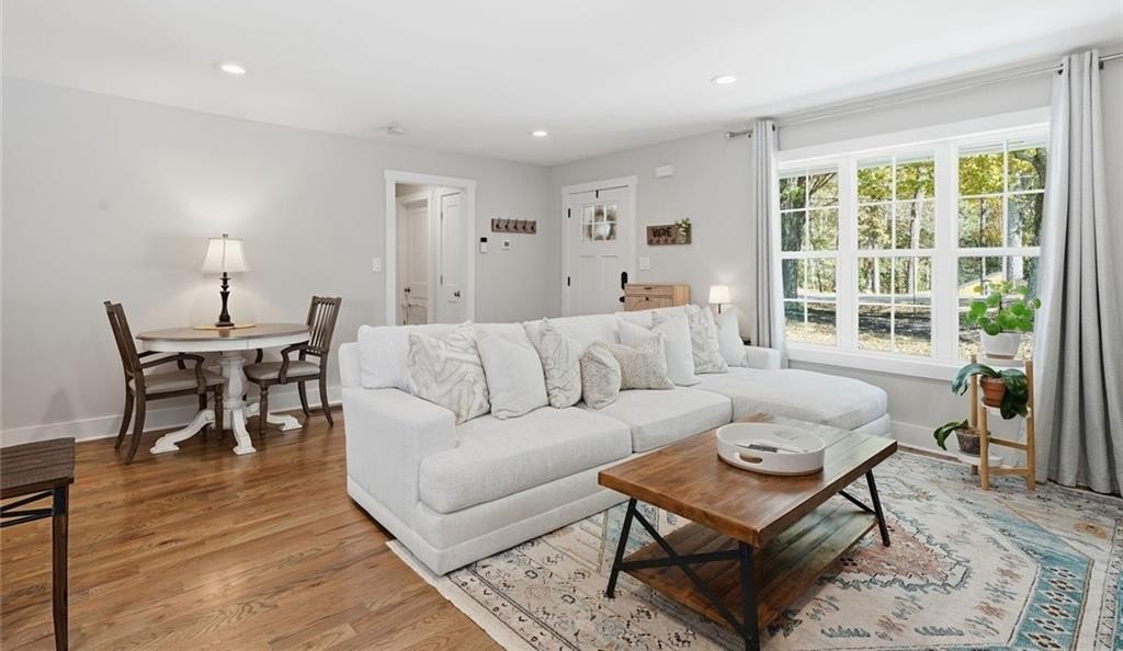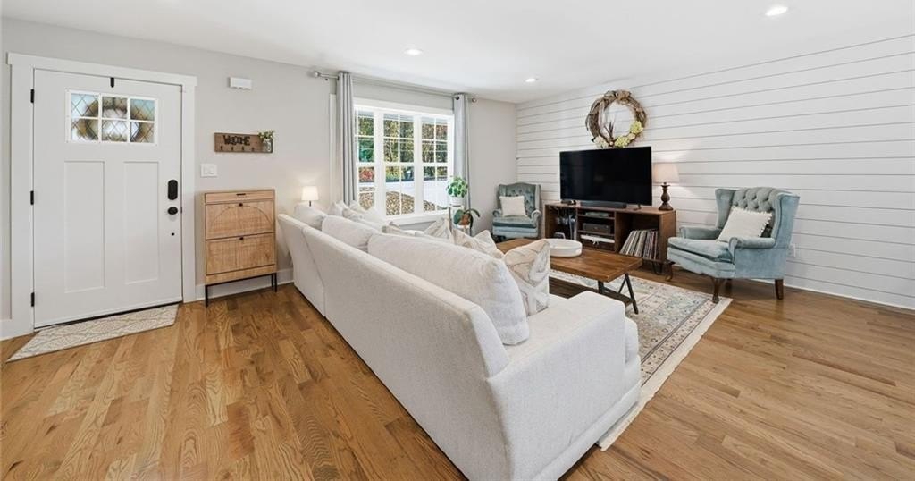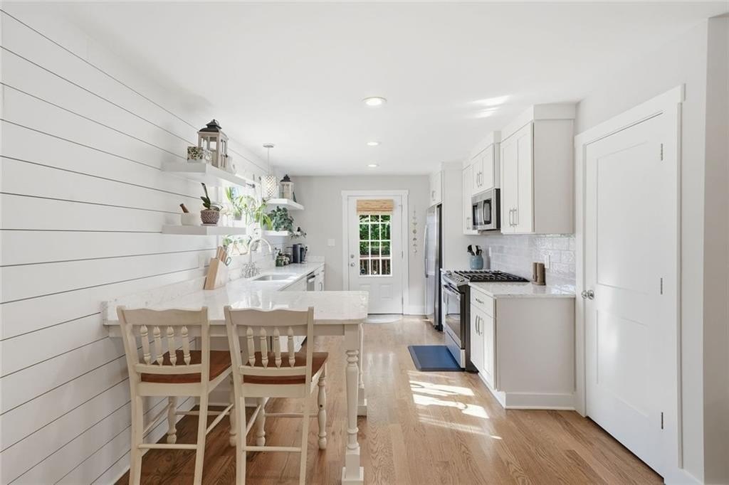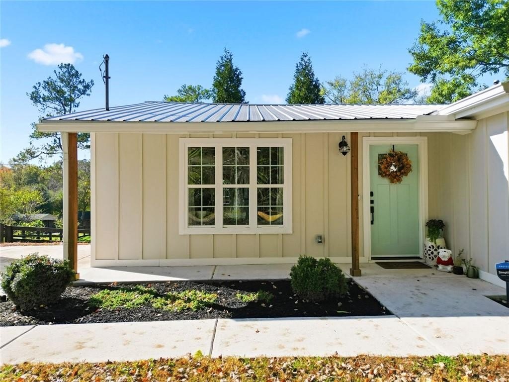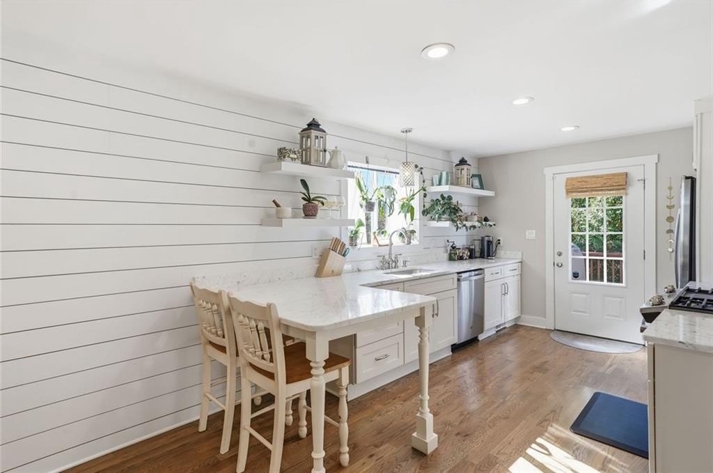 Step inside this thoughtfully rebuilt ranch and enjoy single-level living with smart, stylish finishes throughout, all set on a spacious half-acre lot with a metal roof and modern curb appeal. At the heart of the home, the open-concept living area is bright and welcoming, centered around a custom kitchen designed for both ease and style. Premium white Carrera marble countertops (with lifetime warranty), open shelving, tile backsplash, and soft-close cabinetry frame stainless steel GE appliances. A deep pantry, farmhouse light fixtures, and a breakfast bar create space to prep, gather, and unwind. Real hardwood floors run throughout, while recessed LED lighting and Lutron dimmer switches in the main living areas and bedrooms give you full control over the ambiance. The primary bedroom feels like a private retreat with its shiplap accent wall and French doors leading to the oversized back deck, recently stained with IR-reflective stain and now with added stairs for easy backyard access. The en suite bathroom features a walk-in shower with new glass enclosure, marble counters, dual sinks, and a sliding barn door. The second bedroom is light-filled and close to a hall bath with a full tub and sleek tile finishes. Out back, the large fenced yard offers privacy and plenty of room to garden, host, or recharge. A new stone retaining wall adds structure near the end of the driveway, and the walk-in crawlspace gives you dry, covered storage. There’s also a large shed, and room to park an RV. Additional features include a 2021 water heater and septic tank cap, SimpliSafe home security system with doorbell cam and keypad lock, spray foam attic insulation, and a termite plan with Sentricon bait stations. Trees and debris have been cleared for cleaner lines and better use of space. Taken down to the studs and fully rebuilt in 2020, this home is move-in ready and made for living.