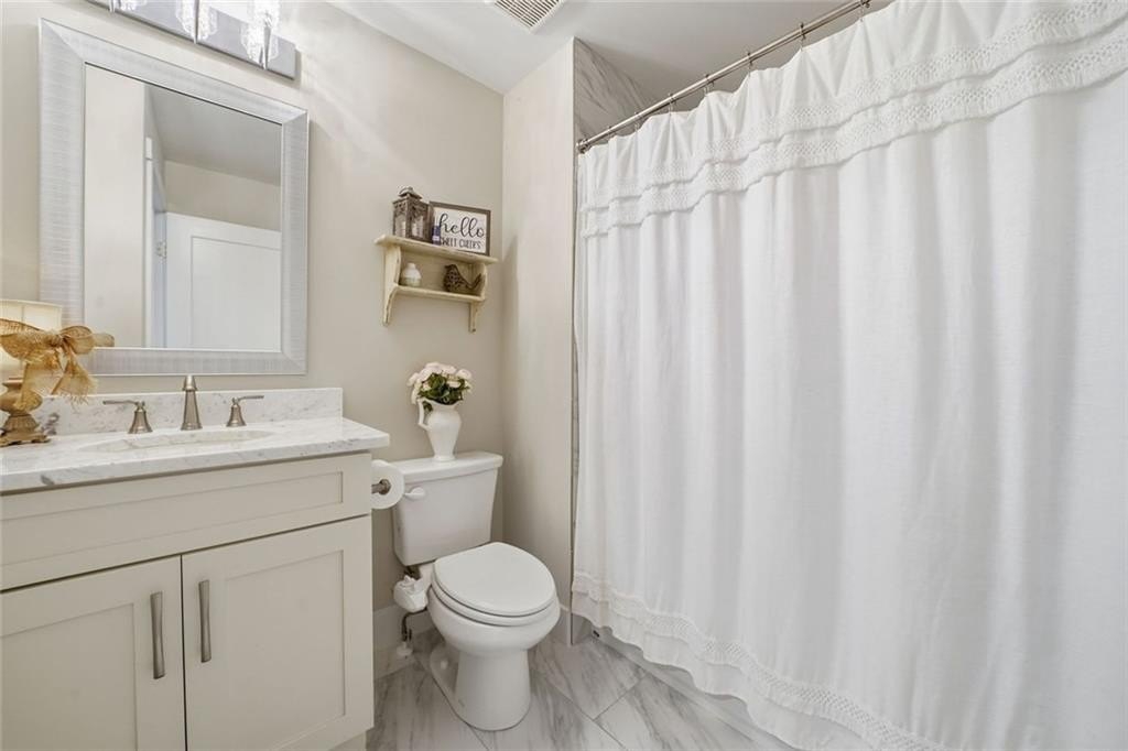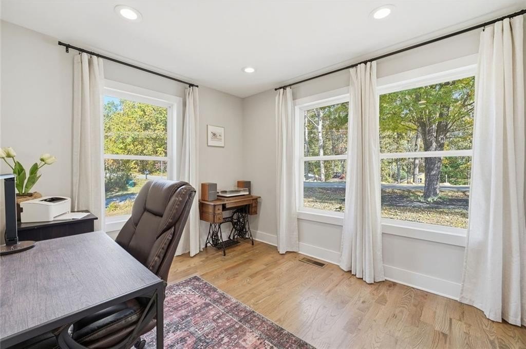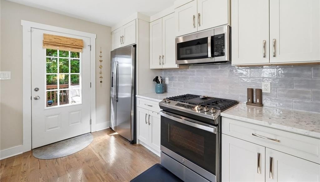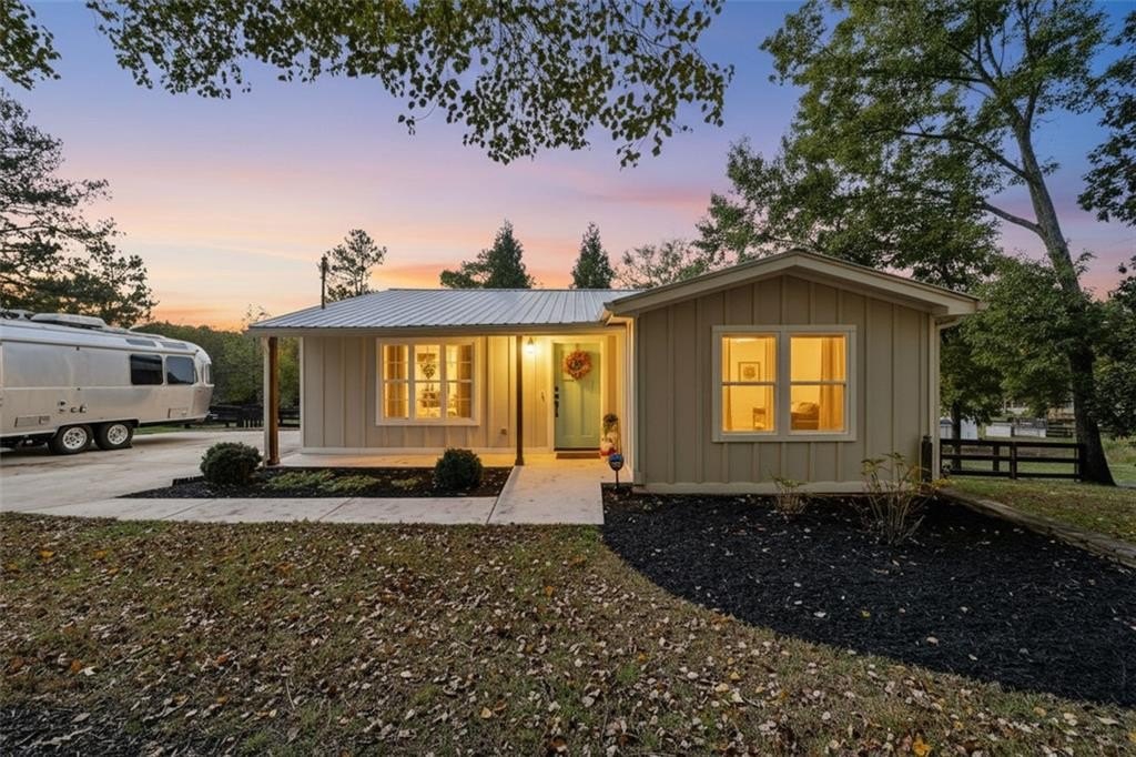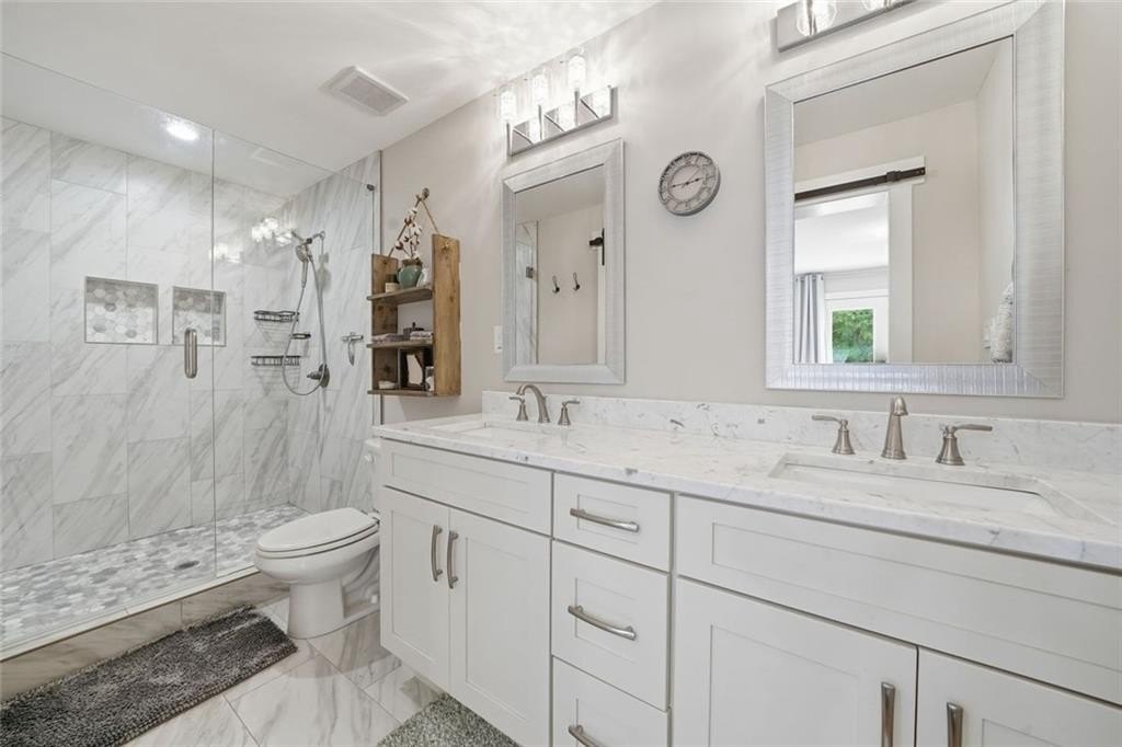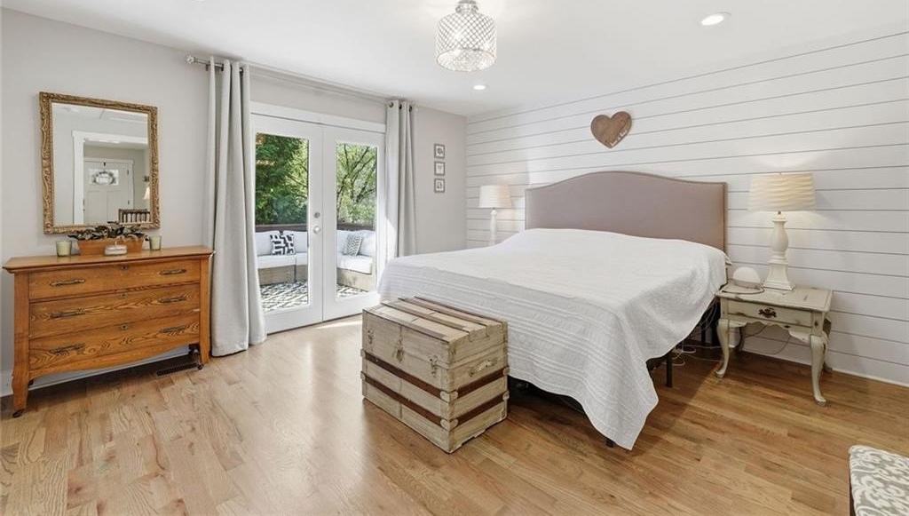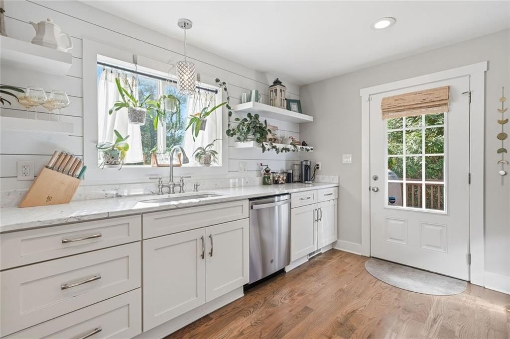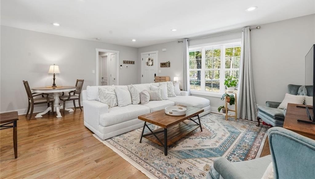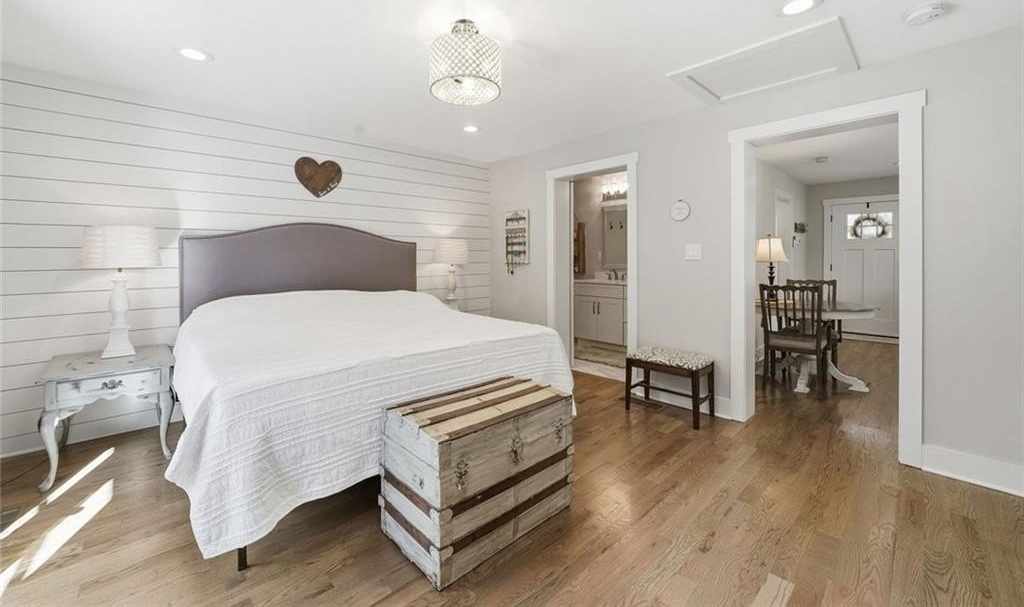 Step inside this thoughtfully rebuilt ranch and enjoy single-level living with smart, stylish finishes throughout, all set on a spacious half-acre lot with a metal roof and modern curb appeal. At the heart of the home, the open-concept living area is bright and welcoming, centered around a custom kitchen designed for both ease and style. Premium white Carrera marble countertops (with lifetime warranty), open shelving, tile backsplash, and soft-close cabinetry frame stainless steel GE appliances. A deep pantry, farmhouse light fixtures, and a breakfast bar create space to prep, gather, and unwind. Real hardwood floors run throughout, while recessed LED lighting and Lutron dimmer switches in the main living areas and bedrooms give you full control over the ambiance. The primary bedroom feels like a private retreat with its shiplap accent wall and French doors leading to the oversized back deck, recently stained with IR-reflective stain and now with added stairs for easy backyard access. The en suite bathroom features a walk-in shower with new glass enclosure, marble counters, dual sinks, and a sliding barn door. The second bedroom is light-filled and close to a hall bath with a full tub and sleek tile finishes. Out back, the large fenced yard offers privacy and plenty of room to garden, host, or recharge. A new stone retaining wall adds structure near the end of the driveway, and the walk-in crawlspace gives you dry, covered storage. There’s also a large shed, and room to park an RV. Additional features include a 2021 water heater and septic tank cap, SimpliSafe home security system with doorbell cam and keypad lock, spray foam attic insulation, and a termite plan with Sentricon bait stations. Trees and debris have been cleared for cleaner lines and better use of space. Taken down to the studs and fully rebuilt in 2020, this home is move-in ready and made for living.