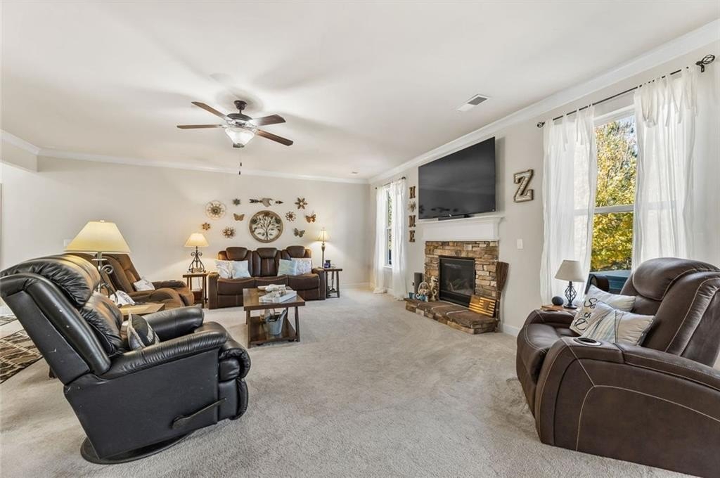 Welcome to 2962 Canyon Glen Way, a stunning 5-bedroom, 4.5-bathroom home featuring a 3-car garage and a dedicated home office — perfectly blending elegance, space, and functionality in one of Dacula’s most desirable neighborhoods. Step into a grand two-story foyer that opens to an inviting floor plan designed for modern living. The main level features a private office, a formal dining room, and a spacious family room with a cozy fireplace that flows seamlessly into the gourmet kitchen. The kitchen is a chef’s dream, offering granite countertops, stainless steel appliances, a walk-in pantry, tile backsplash, and a large island ideal for entertaining. A guest suite with a private bath on the main floor adds comfort and flexibility for visitors. Upstairs, retreat to the owner’s suite, showcasing a spa-inspired bath with double vanities, soaking tub, separate shower, and a large walk-in closet. Four additional bedrooms, including one with an ensuite bath and two sharing a Jack-and-Jill, offer plenty of space for family and guests. A spacious loft/media area provides extra room for relaxation or play. Enjoy outdoor living on the covered patio overlooking the private fenced backyard, perfect for gatherings or quiet evenings. The 3-car garage provides ample storage and parking. Located in a quiet, well-maintained community close to schools, parks, and shopping — this home delivers the perfect balance of comfort, design, and convenience.