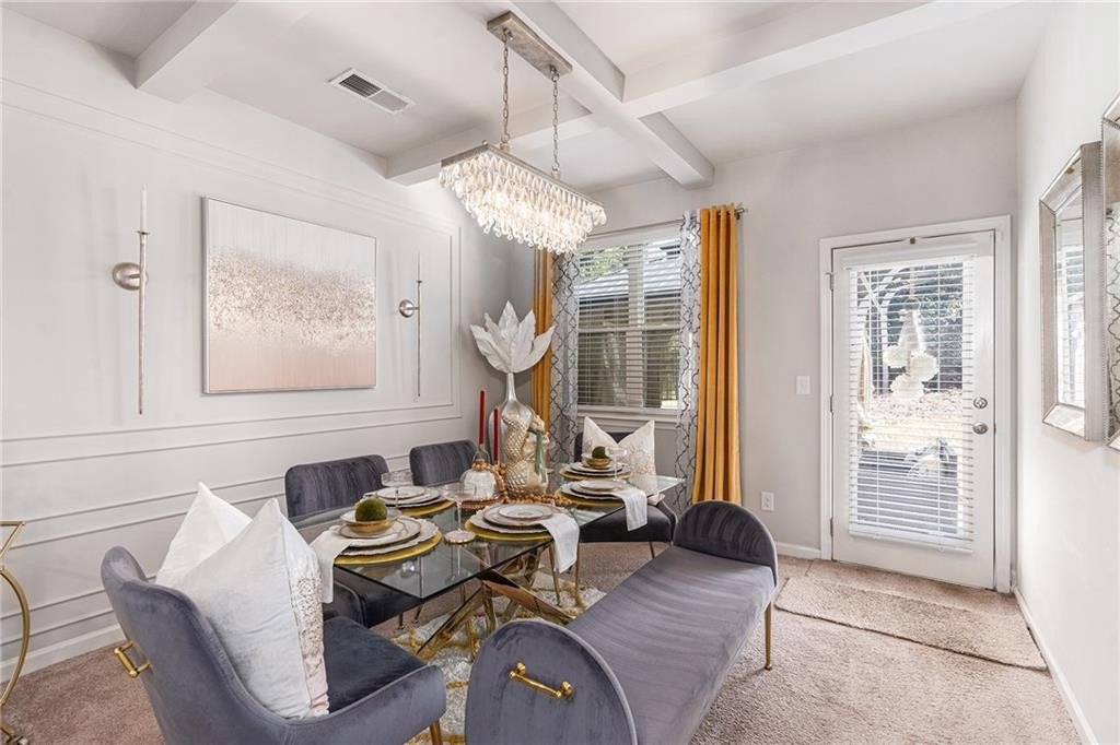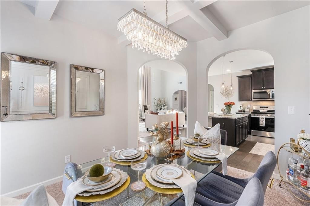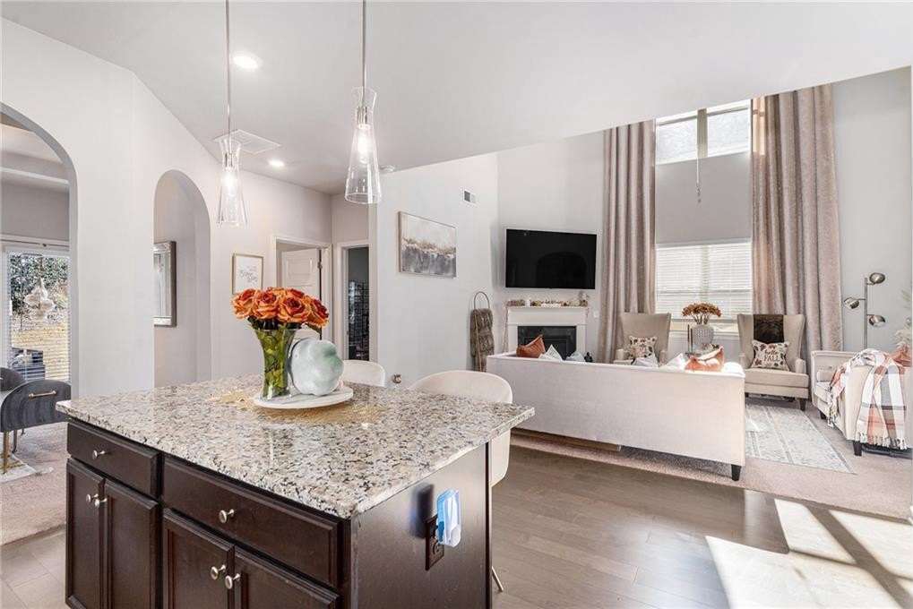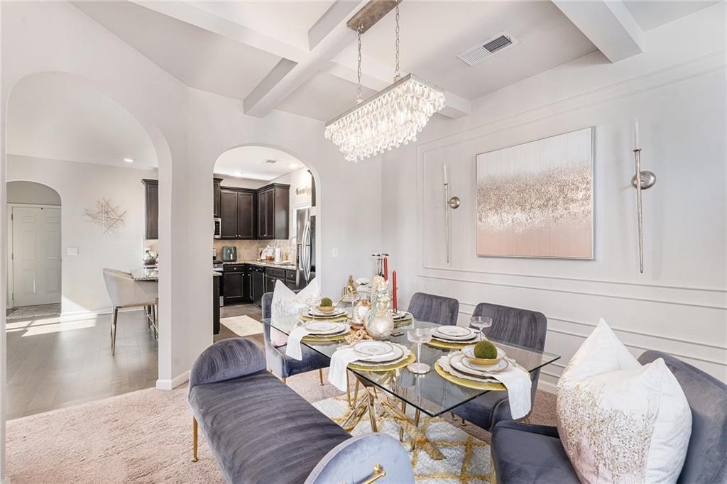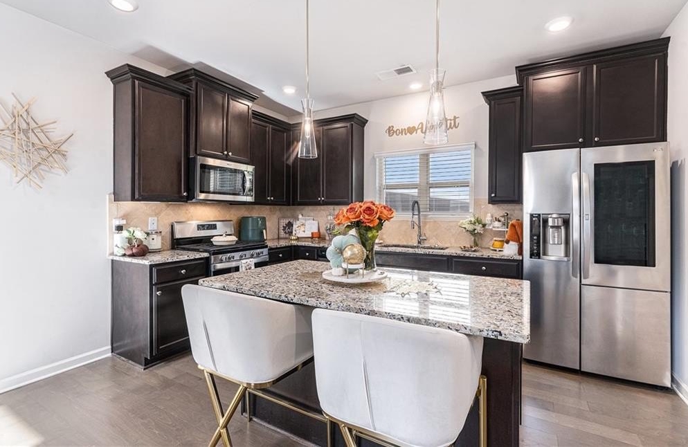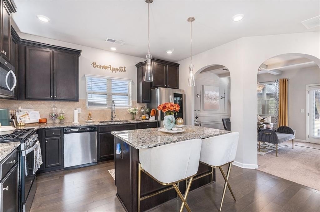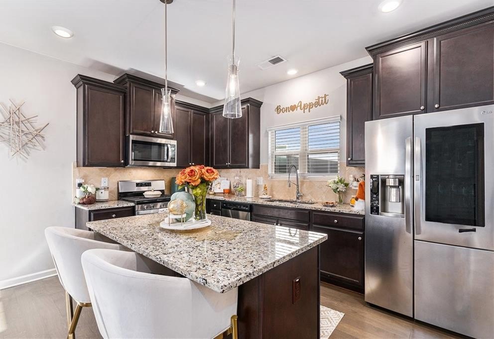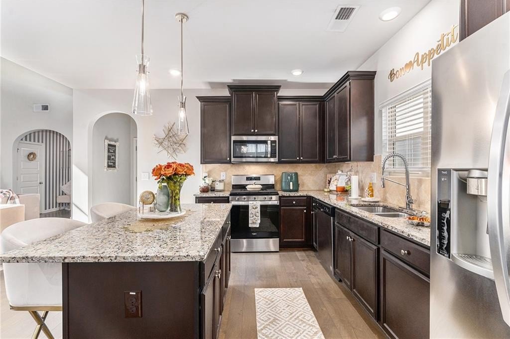 The kitchen is designed for both style and functionality, featuring granite countertops, a gas stove, and a separate dining area ideal for family gatherings or entertaining guests.