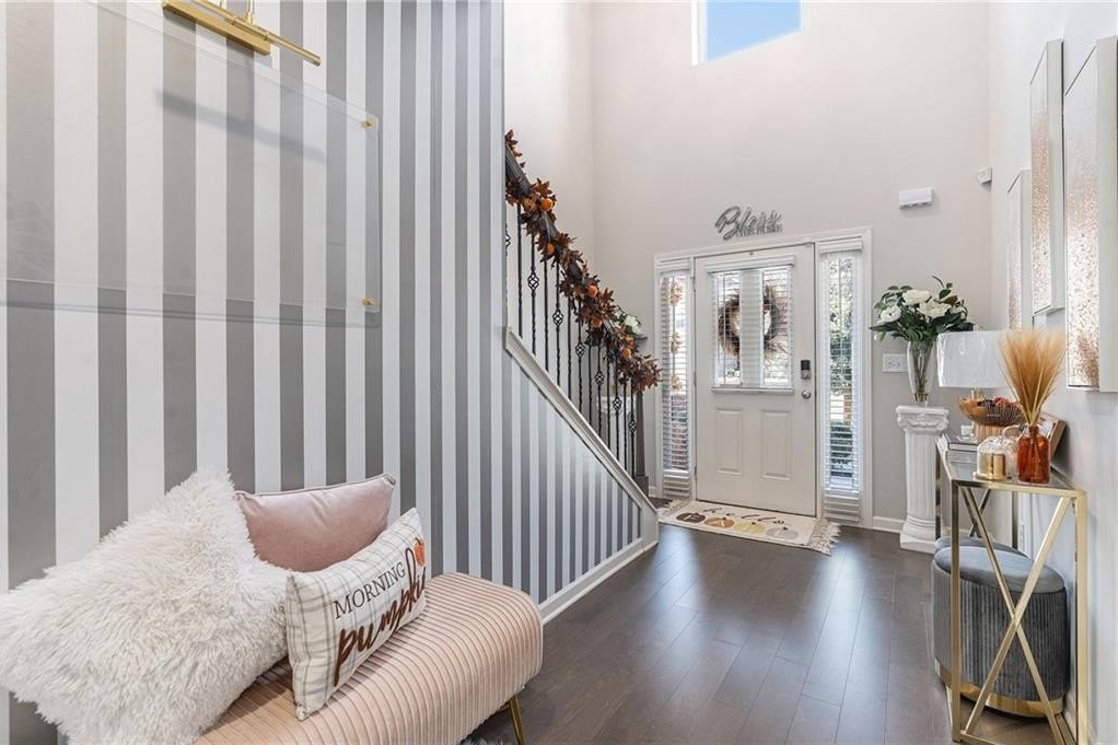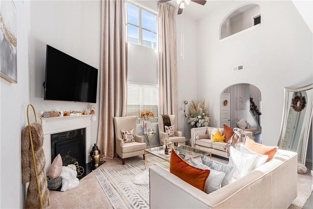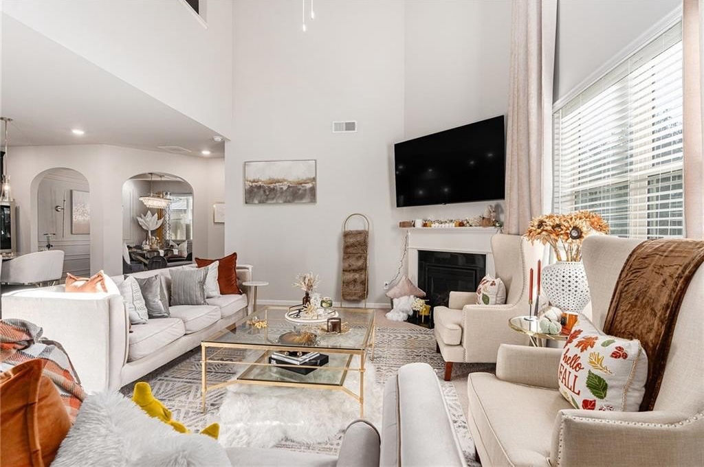 Enjoy the elegant touches throughout — from the grand chandelier in the foyer to the tall ceilings that create an open, airy feel. The family room, visible from the upstairs landing, provides a warm and inviting space highlighted by a beautiful fireplace.