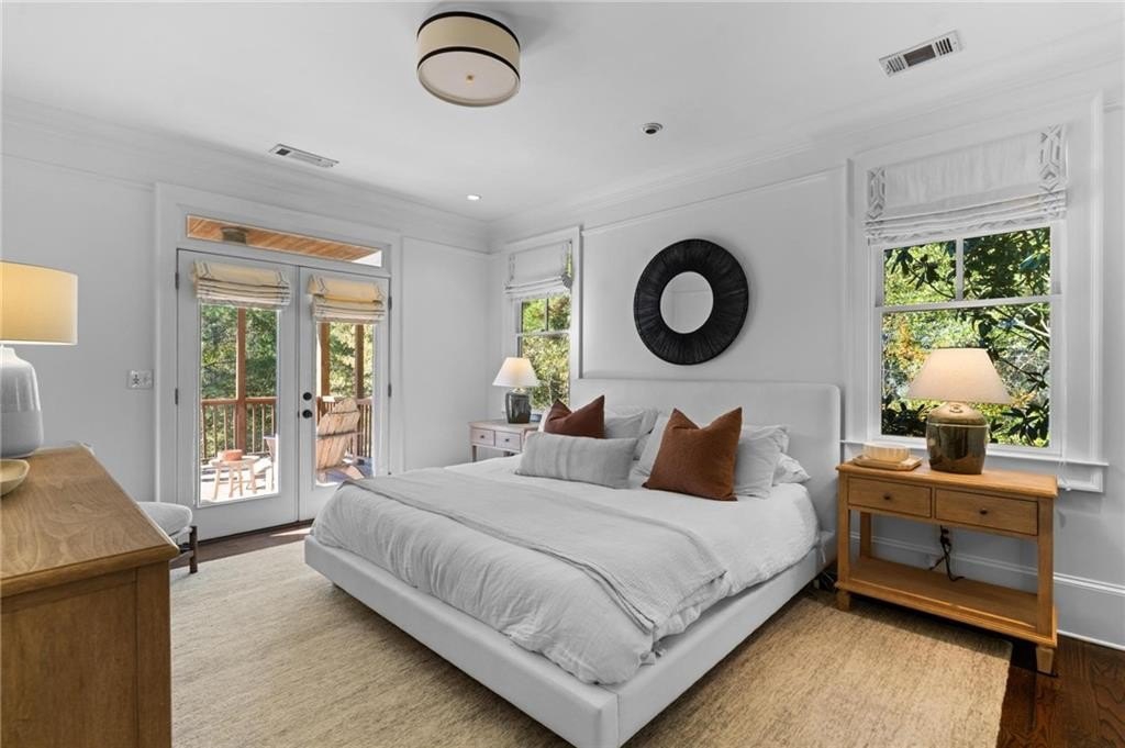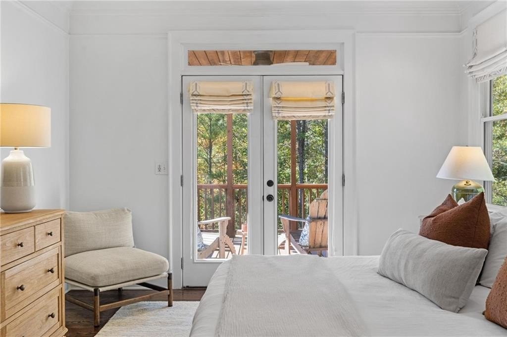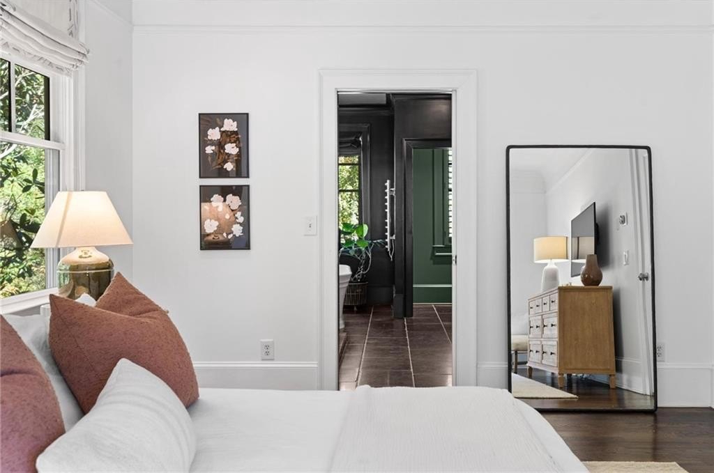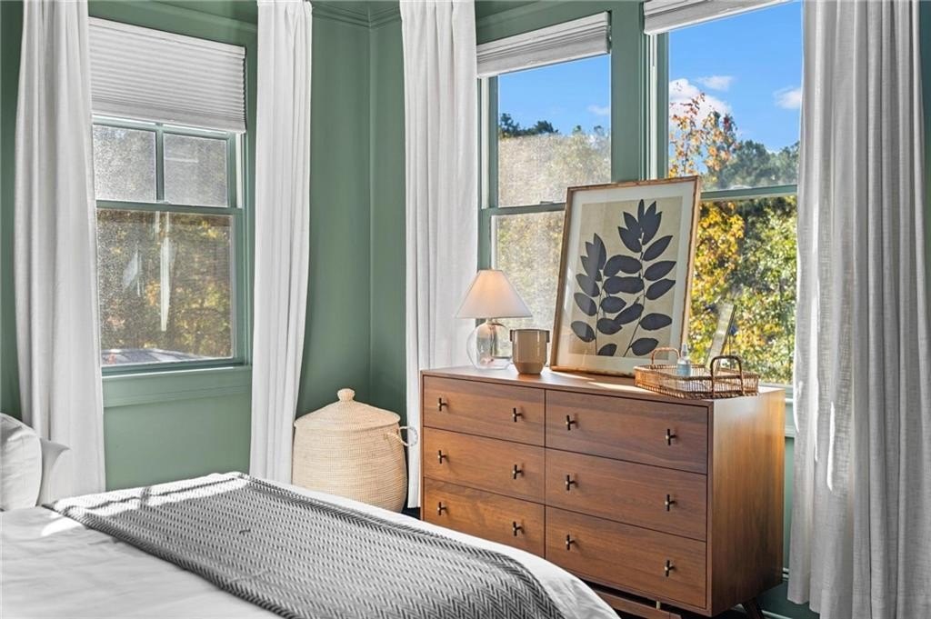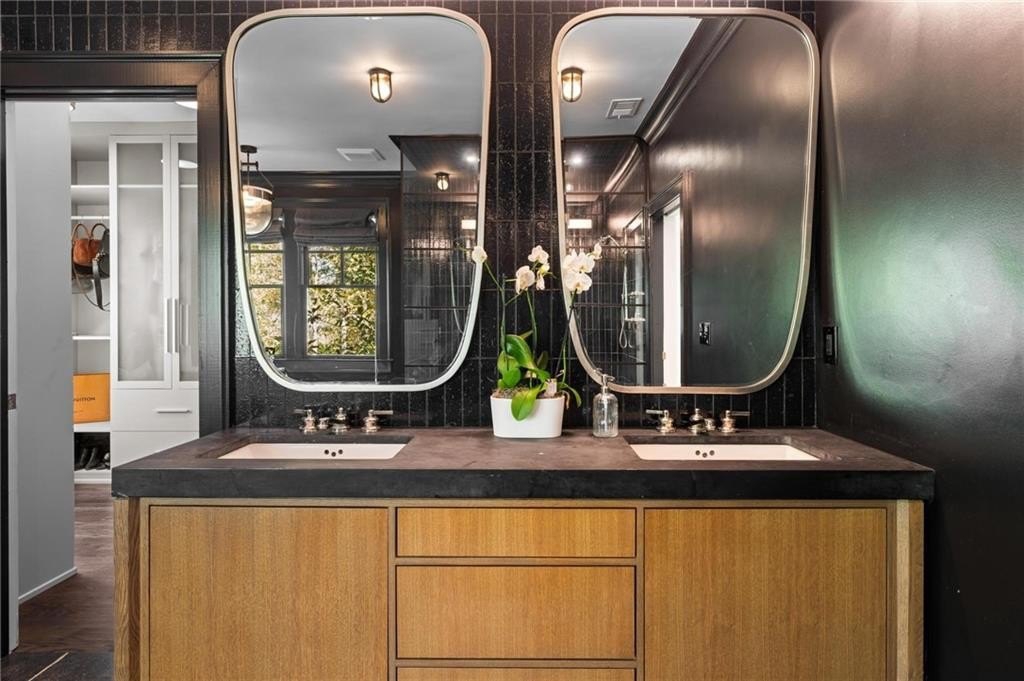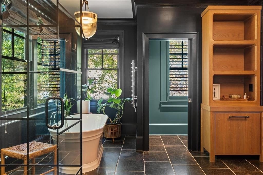 Upstairs, the primary suite provides a peaceful retreat with serene natural light and a luxuriously renovated spa-style bathroom featuring custom tilework, dual vanities, and designer finishes. Two additional bedrooms share a guest bath with elevated fixtures and finishes, all surrounded by treetop views.