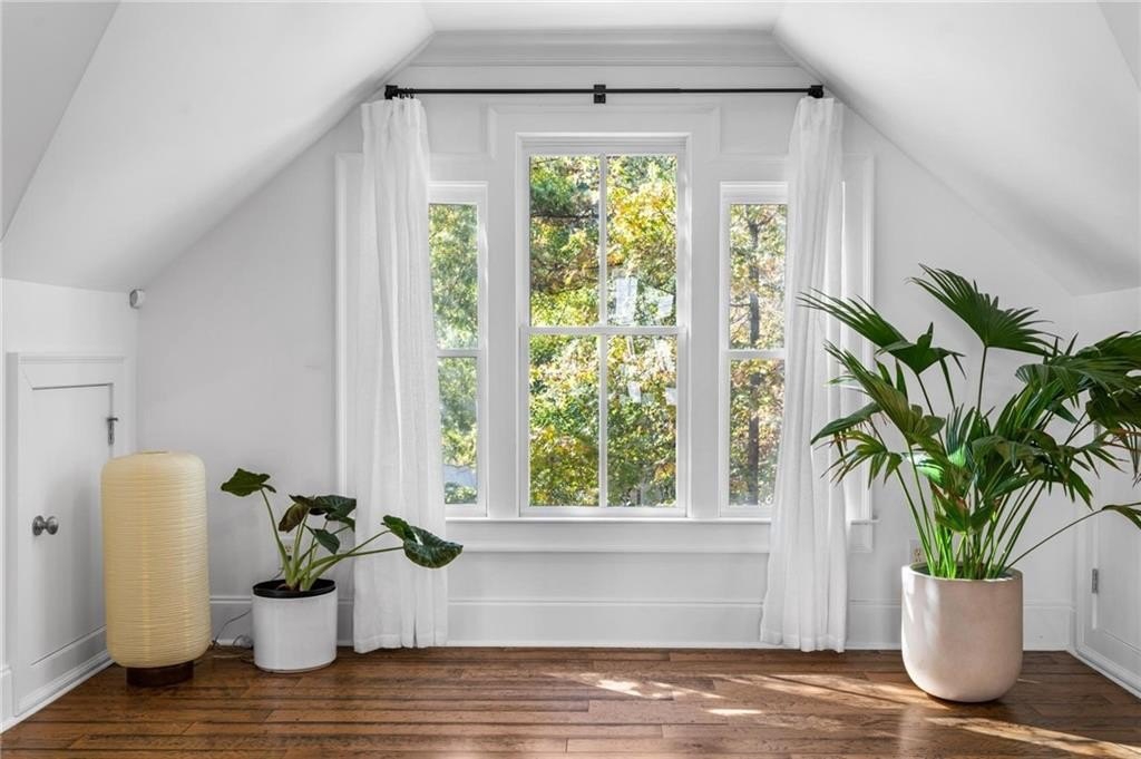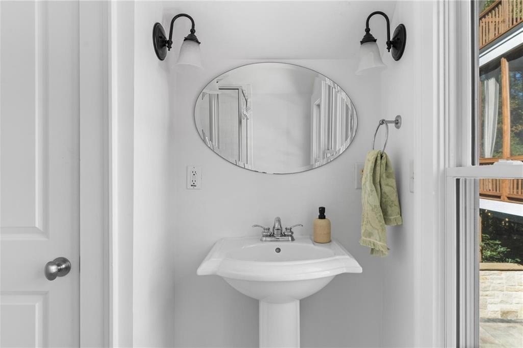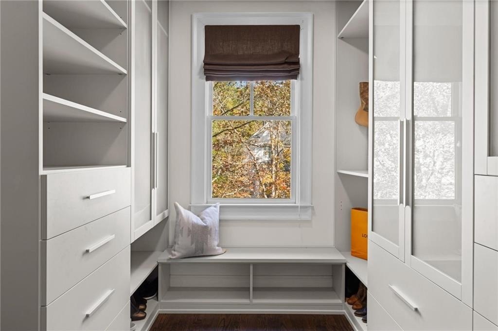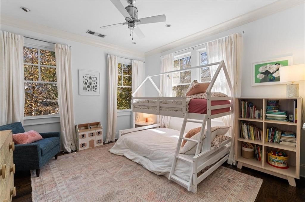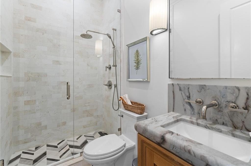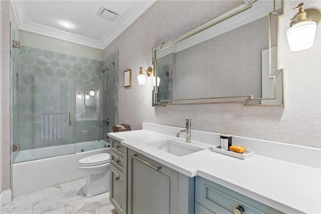 Upstairs, the primary suite provides a peaceful retreat with serene natural light and a luxuriously renovated spa-style bathroom featuring custom tilework, dual vanities, and designer finishes. Two additional bedrooms share a guest bath with elevated fixtures and finishes, all surrounded by treetop views.