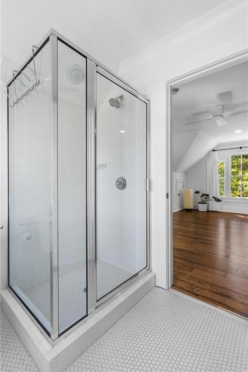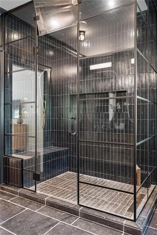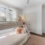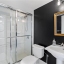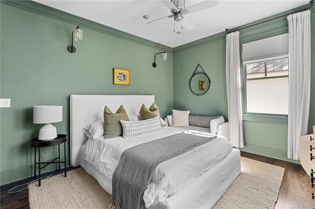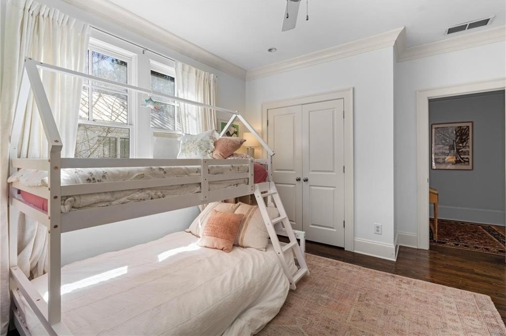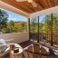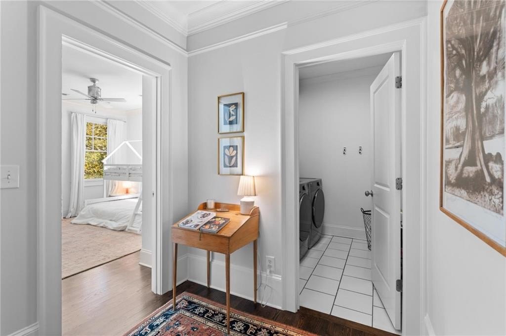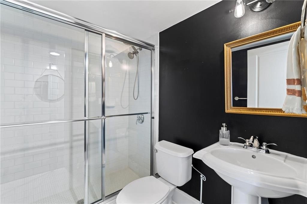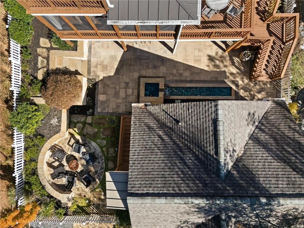 Upstairs, the primary suite provides a peaceful retreat with serene natural light and a luxuriously renovated spa-style bathroom featuring custom tilework, dual vanities, and designer finishes. Two additional bedrooms share a guest bath with elevated fixtures and finishes, all surrounded by treetop views.