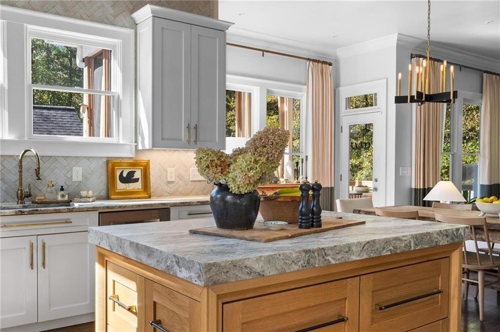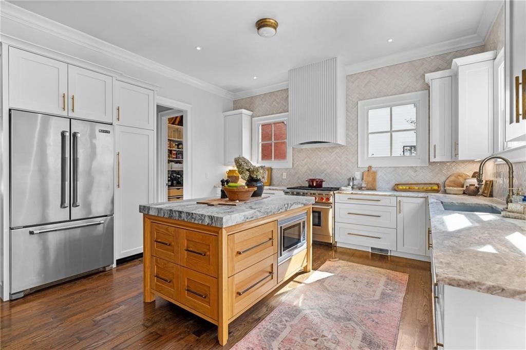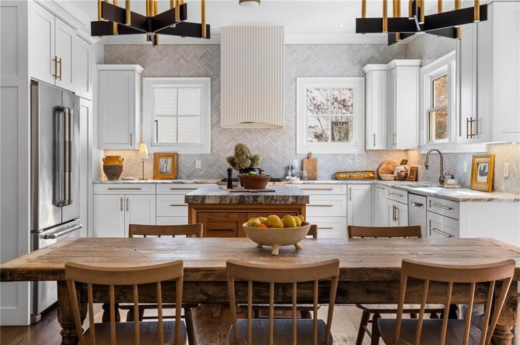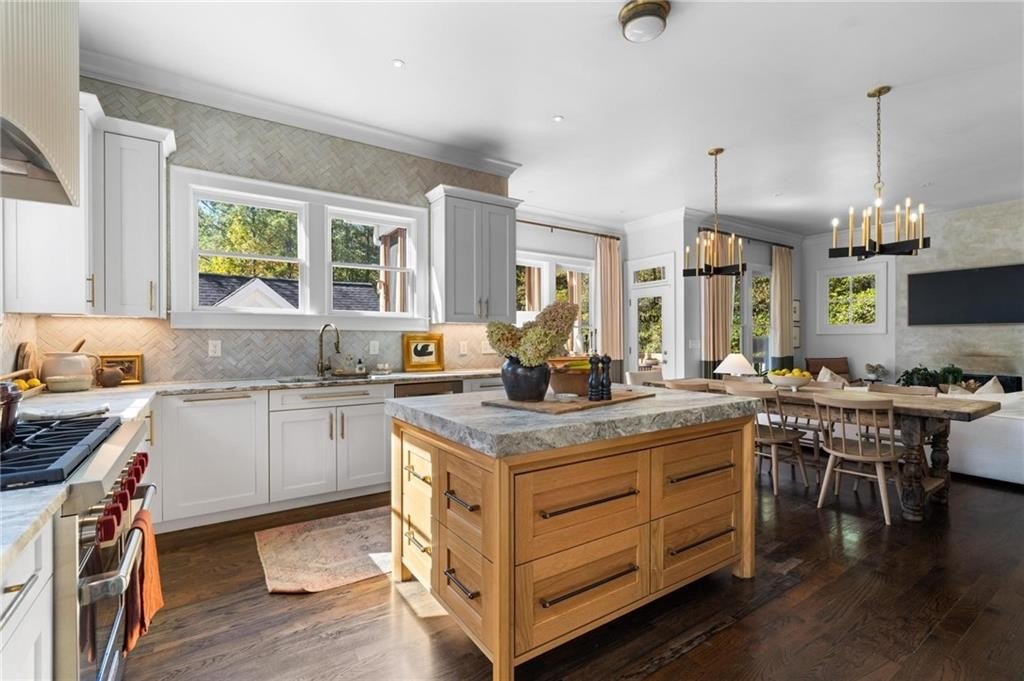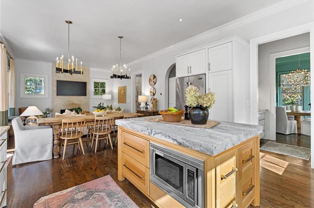 At the heart of the home is a custom-designed chef’s kitchen, beautifully renovated with high-end cabinetry, designer fixtures, luxury appliances, and elevated storage solutions. It’s a true entertainer’s space, equally suited for dinner parties or casual mornings around the island.