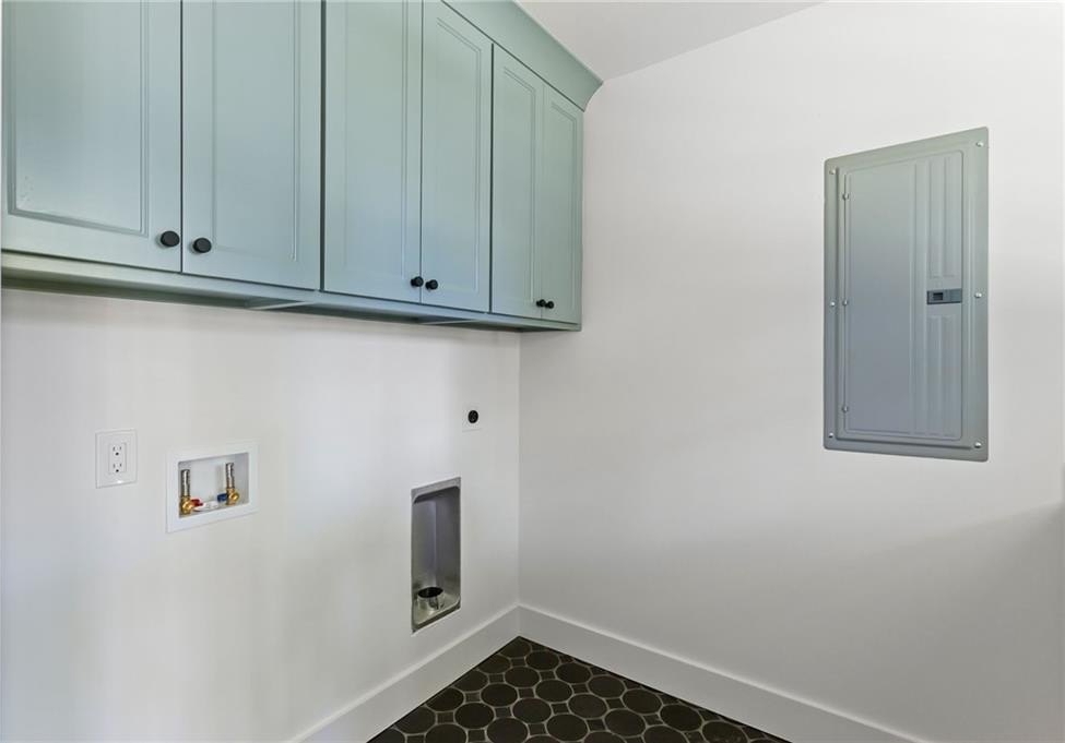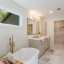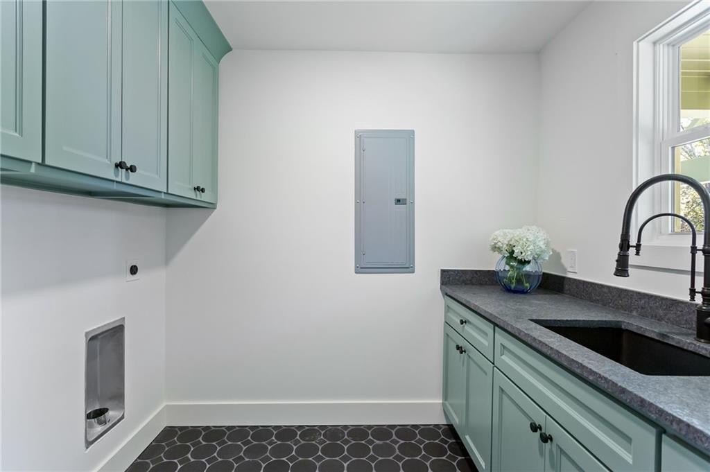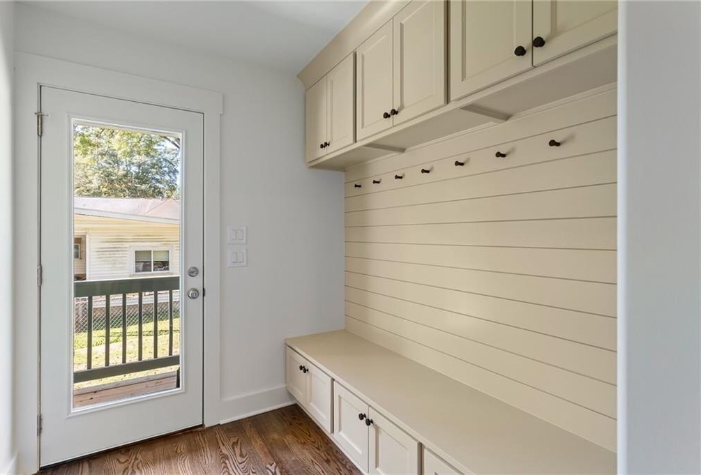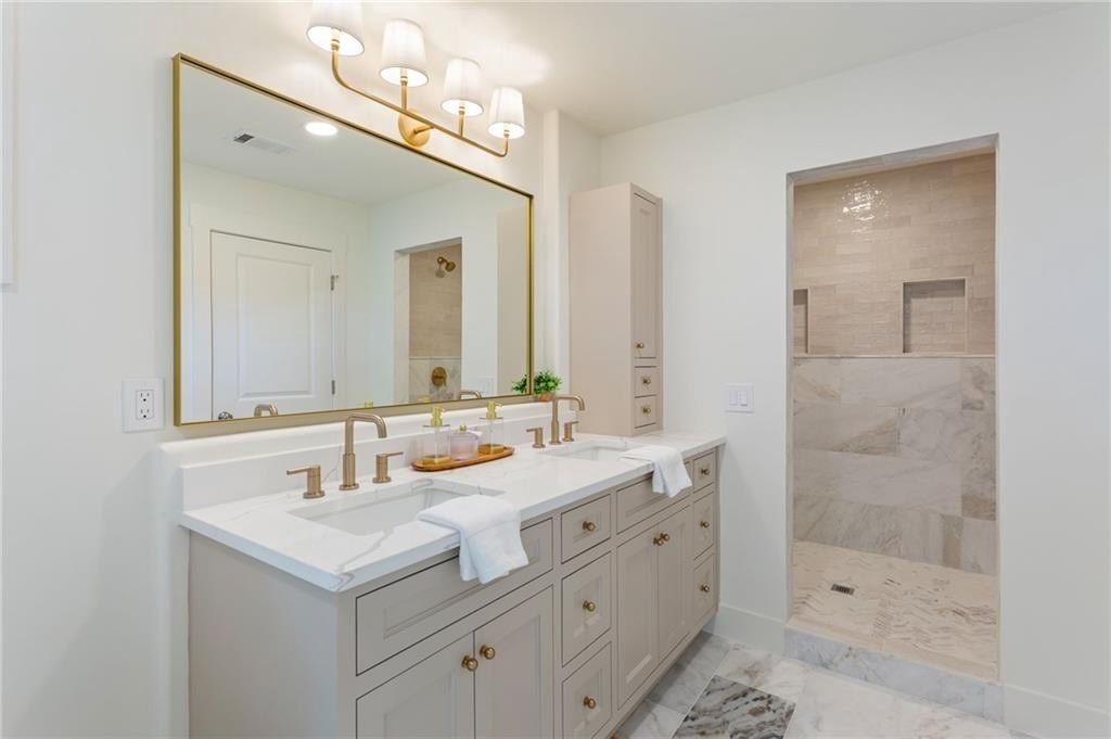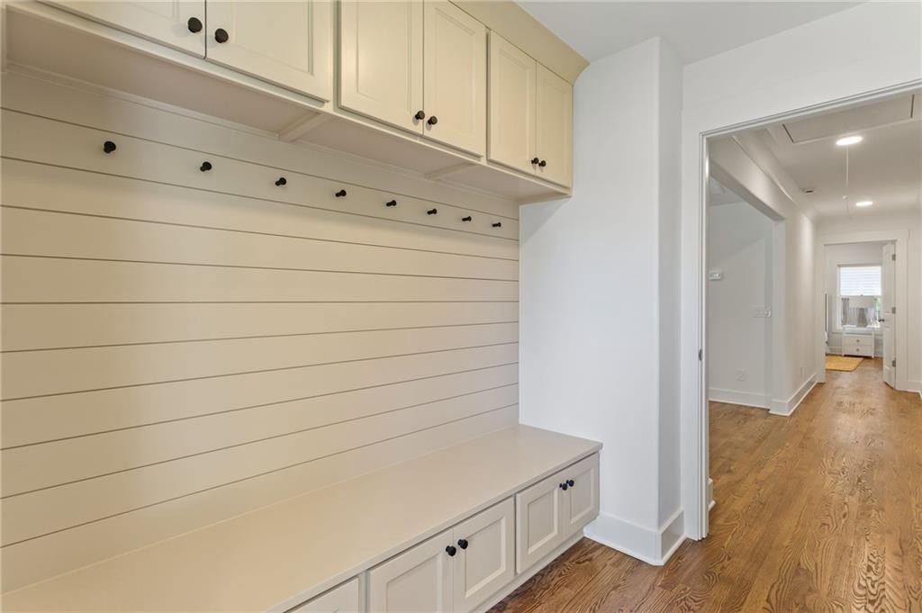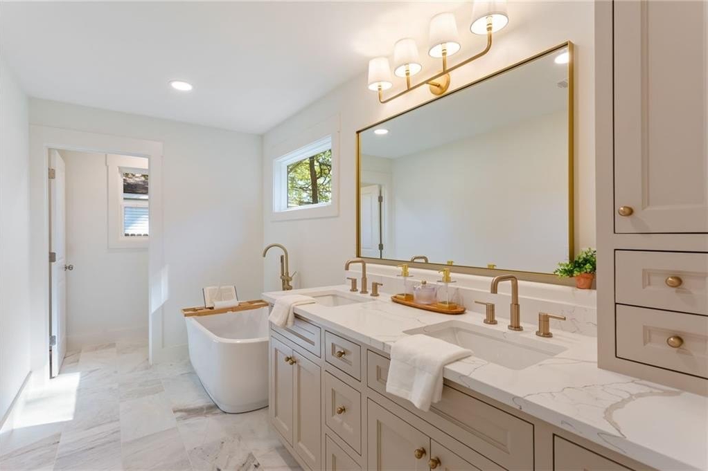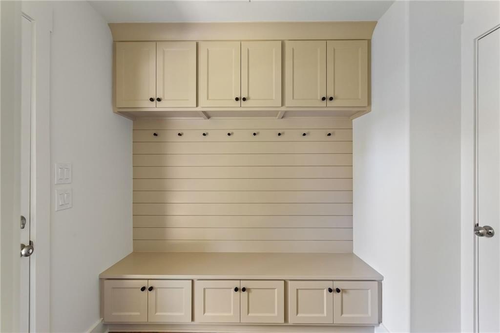 The vaulted family room delivers an airy retreat, while the dining area charms with a shiplap accent wall for instant personality. The oversized primary suite is a showpiece with its dual vanities, standalone soaking tub, marble flooring, a tile step-in shower with toiletry niches, and a walk-in closet outfitted with built-in systems for seamless organization. Adjacent to the family room, you’ll find a luxurious powder room with marble vessel sink and bronze hardware, a mud-room entrance with storage and coat hooks, and a dedicated laundry room complete with cabinet space and sink.