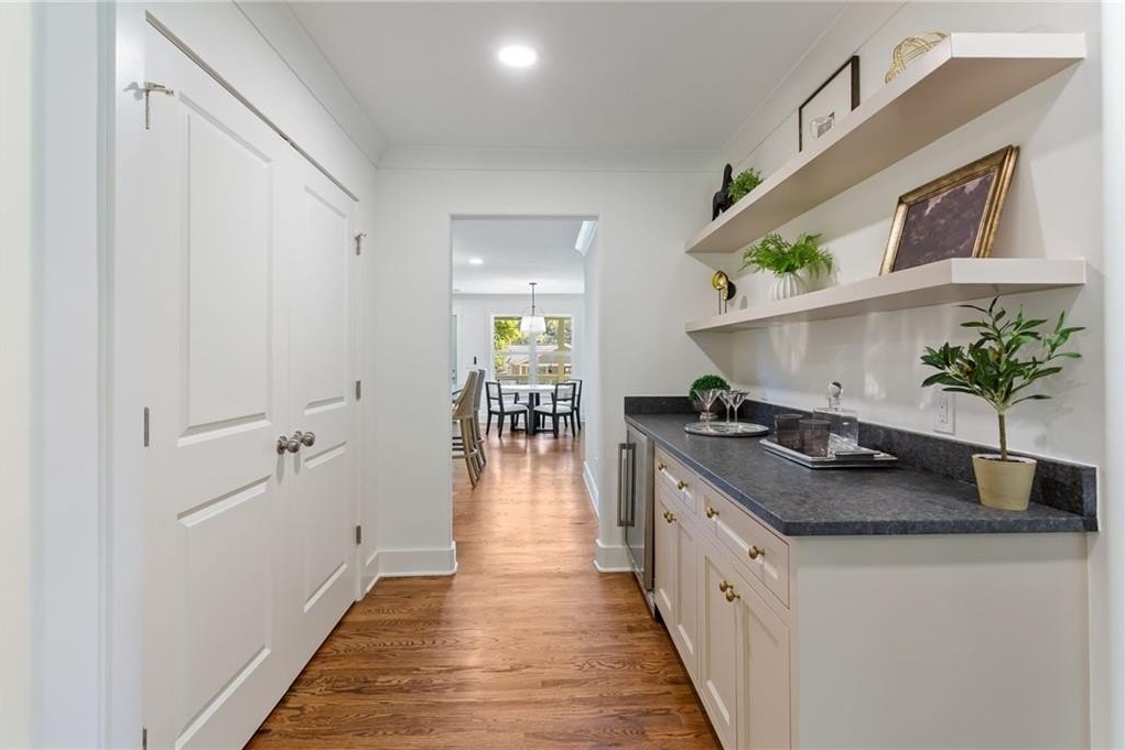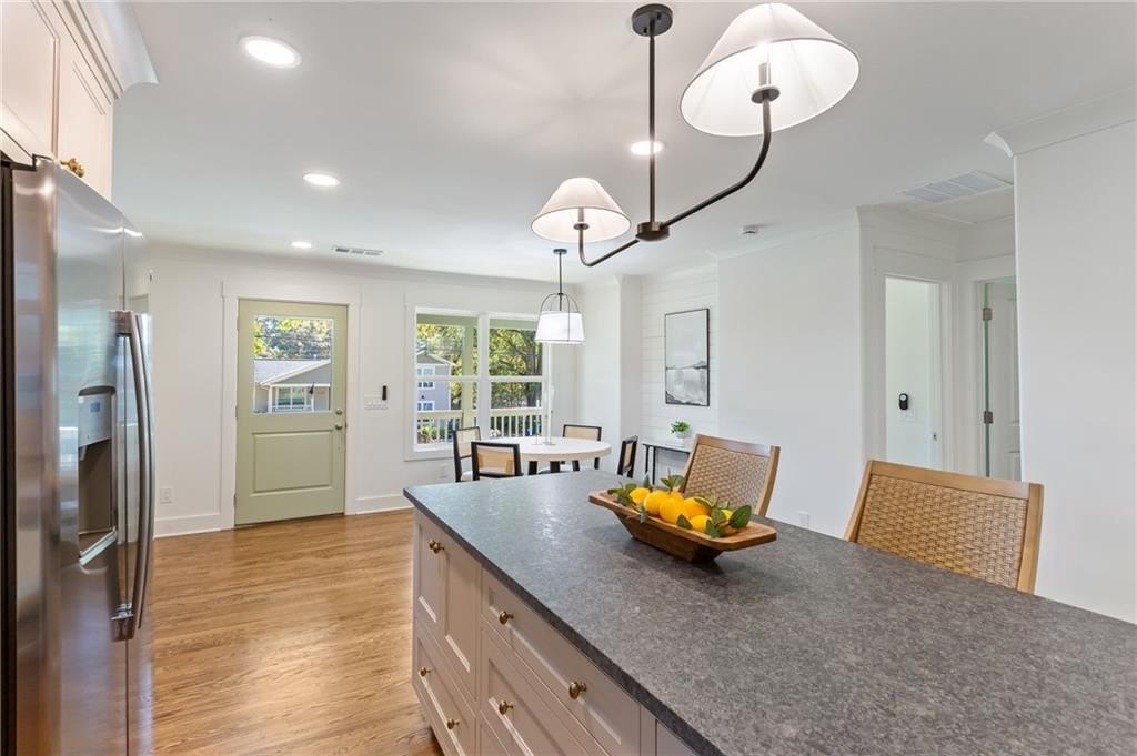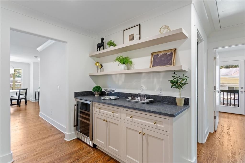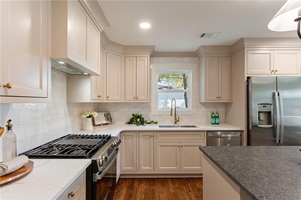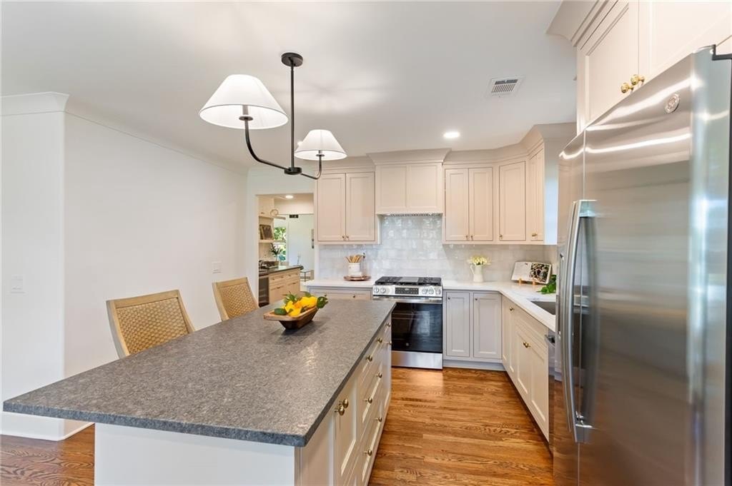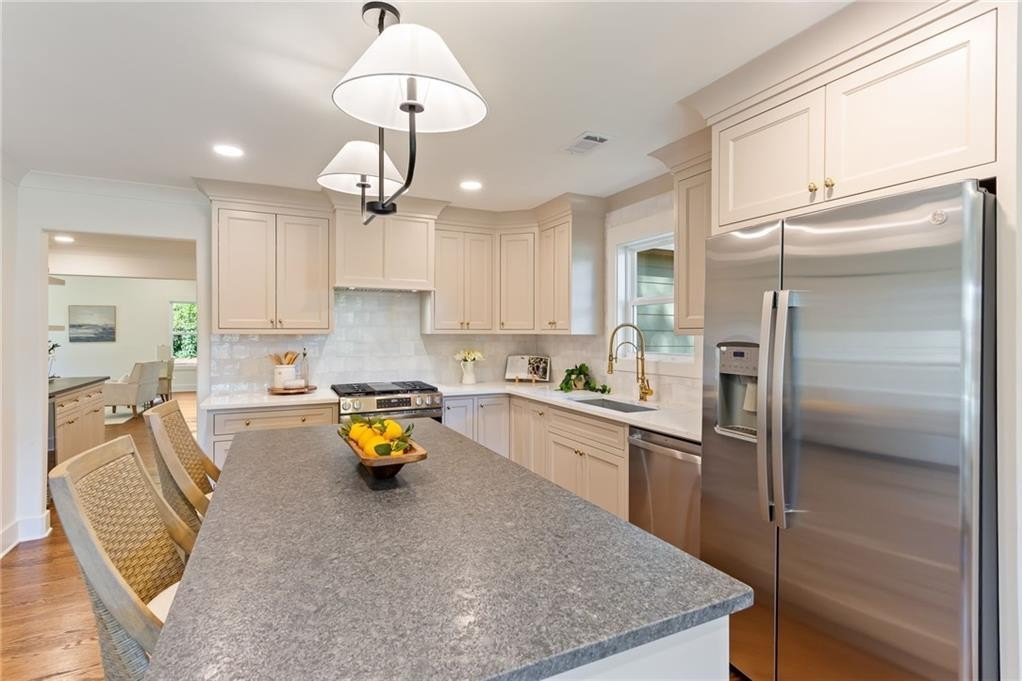 From the generous covered front porch to the lush landscaped level yard, this 1,933?sq?ft residence invites you in. Inside you’ll find 3 bedrooms and 2.5 baths that tell a story of thoughtful design and seamless flow. The heart of the home is the shaker-style kitchen featuring quartz countertops, sleek stainless-steel appliances, a spacious island with seating, white subway tile backsplash, bronze fixtures and cabinet knobs, and a huge pantry for all your culinary ambitions. Adjacent: a sophisticated butler’s pantry with open shelving and a wine cooler, making entertaining effortless. Recessed lighting illuminates rich hardwood floors throughout.