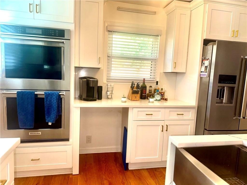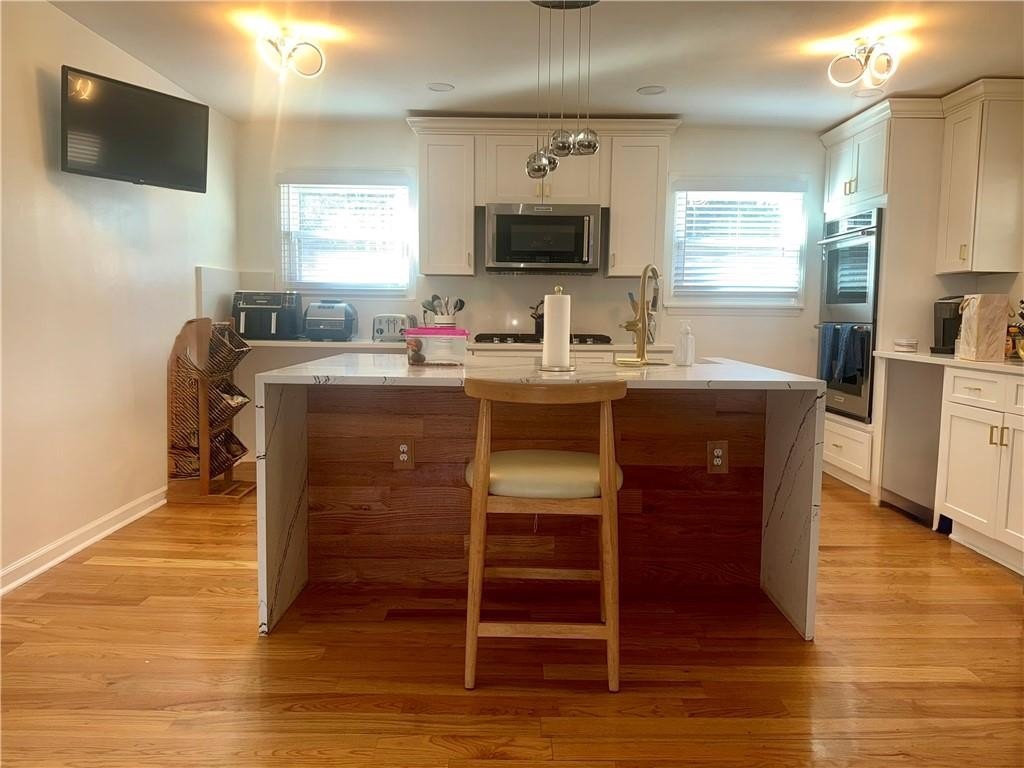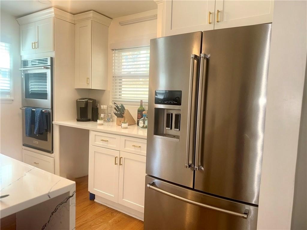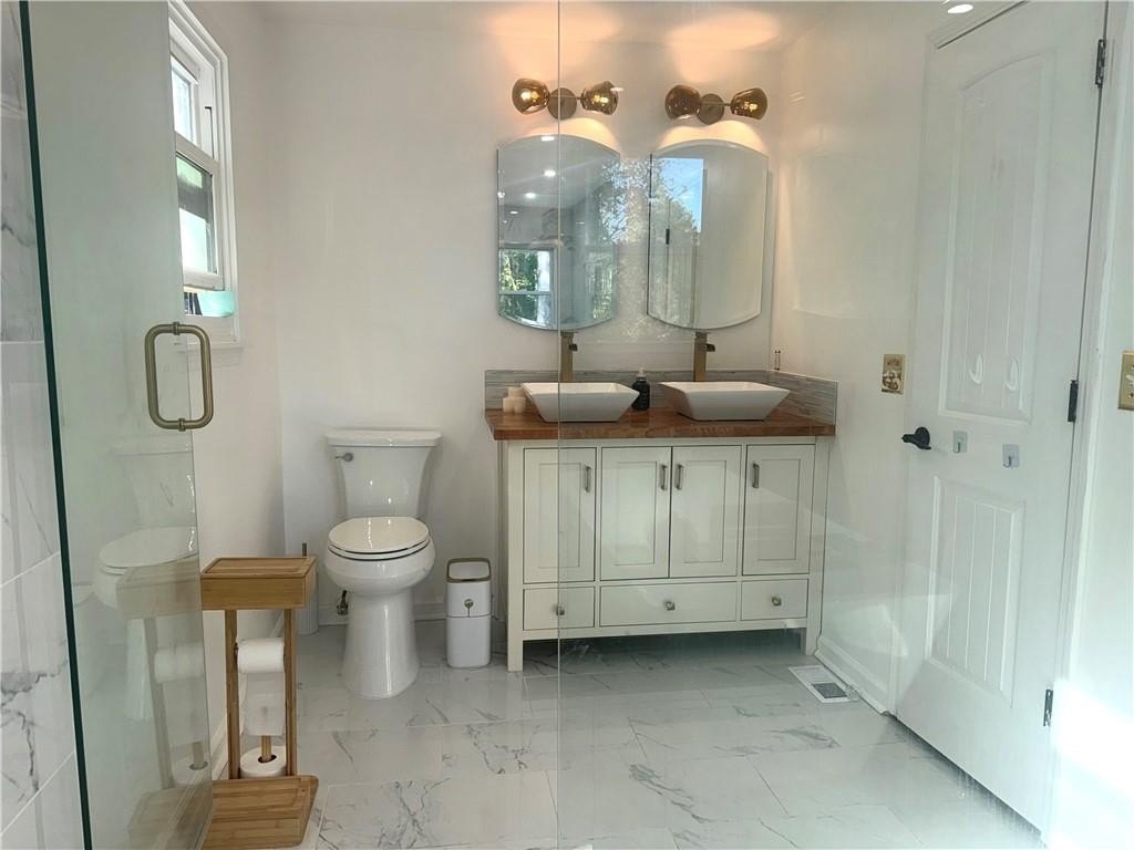 Inside, you’ll find gleaming hardwood floors, vinyl windows that welcome abundant natural light, and a cozy fireplace that sets the tone for warm gatherings. The updated kitchen features granite countertops, stainless steel appliances, and stylish cabinetry, making everyday living as effortless as it is elegant.
