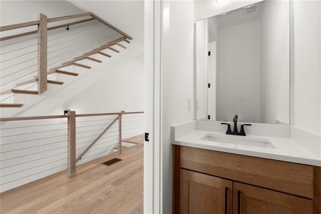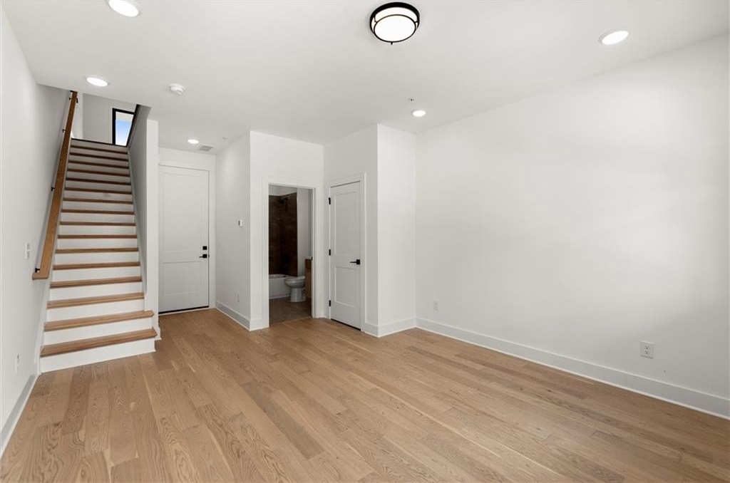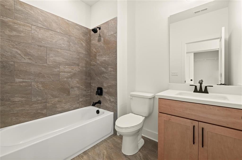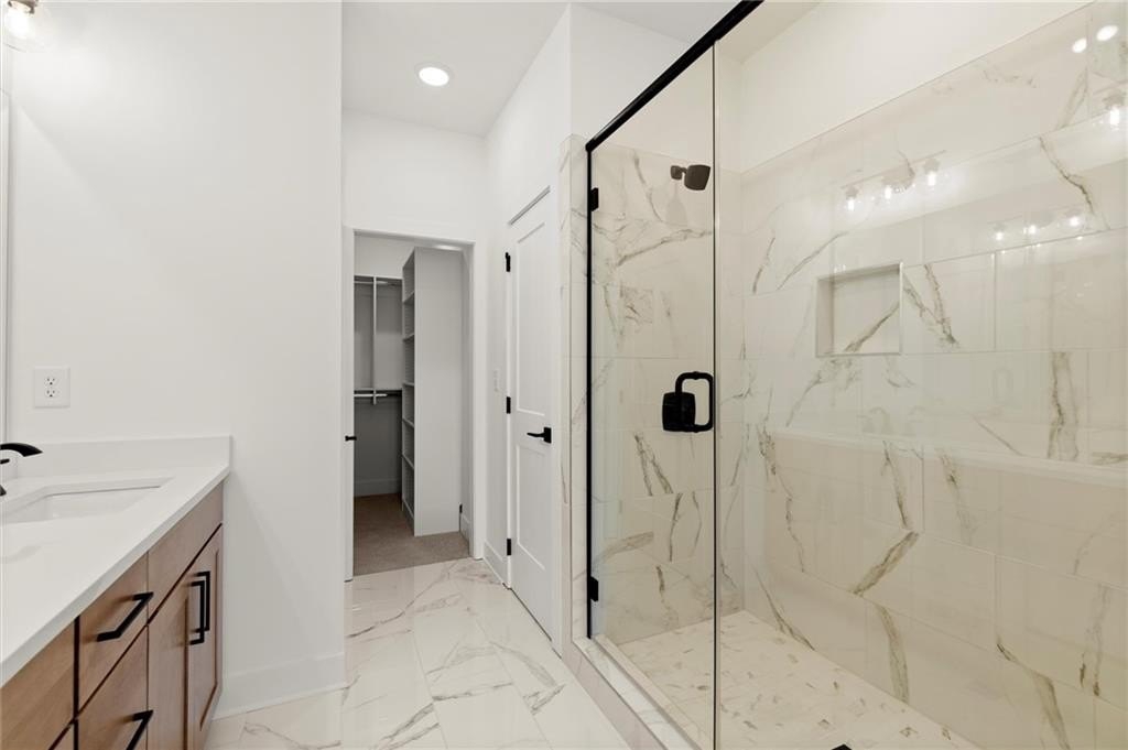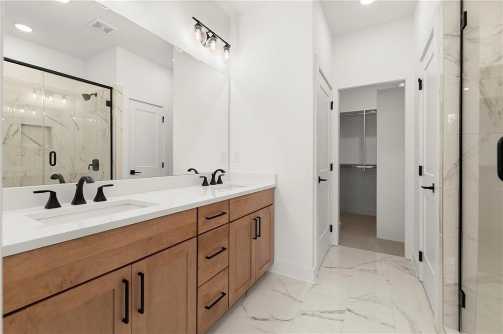 Upstairs, the primary suite offers a spacious walk-in closet and a spa-inspired bath with dual vanities, quartz counters, and a glass-enclosed shower. A secondary bedroom with its own full bath provides comfort and privacy for guests or family.