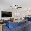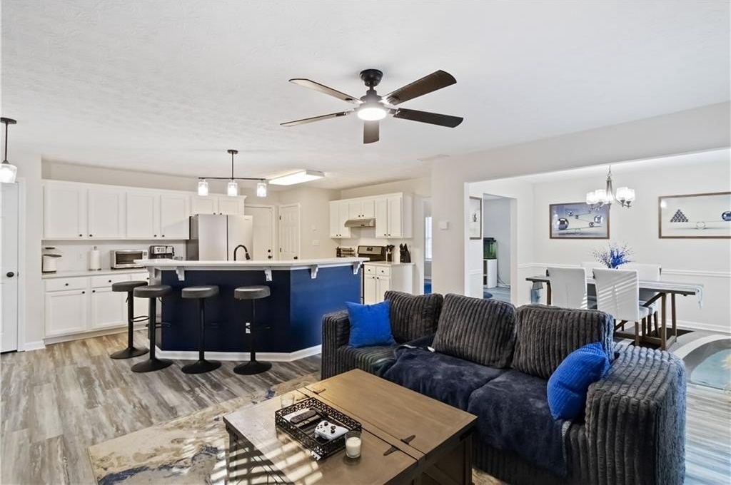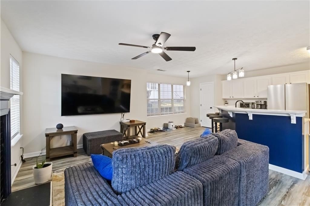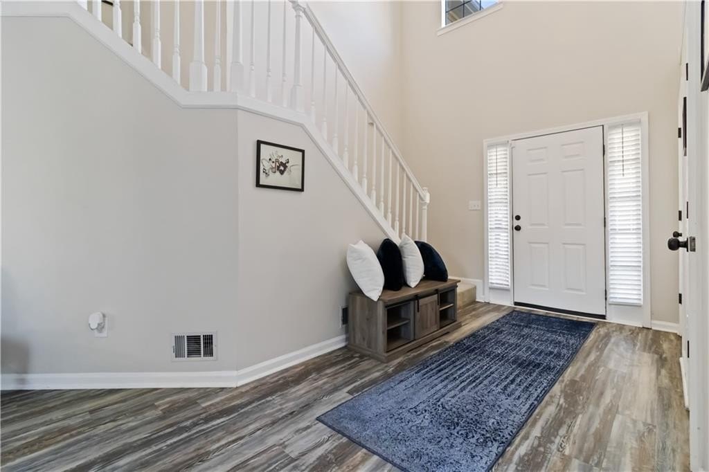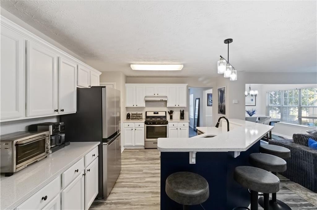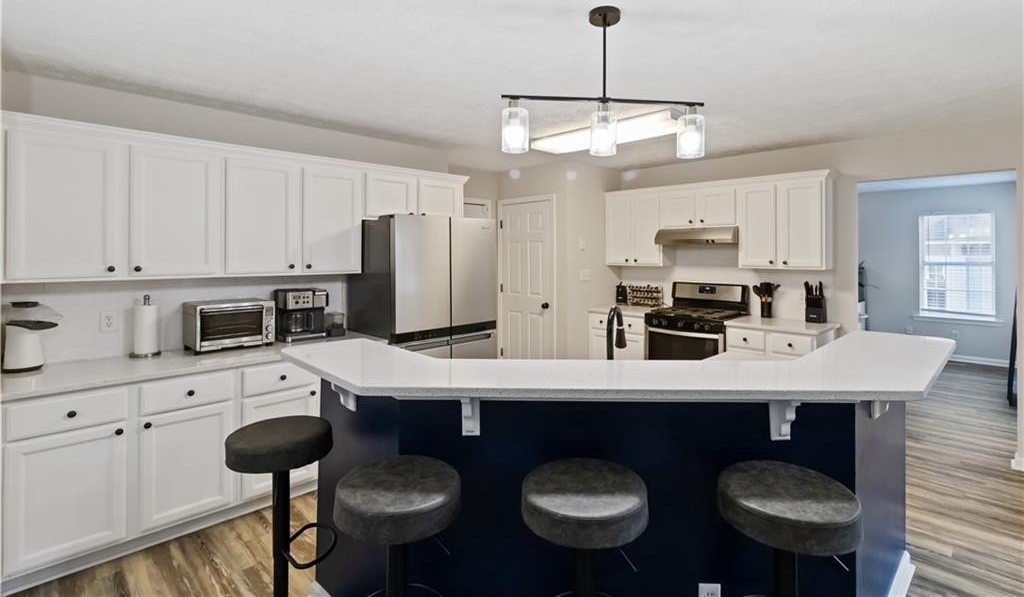 A bright two-story foyer invites you in, flowing to formal living and dining spaces and an open-concept kitchen and family area and half bath. The kitchen features quartz countertops, stainless-steel appliances, ample cabinetry and island seating — perfect for family meals and entertaining alike.