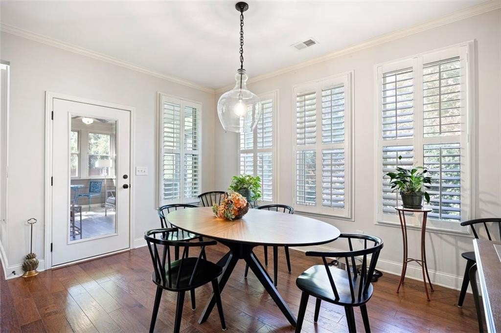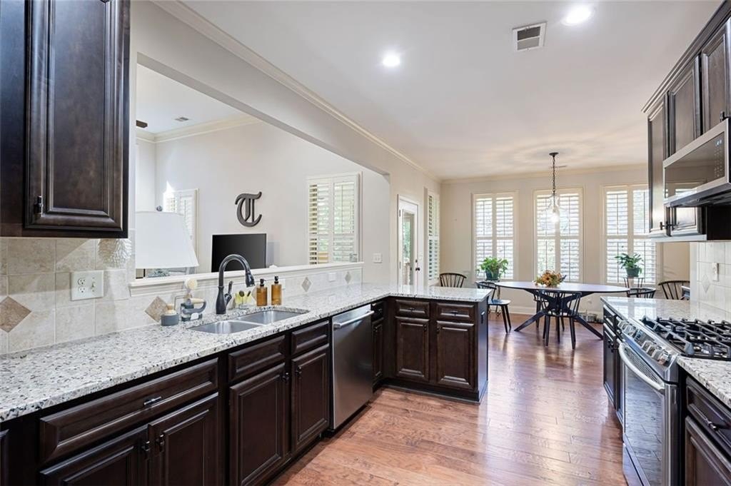 The chef’s kitchen is an entertainer’s dream — beautifully upgraded, open to the family room, and finished with plantation shutters that give the space timeless elegance.
