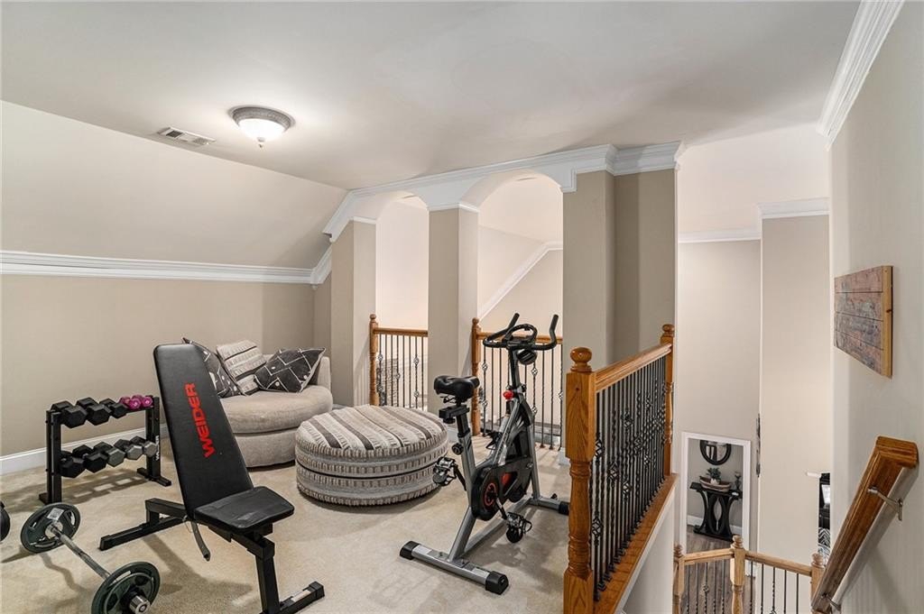 Upstairs, wrought iron stairs lead you to an open loft, two large secondary bedrooms, an additional bonus room with extra storage, and a full bathroom at the end of the hall.
