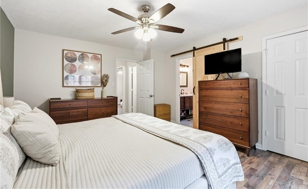 The updated kitchen shines with newer stainless steel appliances, elegant granite countertops, and plenty of storage—ready for your next culinary adventure. The primary suite offers a peaceful retreat with a private full bath and a walk-in closet complete with a custom closet system. Two additional bedrooms feature abundant natural light and ceiling fans for year-round comfort. The beautifully renovated hall bath adds a touch of modern luxury.