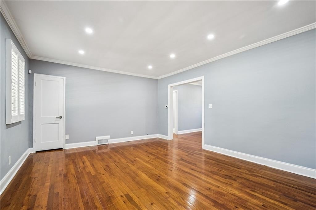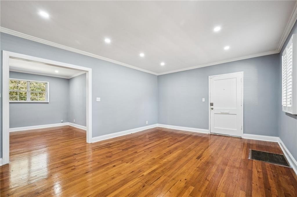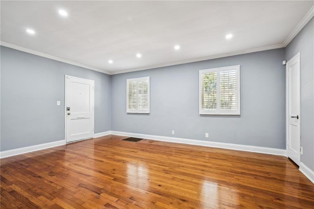 With two private entrances, you can enter through either the front or rear of the secure building. Through the front door, you’re welcomed into a spacious living room where original hardwood floors tell the story of the home’s history—beautifully complemented by abundant natural light streaming through large windows.