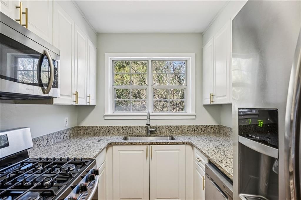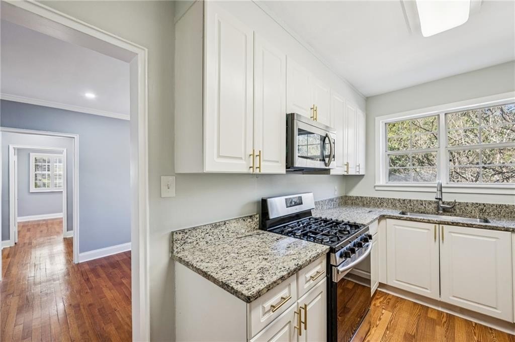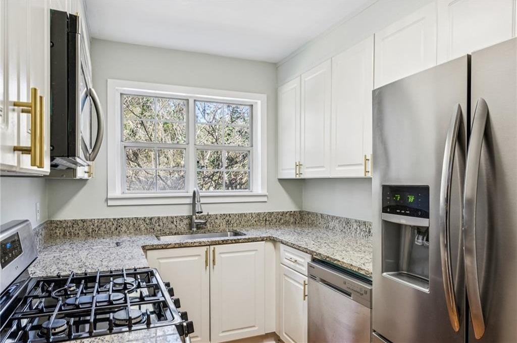 A separate dining room connects seamlessly to the living area, making it an ideal space for entertaining. To the right, the sleek, updated kitchen features granite countertops, stainless steel appliances, and elegant white cabinetry—a space that feels both functional and refined. A window over the sink overlooks an expansive green space, bringing a serene touch of nature to the heart of the city. The secondary entrance off the kitchen provides easy access when bringing in groceries or stepping out to your car behind the building.