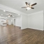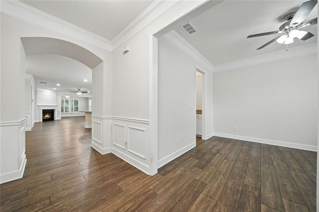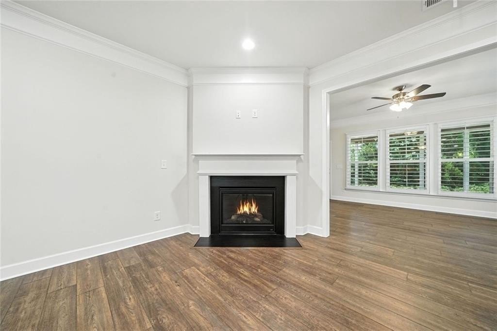 Wide-plank wood-look floors flow throughout the main level, connecting the kitchen to the wainscoted dining area and into the living room, where a gas fireplace and plantation shutters set a relaxed tone.