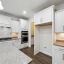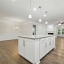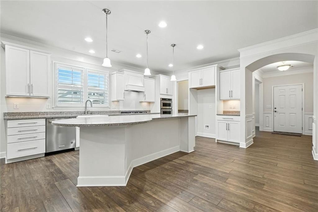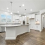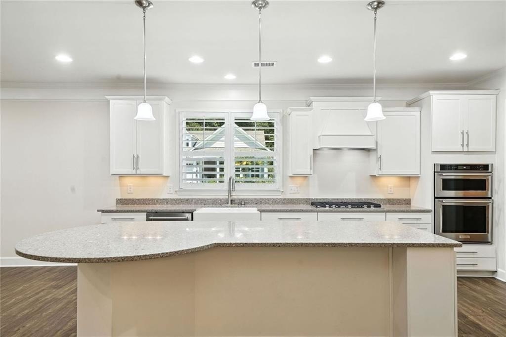 The heart of the home is the open-concept kitchen, anchored by a large center island. It features granite countertops, a farmhouse sink, white shaker cabinets with sleek hardware, and a full suite of stainless steel appliances including a built-in wall oven and gas cooktop with vent hood. Under-cabinet lighting adds warmth and visibility, while the walk-in pantry keeps everything within reach but out of sight.