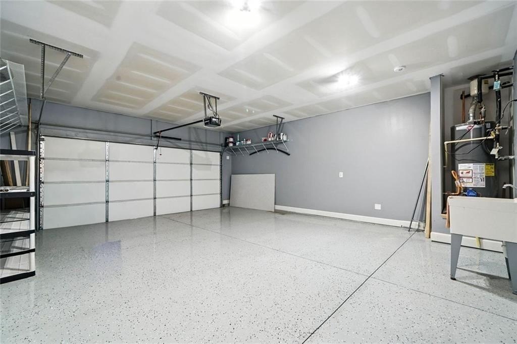 The oversized two-car garage features an epoxy-coated floor, wall shelving, and a utility sink, ideal for weekend projects or extra storage.