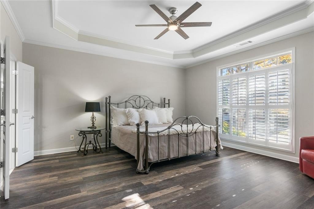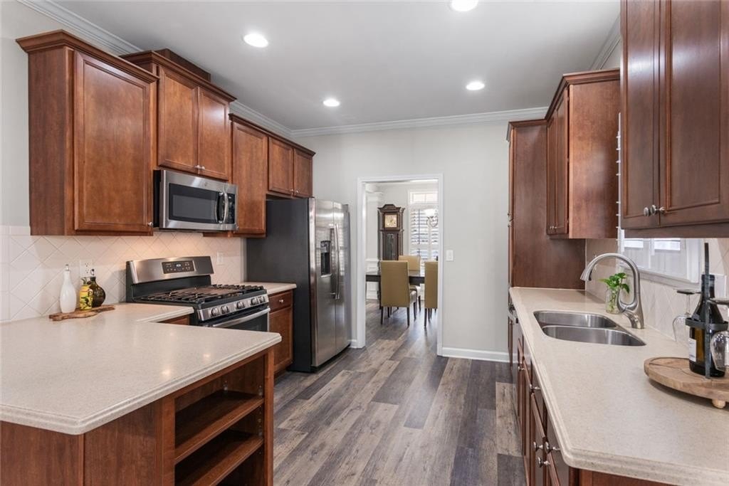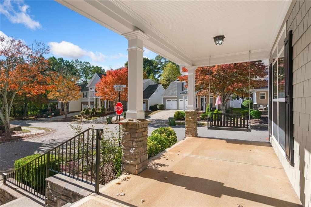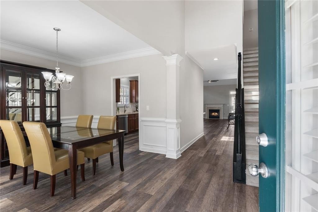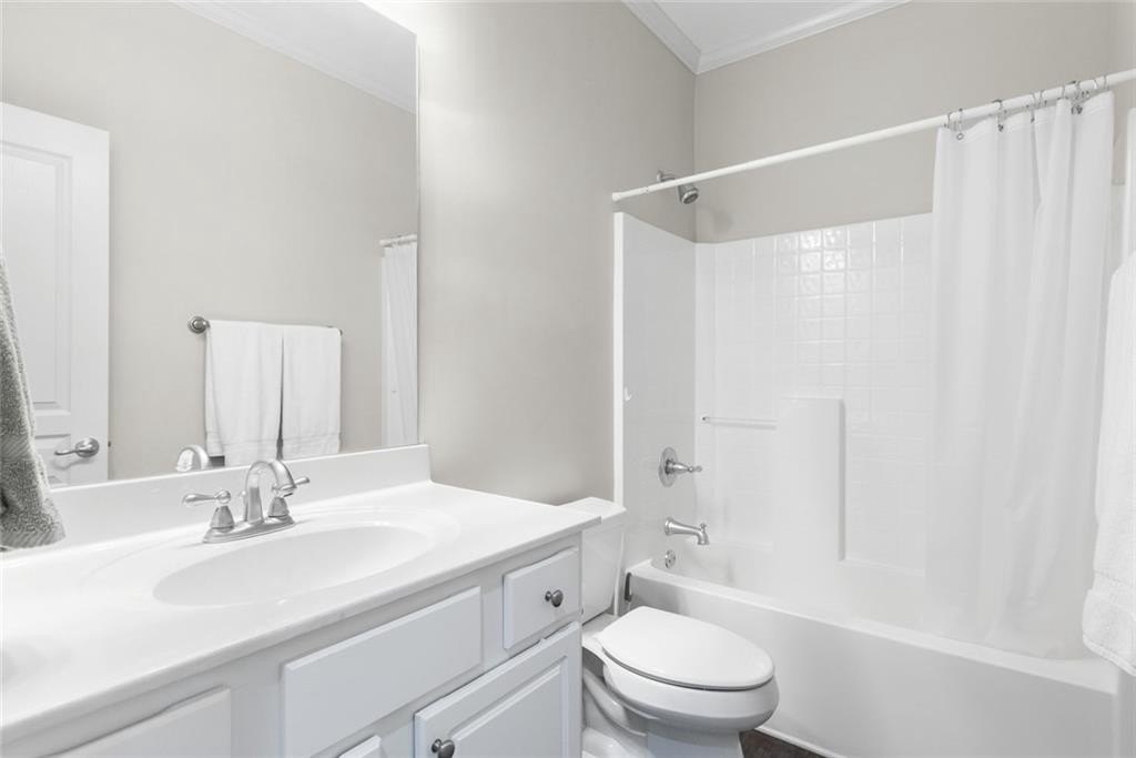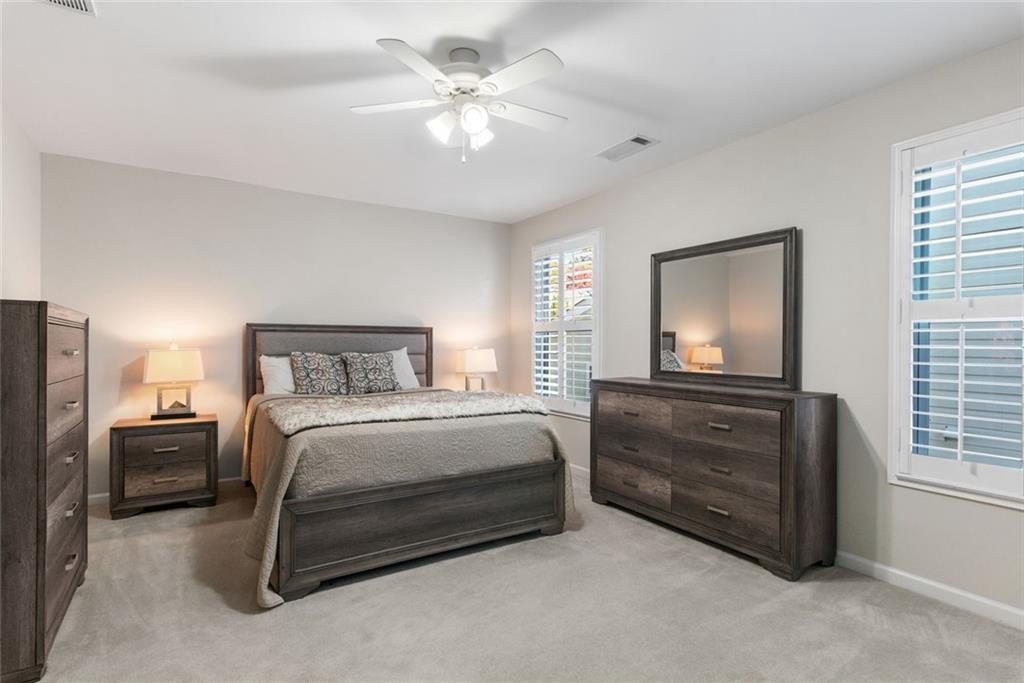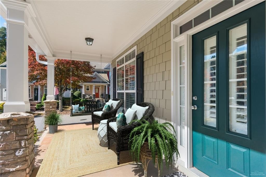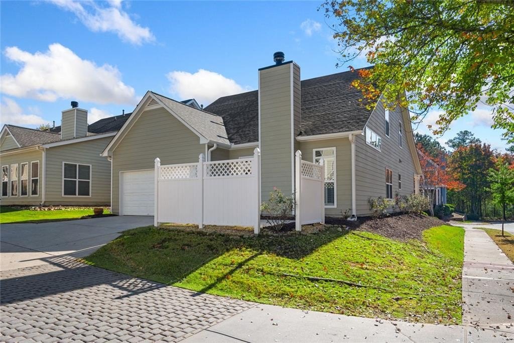 You'll fall in love with this incredibly charming home in pristine condition in the North Gwinnett school district. Hang out on the covered front porch and enjoy the quiet surroundings. Located in the popular Stonecypher neighborhood of Suwanee, it's an easy walk to Suwanee Town Center, parks, trails and shopping. This is one of the largest floor plans in the neighborhood and features a freshly painted exterior, plantation shutters throughout, newer LVP flooring on the main level and lots of extra storage. The family room offers plenty of space to gather, and is defined by its gas fireplace, high vaulted ceiling that amplifies the sense of volume and light, and crown molding that adds a touch of refined detail. The kitchen features stainless appliances, tile backsplash, and solid surface counters. A peninsula provides both workspace and casual dining while stained cabinetry brings a classic touch, and crown molding ties the space together with sophisticated detail. In addition to the kitchen pantry, there is another pantry in the hallway, as well as a separate coat closet. The dining room with paneled wainscoting and crown molding is perfect for more formal meals, while there's an additional, more casual eating area just off the kitchen. The primary bedroom provides a serene retreat, featuring a tray ceiling and crown molding that enhances the room's overall elegance. The en-suite bath features tile flooring, a garden tub, dual vanities, separate walk-in shower and a spacious closet. A laundry room, 2nd bedroom and another full bath round out the main level. Upstairs, there is a large bonus room/loft area that can be used as a 2nd living room, rec room or whatever fits your needs. There is also a very spacious bedroom and a 3rd full bath. In addition to the closet in the bedroom, there are 2 additional large closets, one of which is a finished part of the attic. In addition, the attic area above the 2 car garage has been completely floored and is perfect for a lot more storage space. The back patio has a partial privacy fence. That area can be enclosed (with HOA approval) if a buyer chooses to do so. Washer, dryer and refrigerator stay with the property. Enjoy viewing this lovely home.