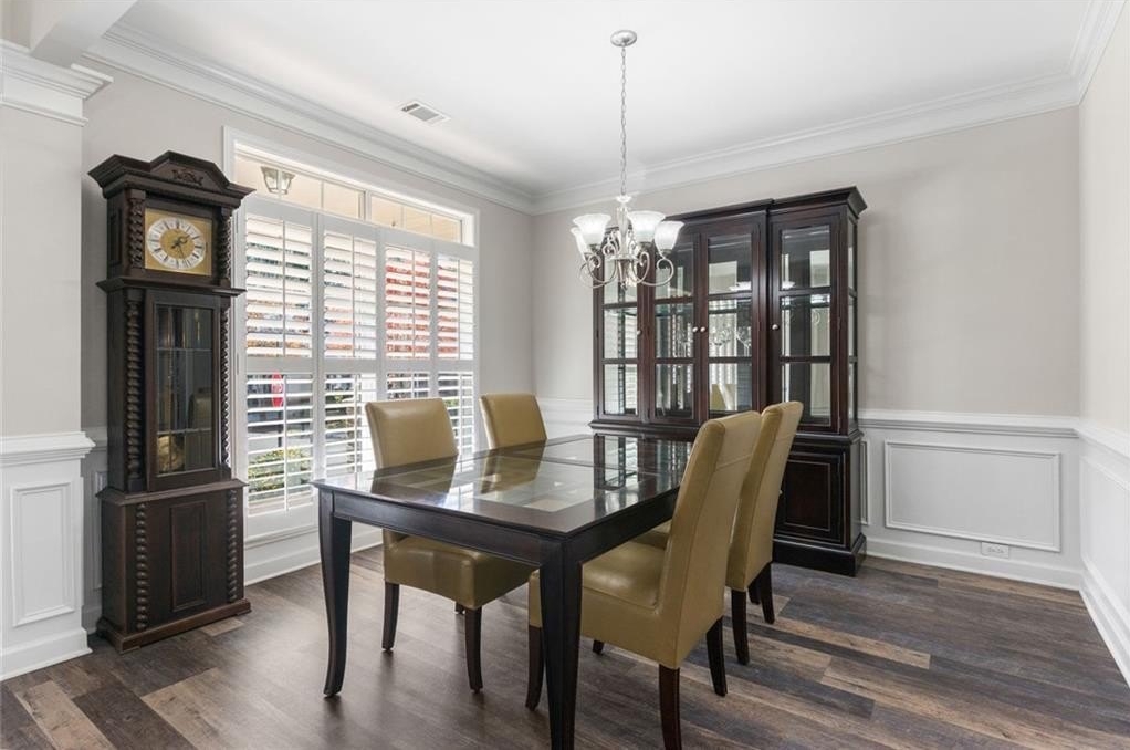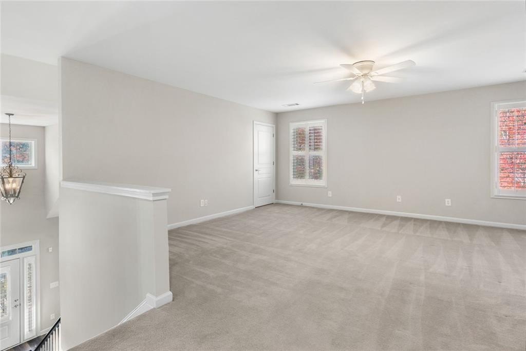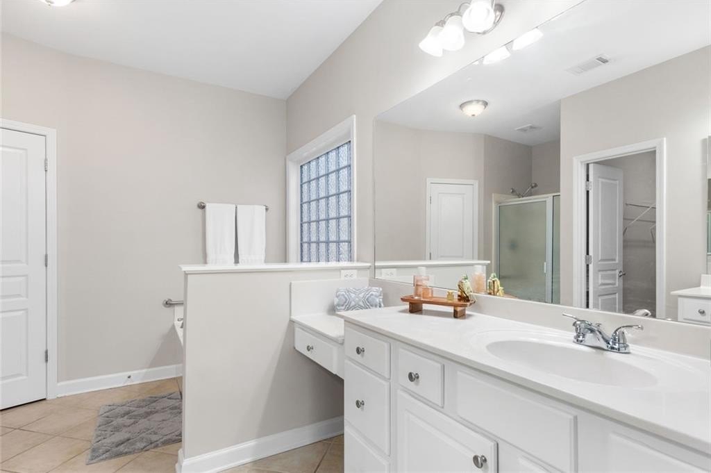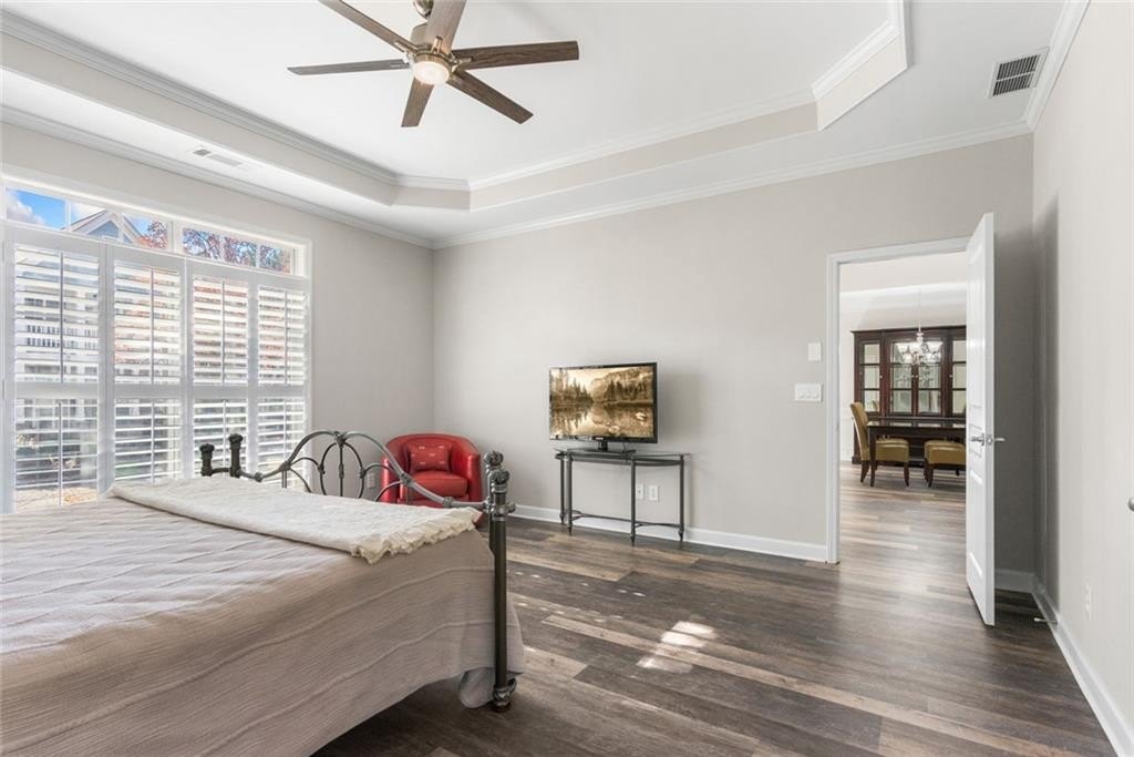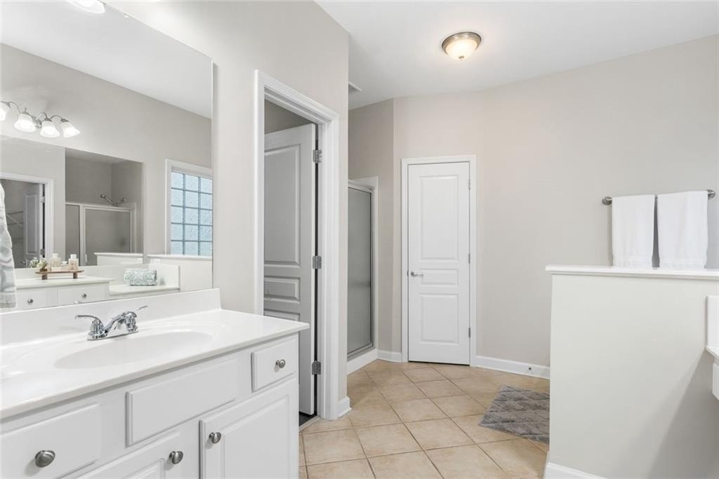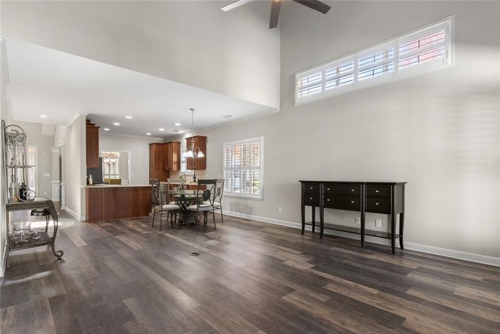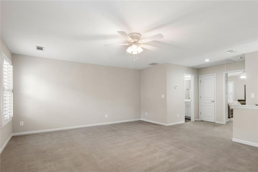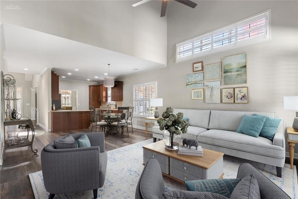 You'll fall in love with this incredibly charming home in pristine condition in the North Gwinnett school district. Hang out on the covered front porch and enjoy the quiet surroundings. Located in the popular Stonecypher neighborhood of Suwanee, it's an easy walk to Suwanee Town Center, parks, trails and shopping. This is one of the largest floor plans in the neighborhood and features a freshly painted exterior, plantation shutters throughout, newer LVP flooring on the main level and lots of extra storage. The family room offers plenty of space to gather, and is defined by its gas fireplace, high vaulted ceiling that amplifies the sense of volume and light, and crown molding that adds a touch of refined detail. The kitchen features stainless appliances, tile backsplash, and solid surface counters. A peninsula provides both workspace and casual dining while stained cabinetry brings a classic touch, and crown molding ties the space together with sophisticated detail. In addition to the kitchen pantry, there is another pantry in the hallway, as well as a separate coat closet. The dining room with paneled wainscoting and crown molding is perfect for more formal meals, while there's an additional, more casual eating area just off the kitchen. The primary bedroom provides a serene retreat, featuring a tray ceiling and crown molding that enhances the room's overall elegance. The en-suite bath features tile flooring, a garden tub, dual vanities, separate walk-in shower and a spacious closet. A laundry room, 2nd bedroom and another full bath round out the main level. Upstairs, there is a large bonus room/loft area that can be used as a 2nd living room, rec room or whatever fits your needs. There is also a very spacious bedroom and a 3rd full bath. In addition to the closet in the bedroom, there are 2 additional large closets, one of which is a finished part of the attic. In addition, the attic area above the 2 car garage has been completely floored and is perfect for a lot more storage space. The back patio has a partial privacy fence. That area can be enclosed (with HOA approval) if a buyer chooses to do so. Washer, dryer and refrigerator stay with the property. Enjoy viewing this lovely home.