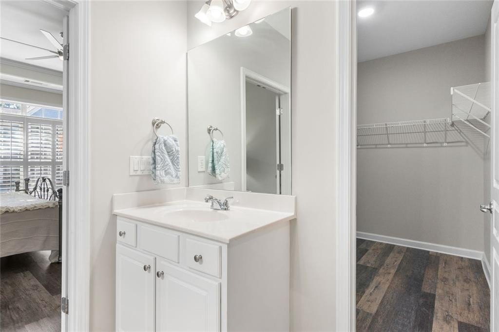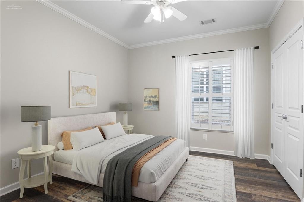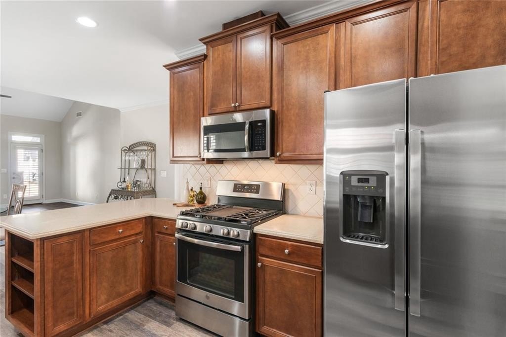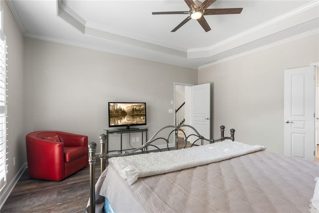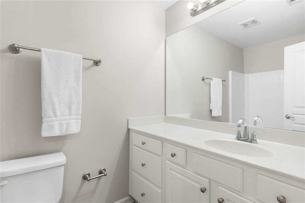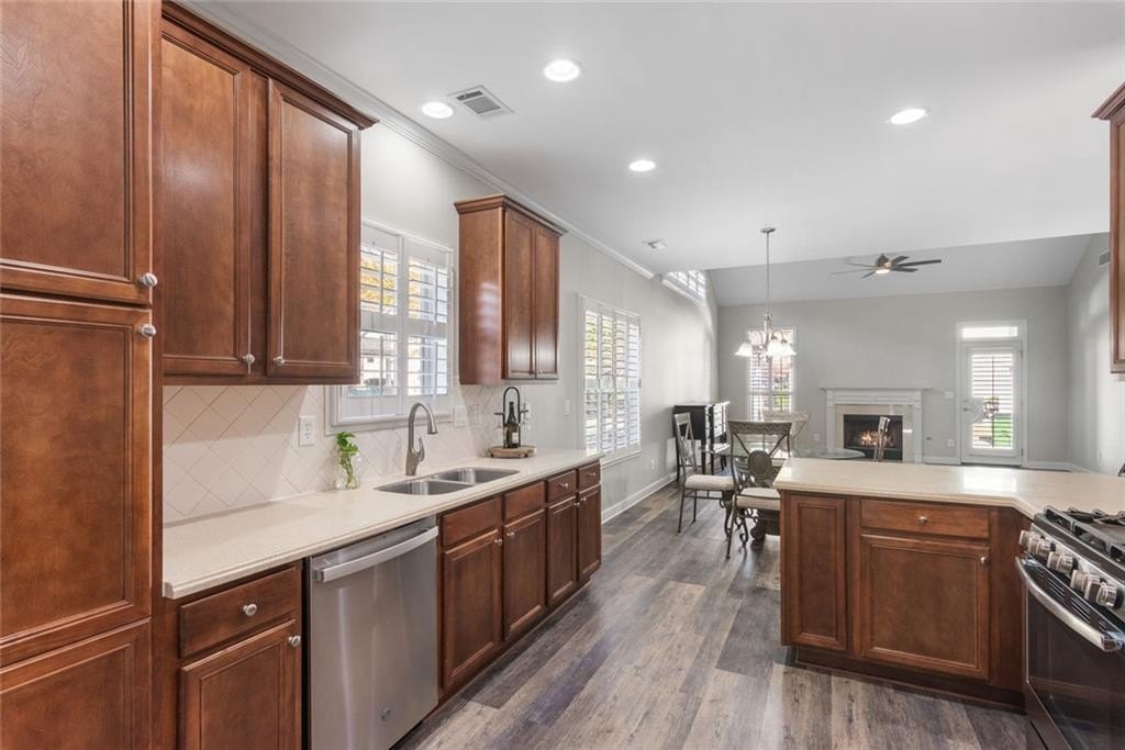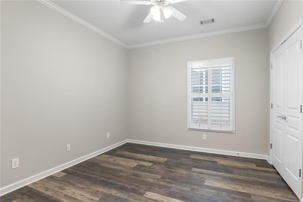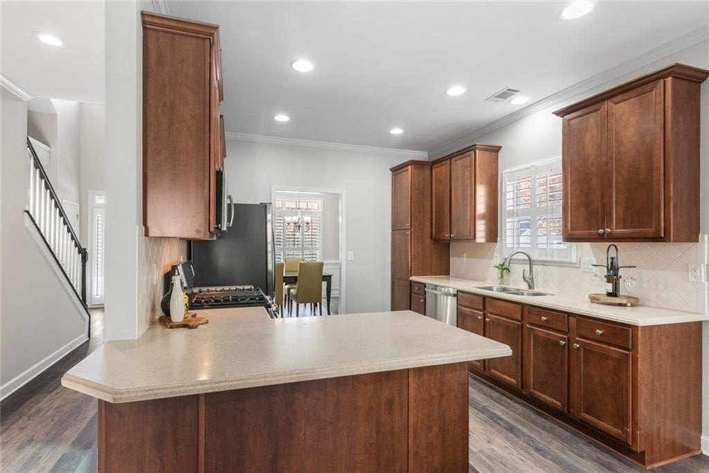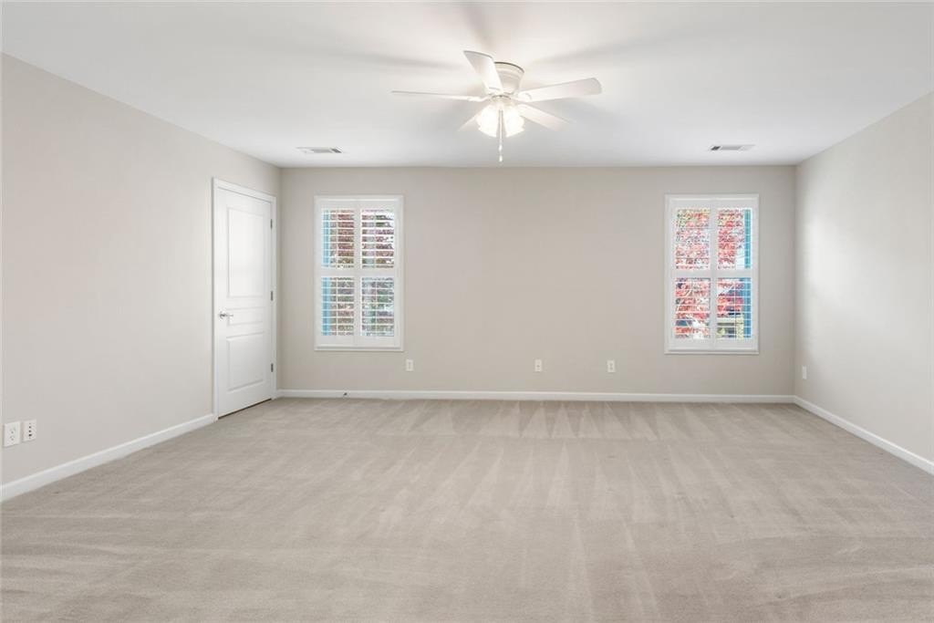 You'll fall in love with this incredibly charming home in pristine condition in the North Gwinnett school district. Hang out on the covered front porch and enjoy the quiet surroundings. Located in the popular Stonecypher neighborhood of Suwanee, it's an easy walk to Suwanee Town Center, parks, trails and shopping. This is one of the largest floor plans in the neighborhood and features a freshly painted exterior, plantation shutters throughout, newer LVP flooring on the main level and lots of extra storage. The family room offers plenty of space to gather, and is defined by its gas fireplace, high vaulted ceiling that amplifies the sense of volume and light, and crown molding that adds a touch of refined detail. The kitchen features stainless appliances, tile backsplash, and solid surface counters. A peninsula provides both workspace and casual dining while stained cabinetry brings a classic touch, and crown molding ties the space together with sophisticated detail. In addition to the kitchen pantry, there is another pantry in the hallway, as well as a separate coat closet. The dining room with paneled wainscoting and crown molding is perfect for more formal meals, while there's an additional, more casual eating area just off the kitchen. The primary bedroom provides a serene retreat, featuring a tray ceiling and crown molding that enhances the room's overall elegance. The en-suite bath features tile flooring, a garden tub, dual vanities, separate walk-in shower and a spacious closet. A laundry room, 2nd bedroom and another full bath round out the main level. Upstairs, there is a large bonus room/loft area that can be used as a 2nd living room, rec room or whatever fits your needs. There is also a very spacious bedroom and a 3rd full bath. In addition to the closet in the bedroom, there are 2 additional large closets, one of which is a finished part of the attic. In addition, the attic area above the 2 car garage has been completely floored and is perfect for a lot more storage space. The back patio has a partial privacy fence. That area can be enclosed (with HOA approval) if a buyer chooses to do so. Washer, dryer and refrigerator stay with the property. Enjoy viewing this lovely home.