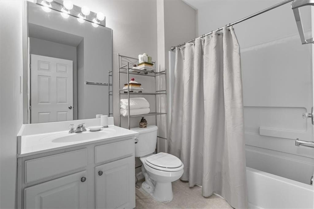 The spacious living/dining area features a cozy fireplace and opens to the deck with peaceful backyard views. Upstairs, the split bedroom design includes two bedrooms, each with its own private bath. A laundry area and linen closets sit conveniently between them.