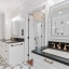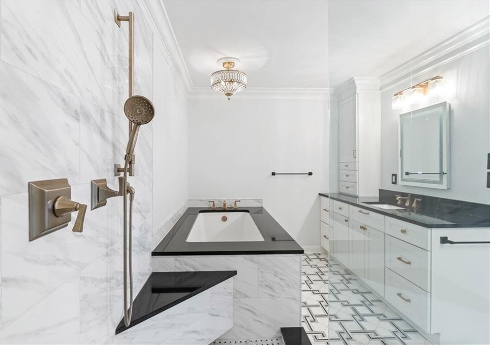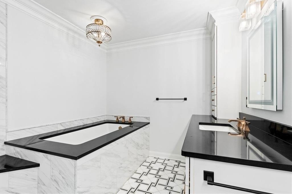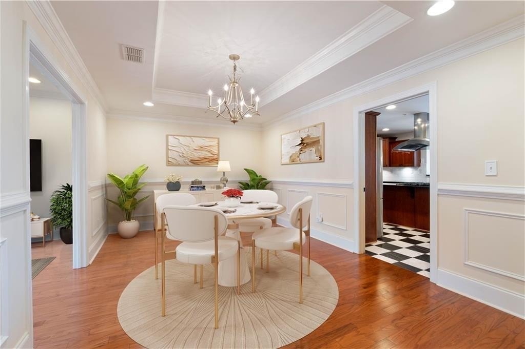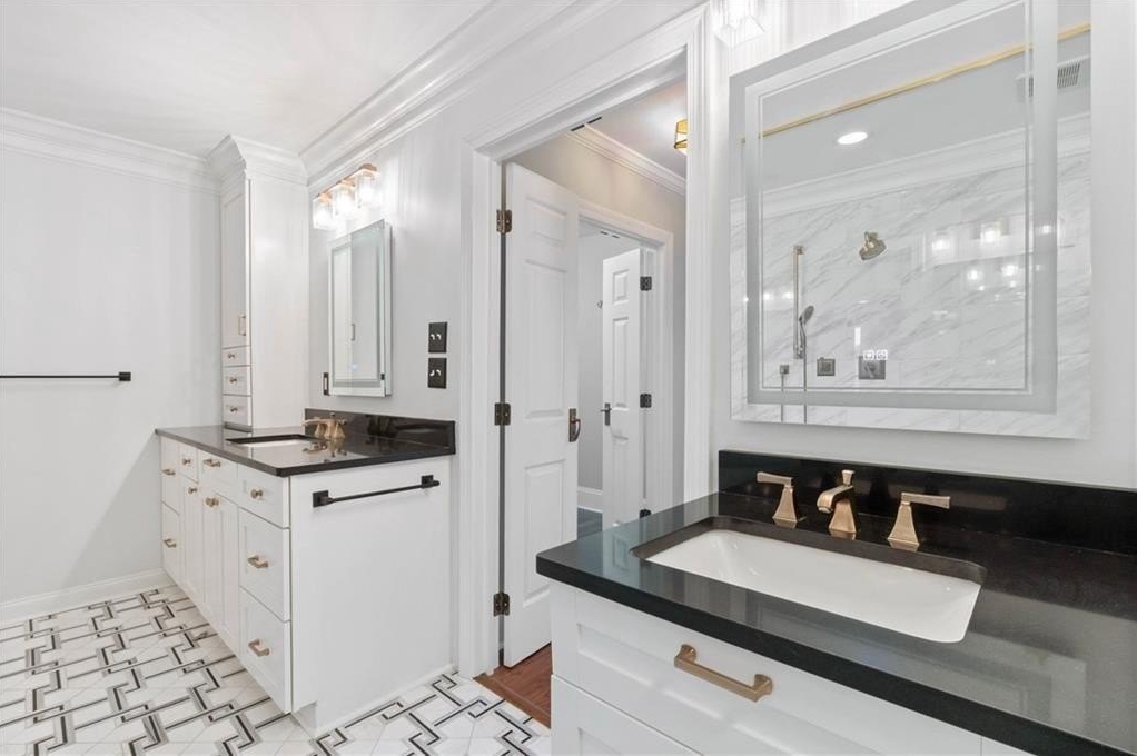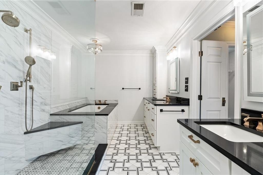 The upgraded kitchen features dual pantries, an extended island, gas range, double ovens, a built-in warming drawer with a bread-proofing setting, GE Profile refrigerator with craft ice, new tile flooring, and an instant hot water faucet. Adjacent to the kitchen, a separate formal dining room easily accommodates 10 to 12 guests, ideal for hosting holidays or dinner parties.