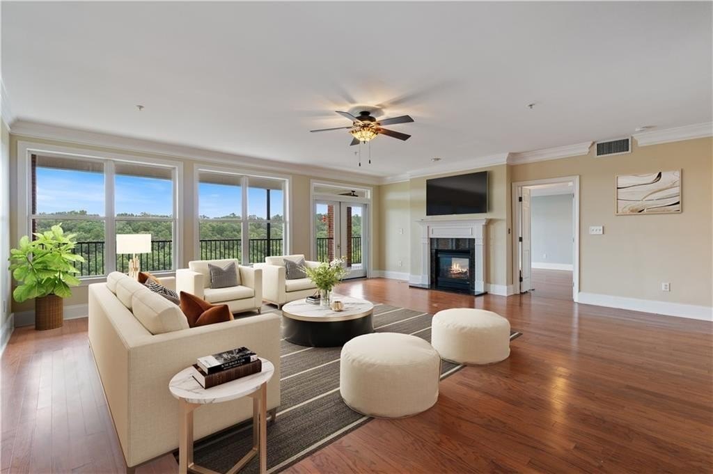 Experience 2,400 square feet of light-filled, single-level living that must be seen to be fully appreciated. With elevator access directly from two reserved garage spaces, this third-floor residence combines the peace of nature with the convenience of Historic Roswell living. Perched above Vickery Creek and the Chattahoochee National Forest, its year-round view is forever protected; nothing can ever be built to block it.