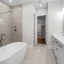 A three-level elevator provides effortless access to every floor—from the main level owner’s suite to the terrace entertainment level. The primary suite is a private retreat featuring direct access to a screened porch overlooking the trees and stream, while the spa-inspired bath showcases a freestanding soaking tub, frameless glass shower, and dual vanities.