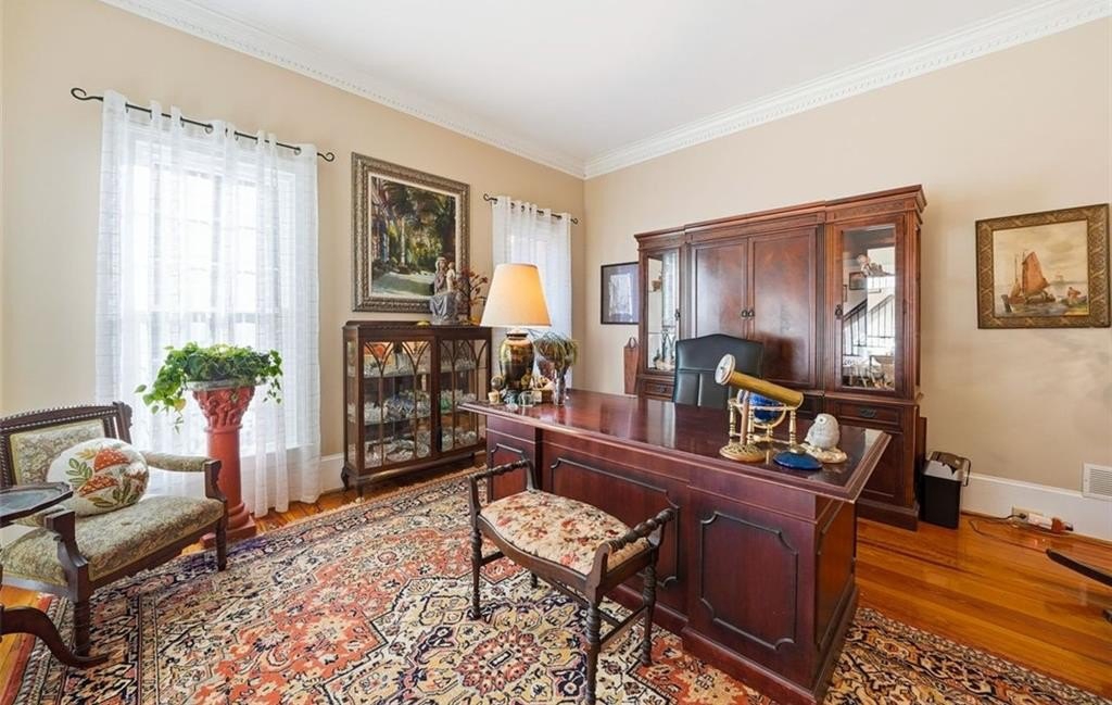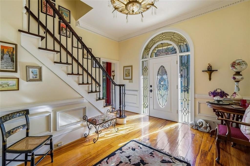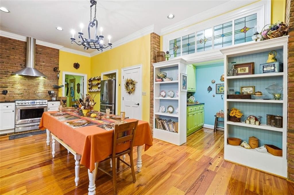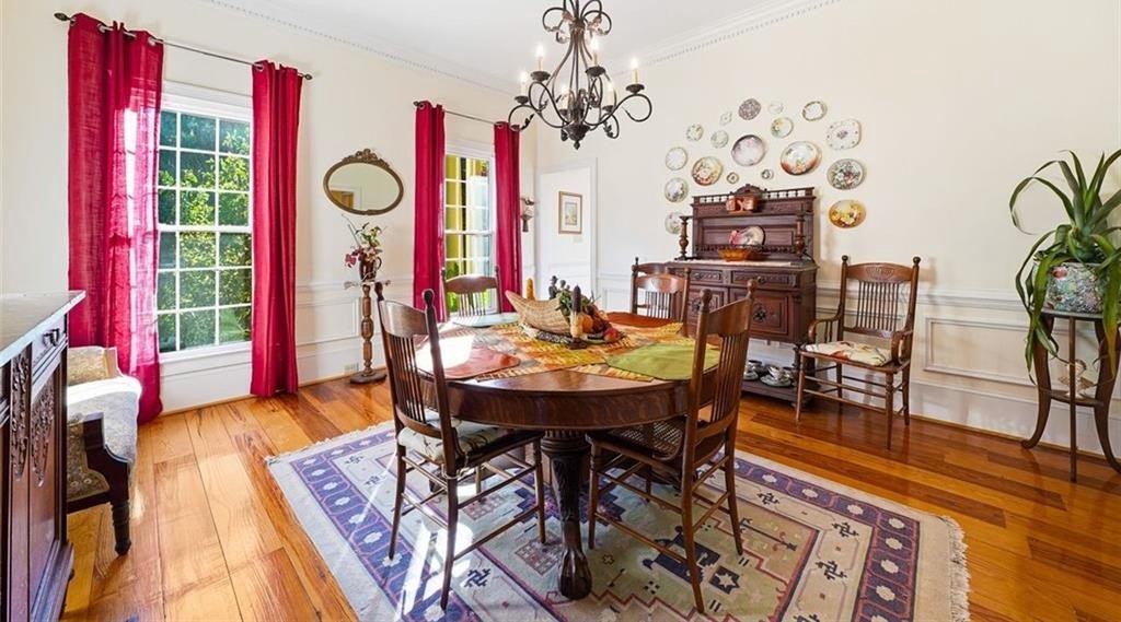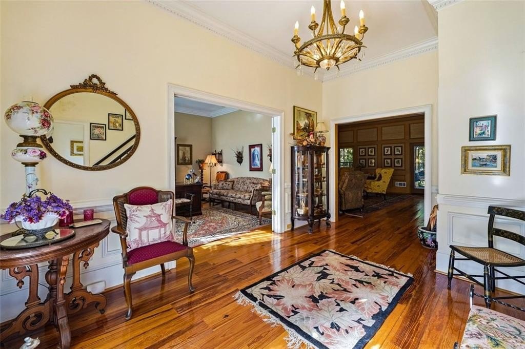 Step through the elegant stained-glass front door into a bright, inviting foyer highlighted by crown molding and rare Heart of Pine flooring throughout the main level. A flexible multi-purpose room—ideal as an office, music room, or playroom—sits opposite a formal dining room, both flanking the entryway.