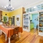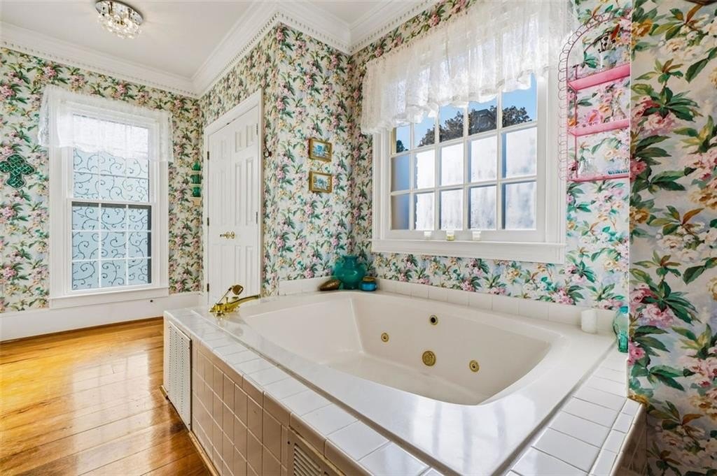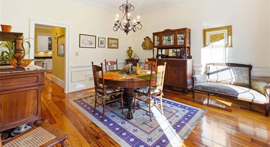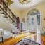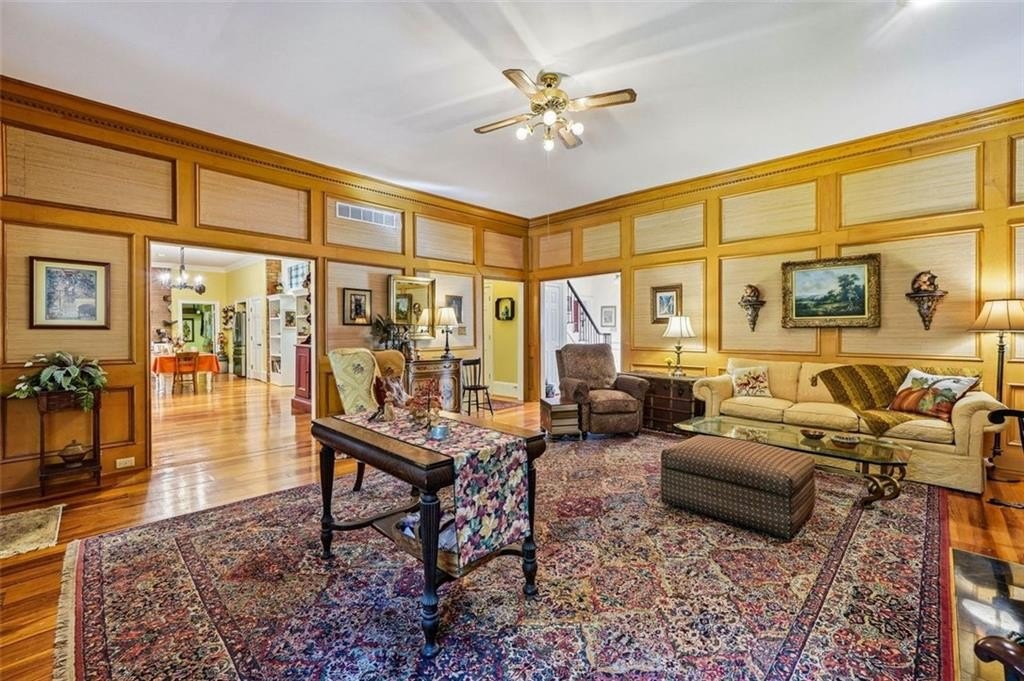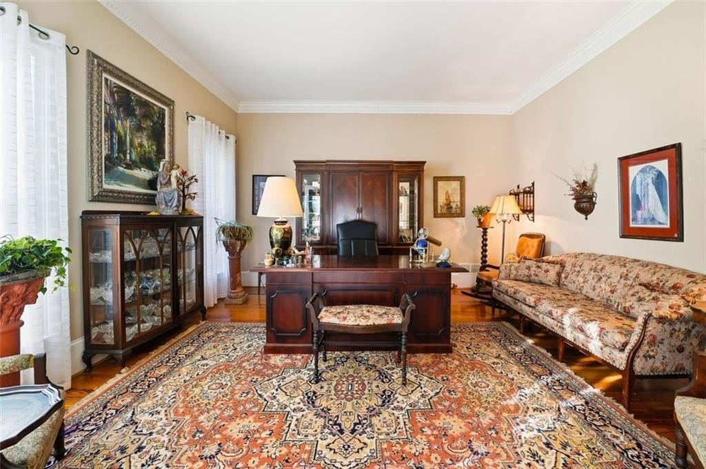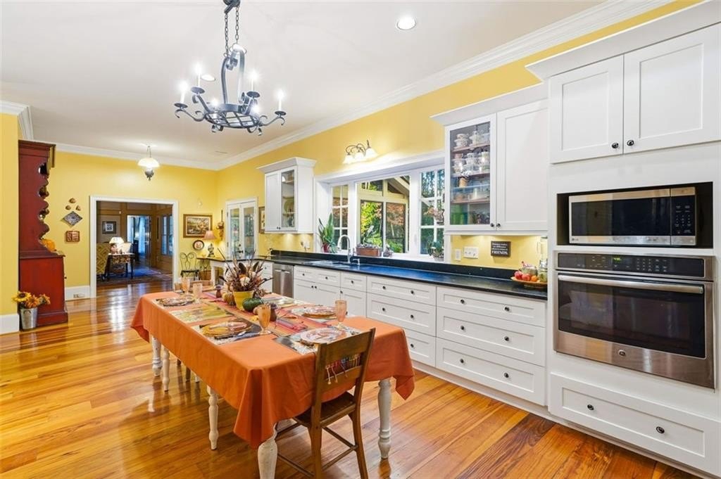 Step through the elegant stained-glass front door into a bright, inviting foyer highlighted by crown molding and rare Heart of Pine flooring throughout the main level. A flexible multi-purpose room—ideal as an office, music room, or playroom—sits opposite a formal dining room, both flanking the entryway.