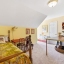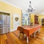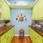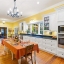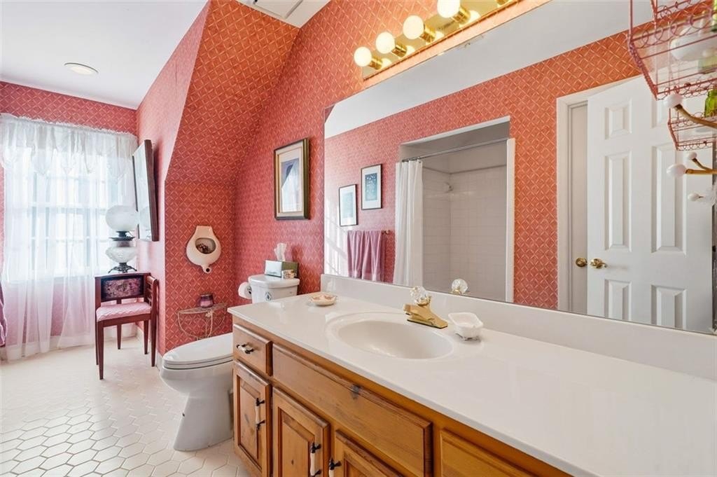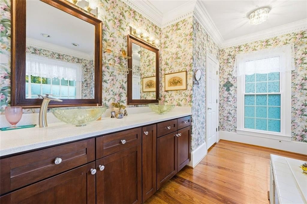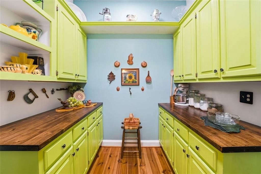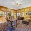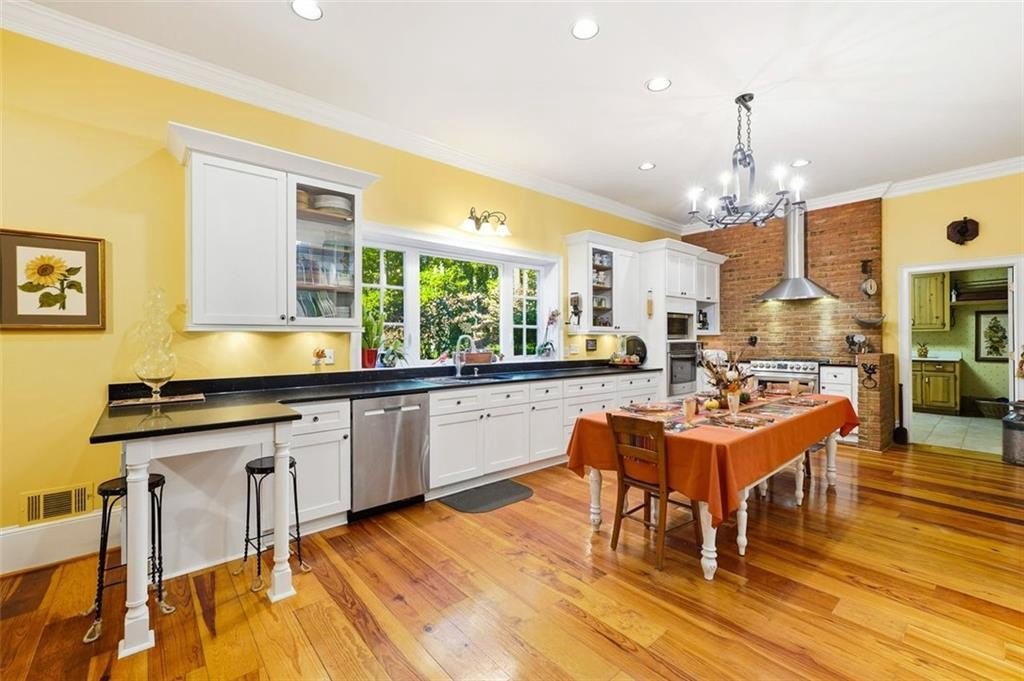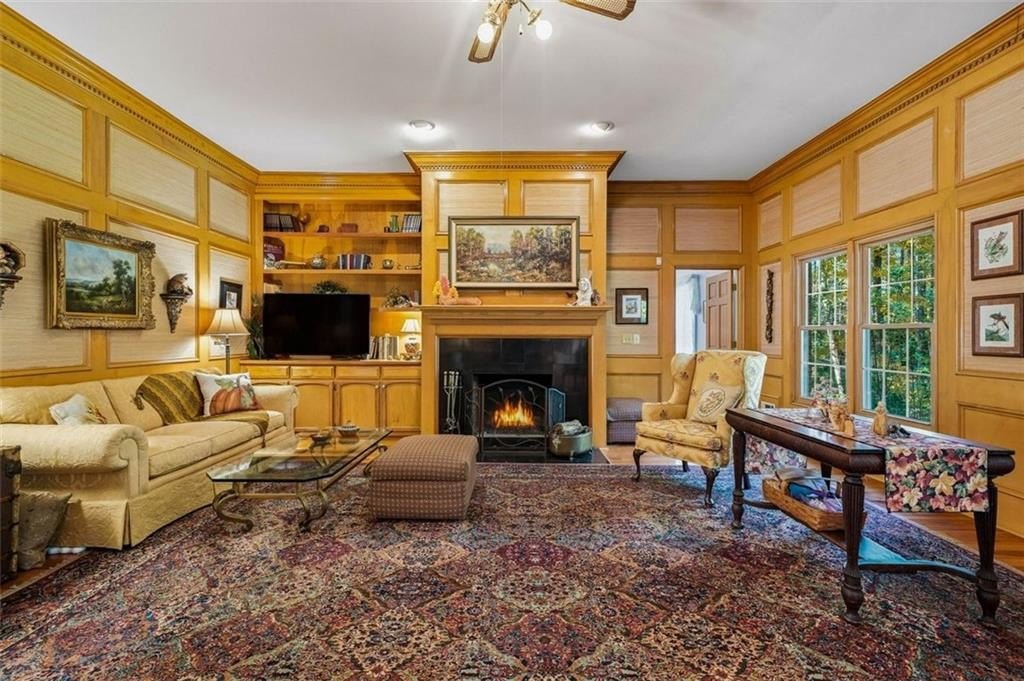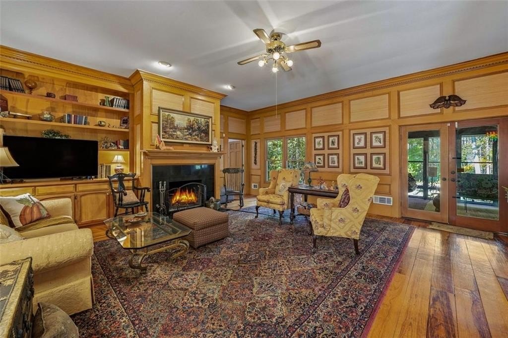 The spacious family room features classic Bishop paneling, built-in cabinetry and bookcases, and a cozy fireplace. The remodeled kitchen is a chef’s dream, with custom cabinetry, extensive countertops, a gas range plus an additional wall oven, and large windows framing beautiful backyard views. An antique stained-glass transom and built-in display shelves mark the entrance to the expansive walk-in pantry and beverage area—perfect for entertaining.