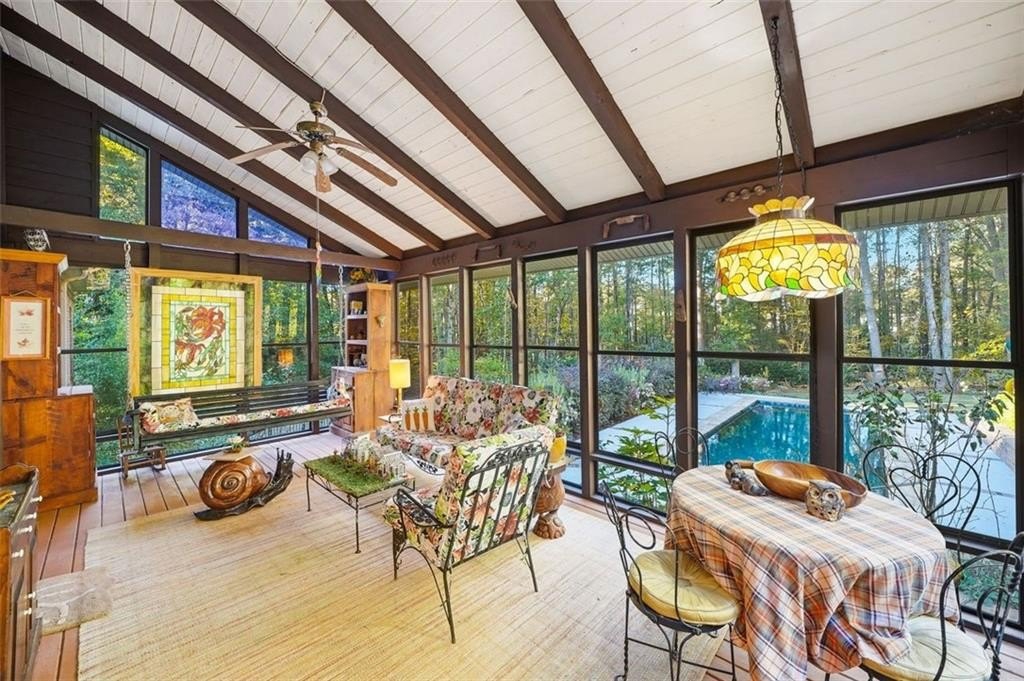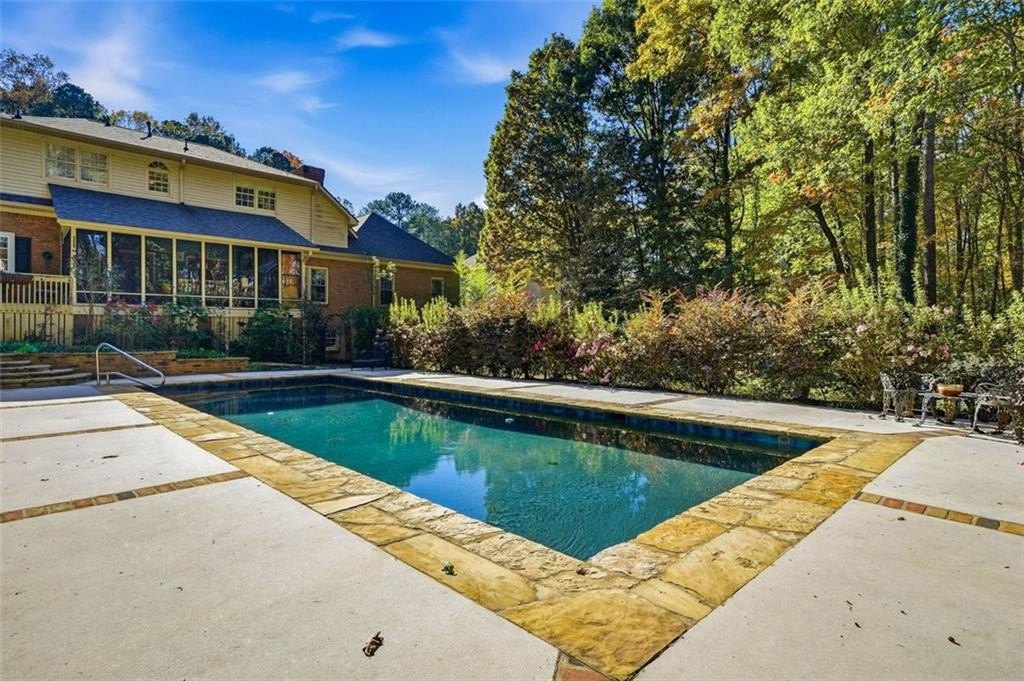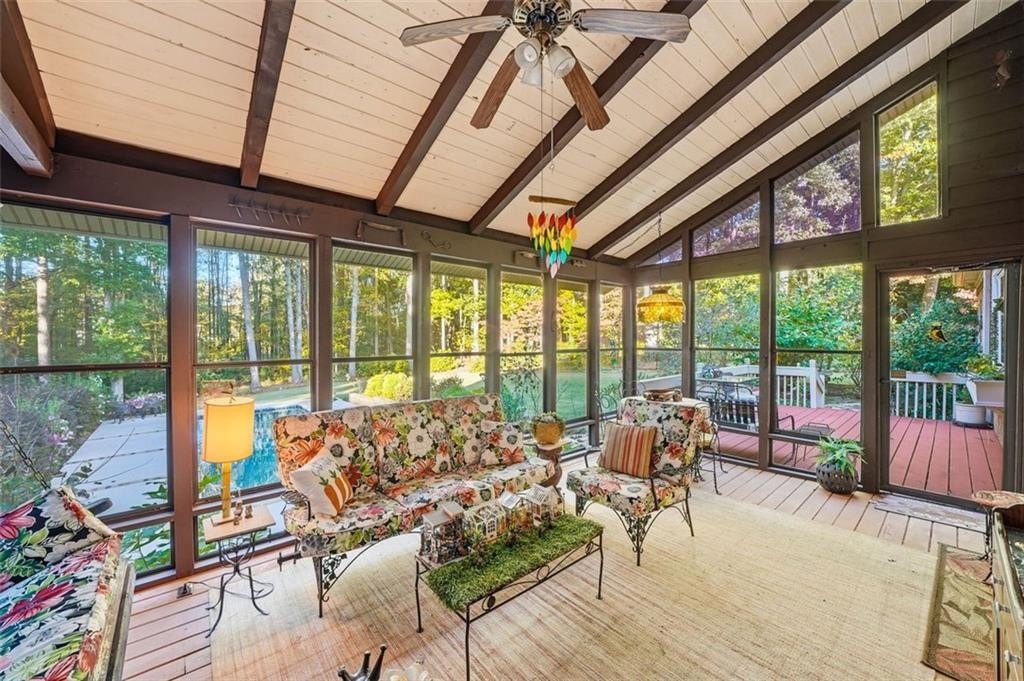 Outdoor living is the star of this home. French doors from the family room open to an all-season sunroom and deck overlooking the Pebble Tec heated saltwater pool, edged in flagstone, with lighting and an outdoor hot-water shower. The private, fenced backyard includes a fire pit area, raised garden beds, and low-maintenance landscaping—perfect for entertaining or quiet relaxation.