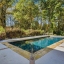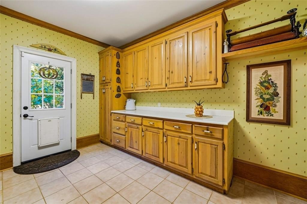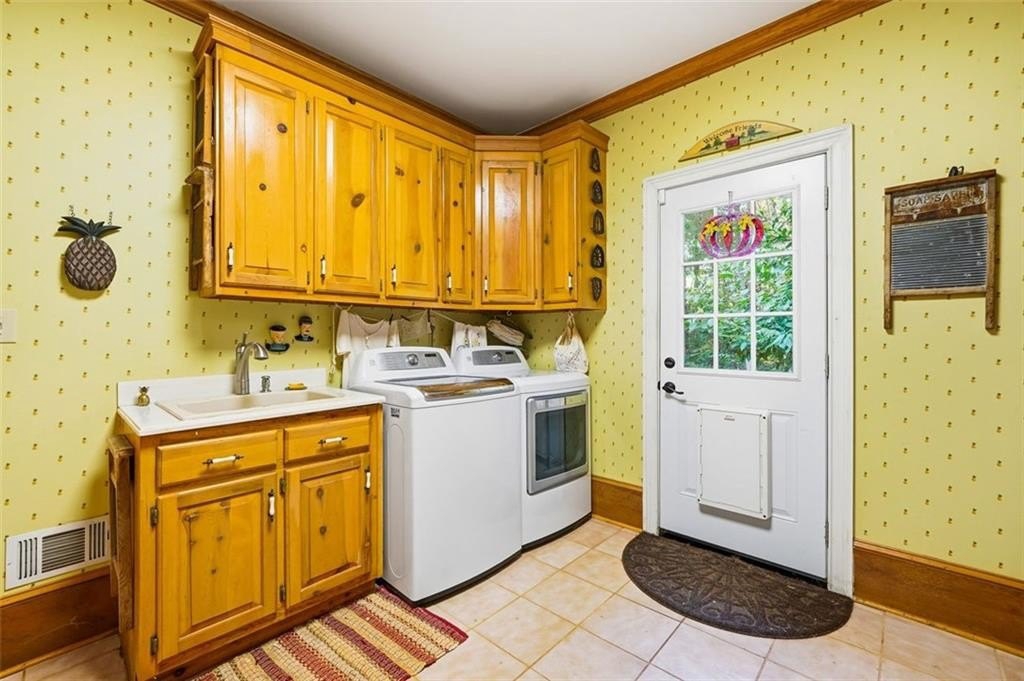 A generously sized laundry/mudroom includes a utility sink, ample cabinetry, and countertop workspace, with direct access to the pool and backyard.