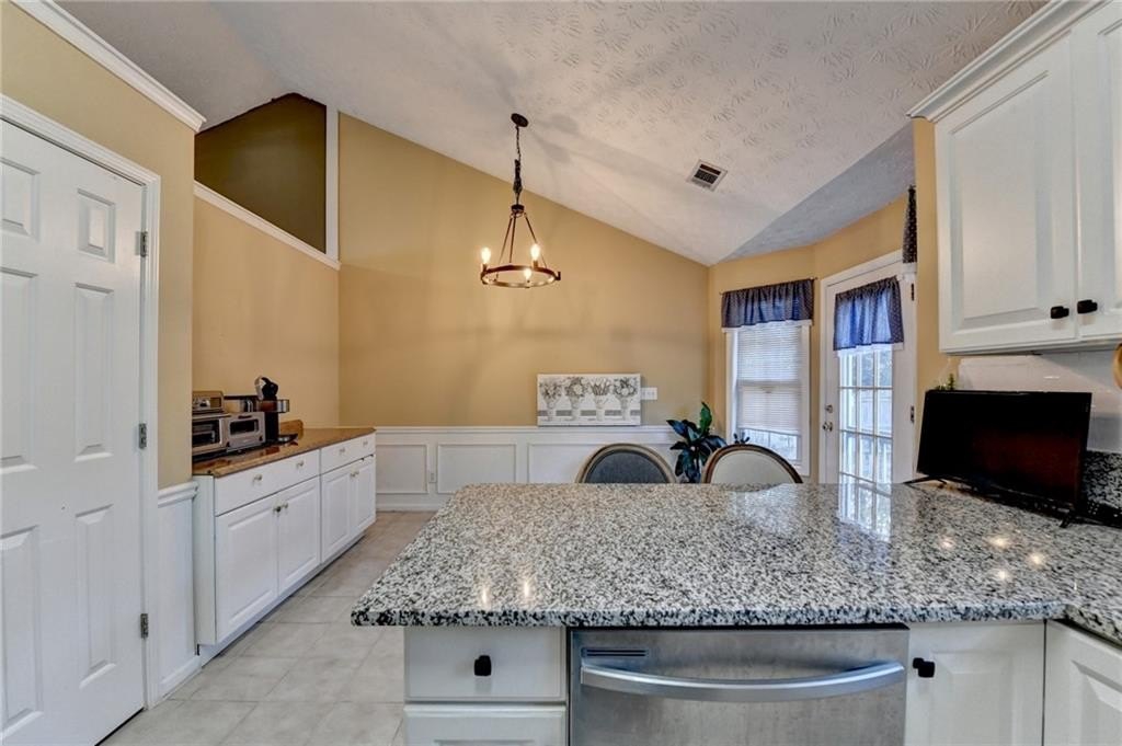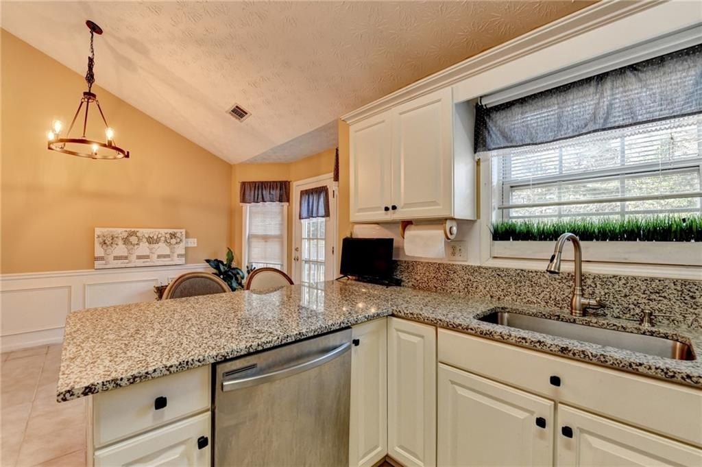 The main level features an open-concept floor plan with a spacious family room and dining area that flow into the bright kitchen. The white kitchen cabinets, granite countertops, and recently updated stainless-steel appliances create a clean, modern feel. Large windows fill the home with natural light throughout the day.