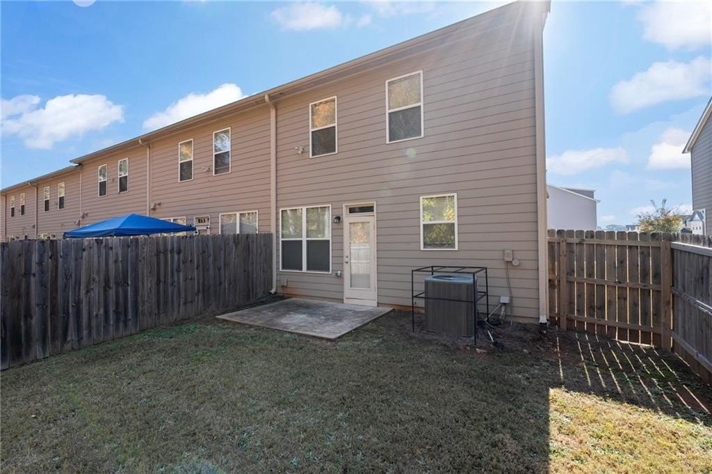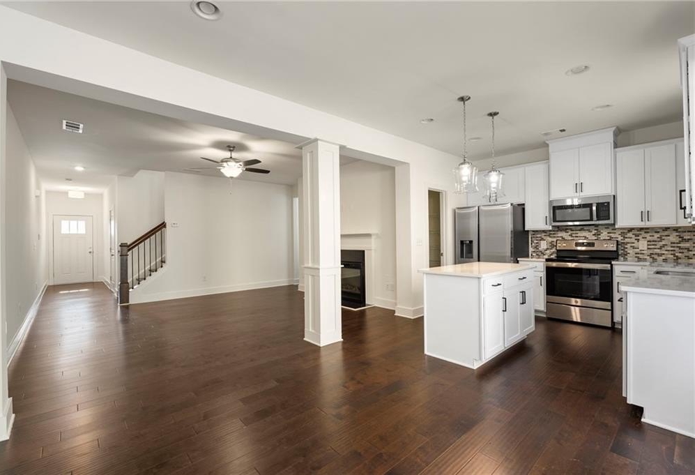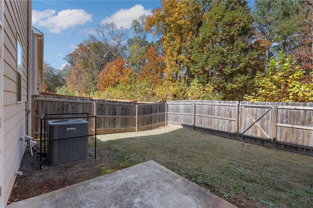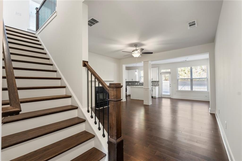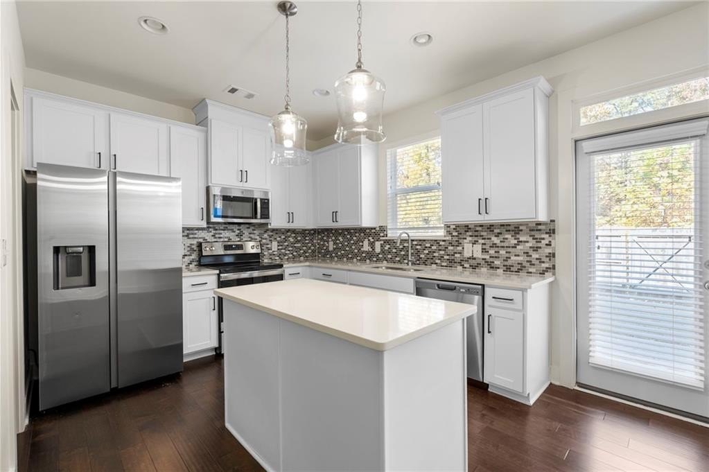 Welcome to this beautifully appointed, move-in ready END-UNIT townhome featuring designer touches and a bright, open layout. One of the most spacious lots in the neighborhood, this 3-bedroom, 2.5-bath residence has been freshly painted and professionally staged to showcase its modern aesthetic and inviting flow. The main level offers an open-concept living area with gleaming hardwood floors and a sleek kitchen complete with quartz countertops, crisp white cabinetry, stainless steel appliances (including a side-by-side refrigerator), and ample counter space. Upstairs, a large hardwood loft provides a versatile flex area, ideal for a second living room, home office, or playroom. The luxurious primary suite includes a walk-in closet, dual vanity, and a separate soaking tub and shower. Two additional spacious bedrooms and a full bath complete the upper level. Additional highlights include a 2-car garage plus driveway parking for two more vehicles, and a fully fenced backyard perfect for pets or outdoor entertaining. Located in a well-kept newer community in Lithonia, just minutes from I-20, Covington Highway, shopping, and grocery stores. Lawn care is included through the HOA for easy living.